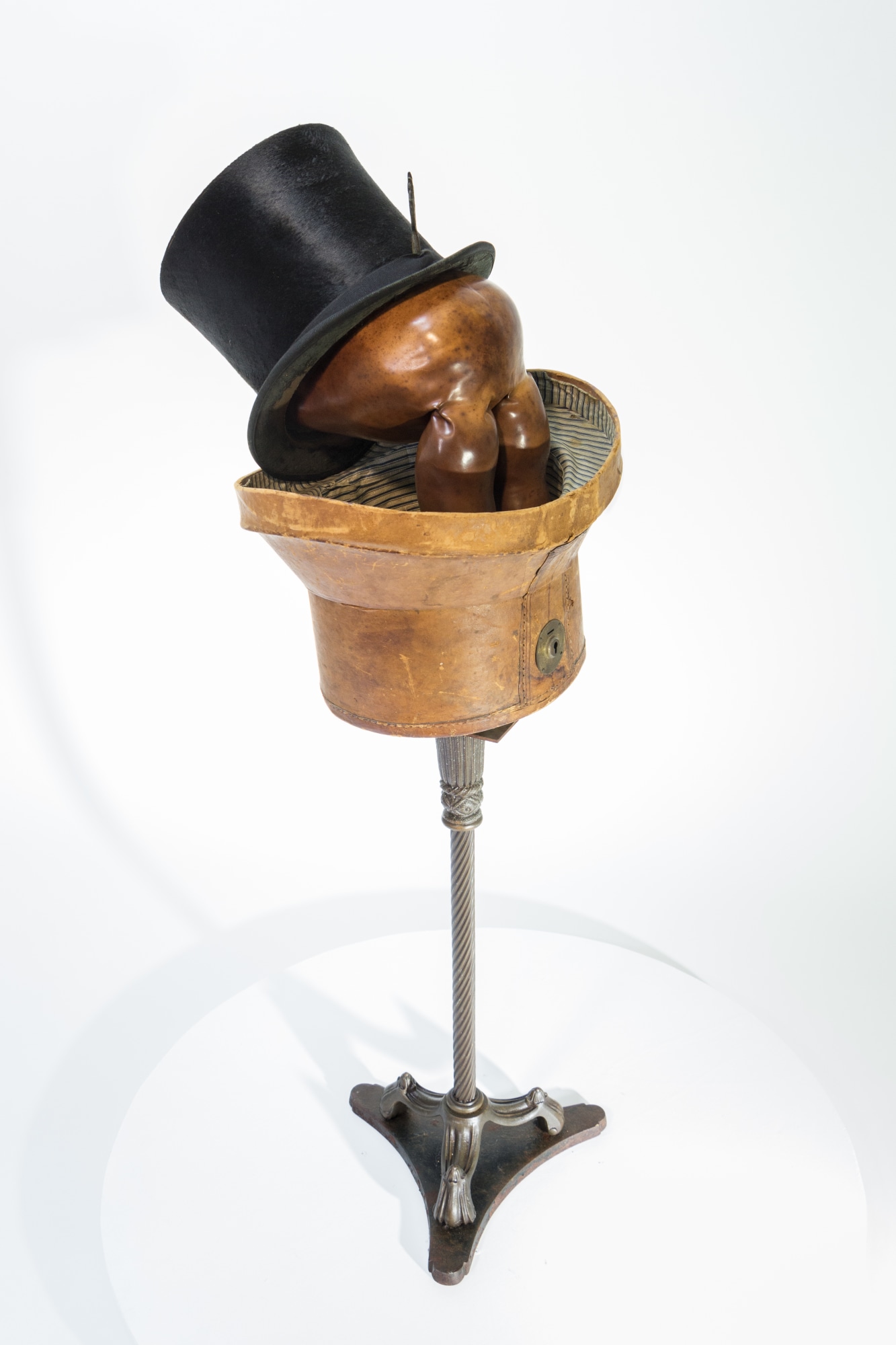 baby doll assemblage, vintage hatbox and tophat, lamp base, skewer