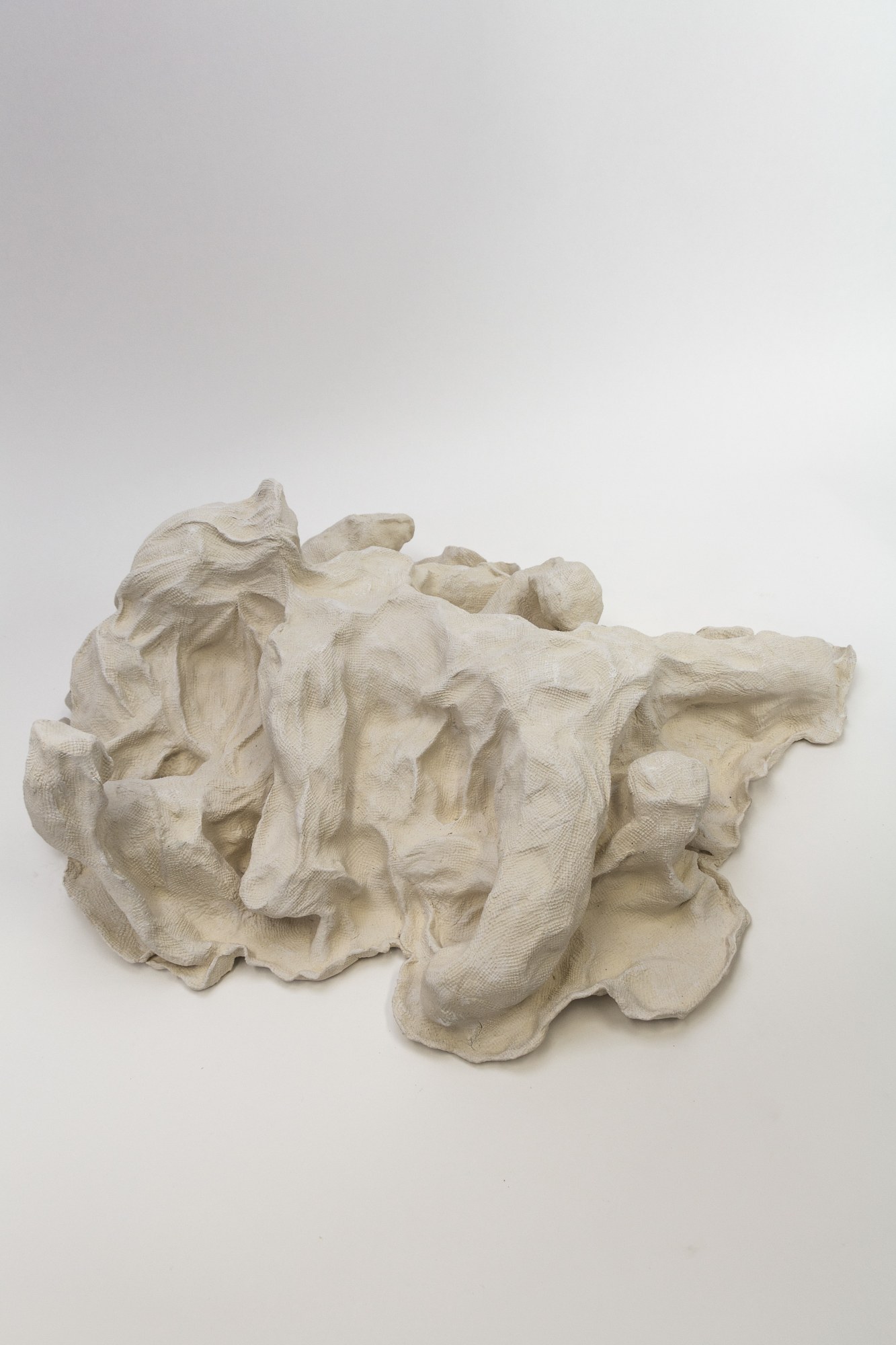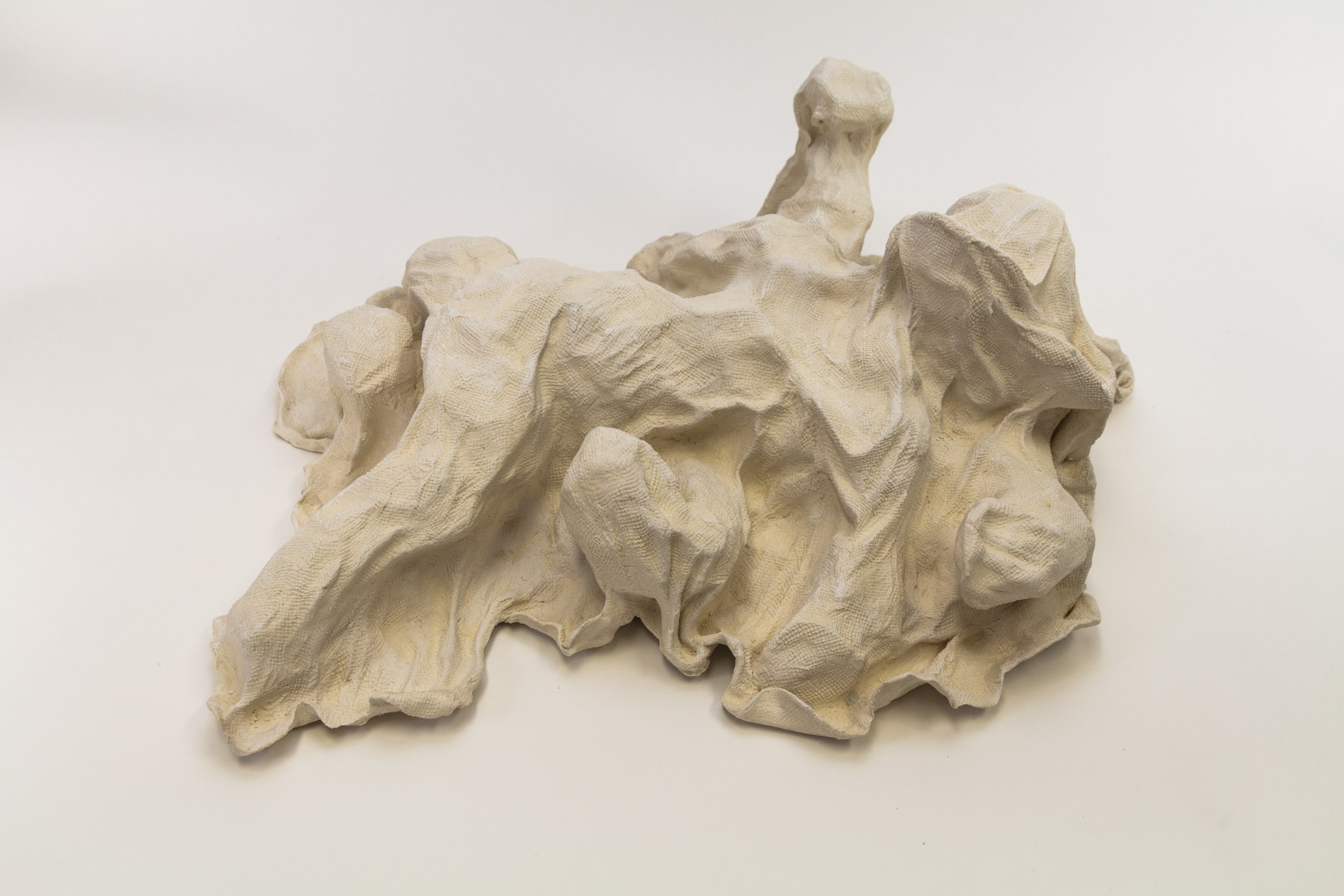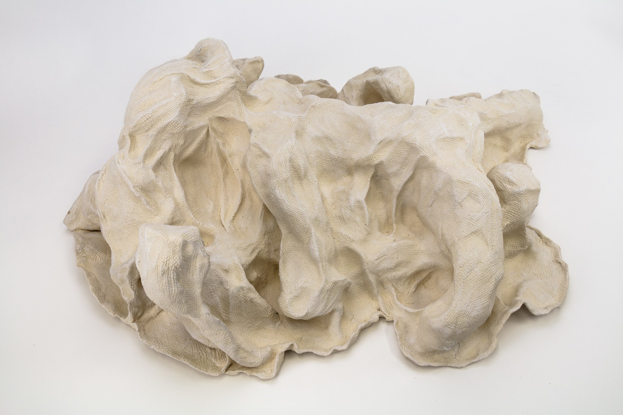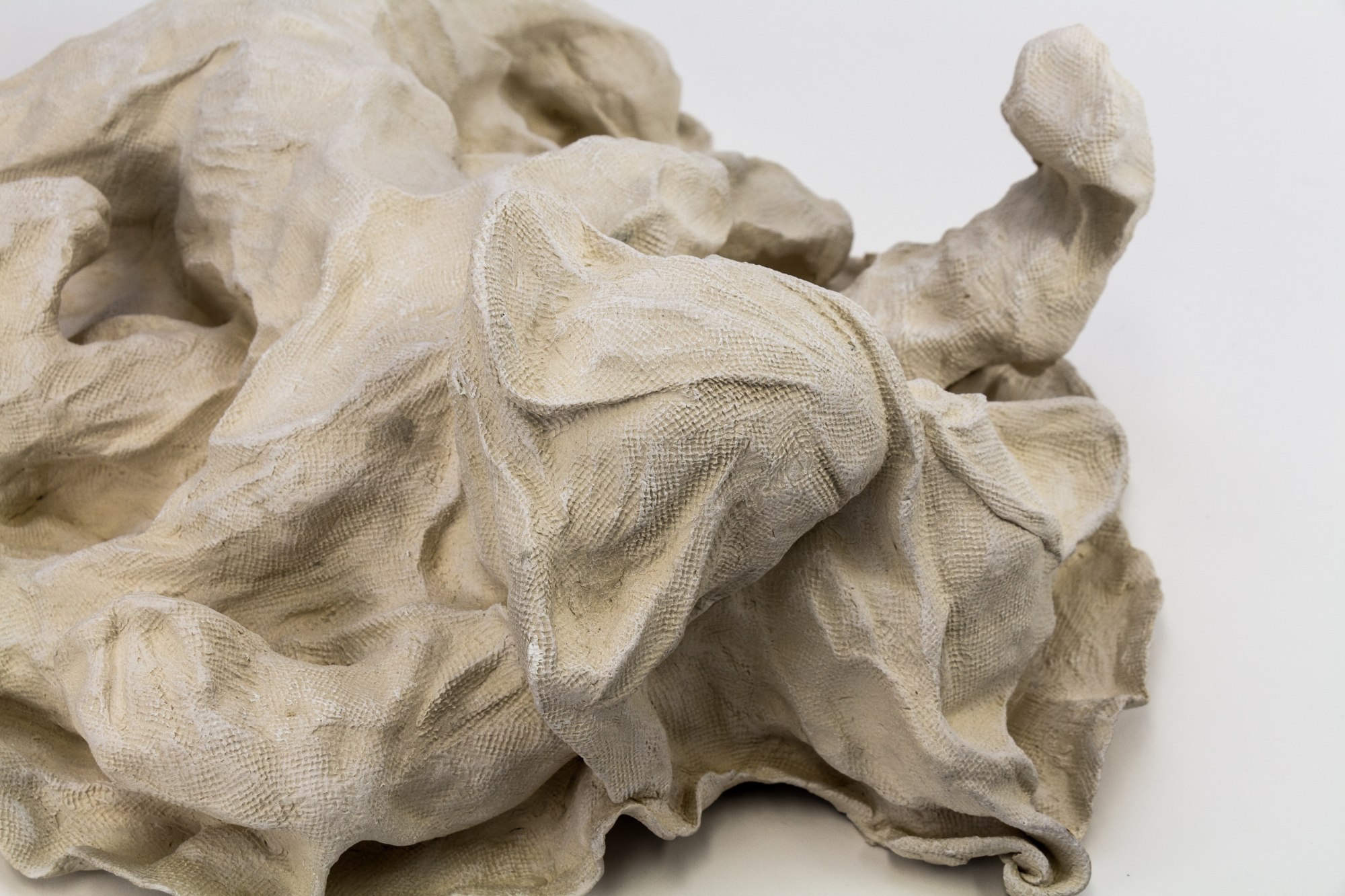 A faux ceramic blanket envelopes the protruding figures of two rolling, playful toy bears in 'Bare Under There,’ by artist Gina M. The innocence of the toy bear form along with the soft texture of the covering blanket perpetuates the illusion of safety and vulnerability. Upon closer inspection the bears are more intimate, engaging in a kiss of sorts, interrupted only by the folds of fabric between them.
