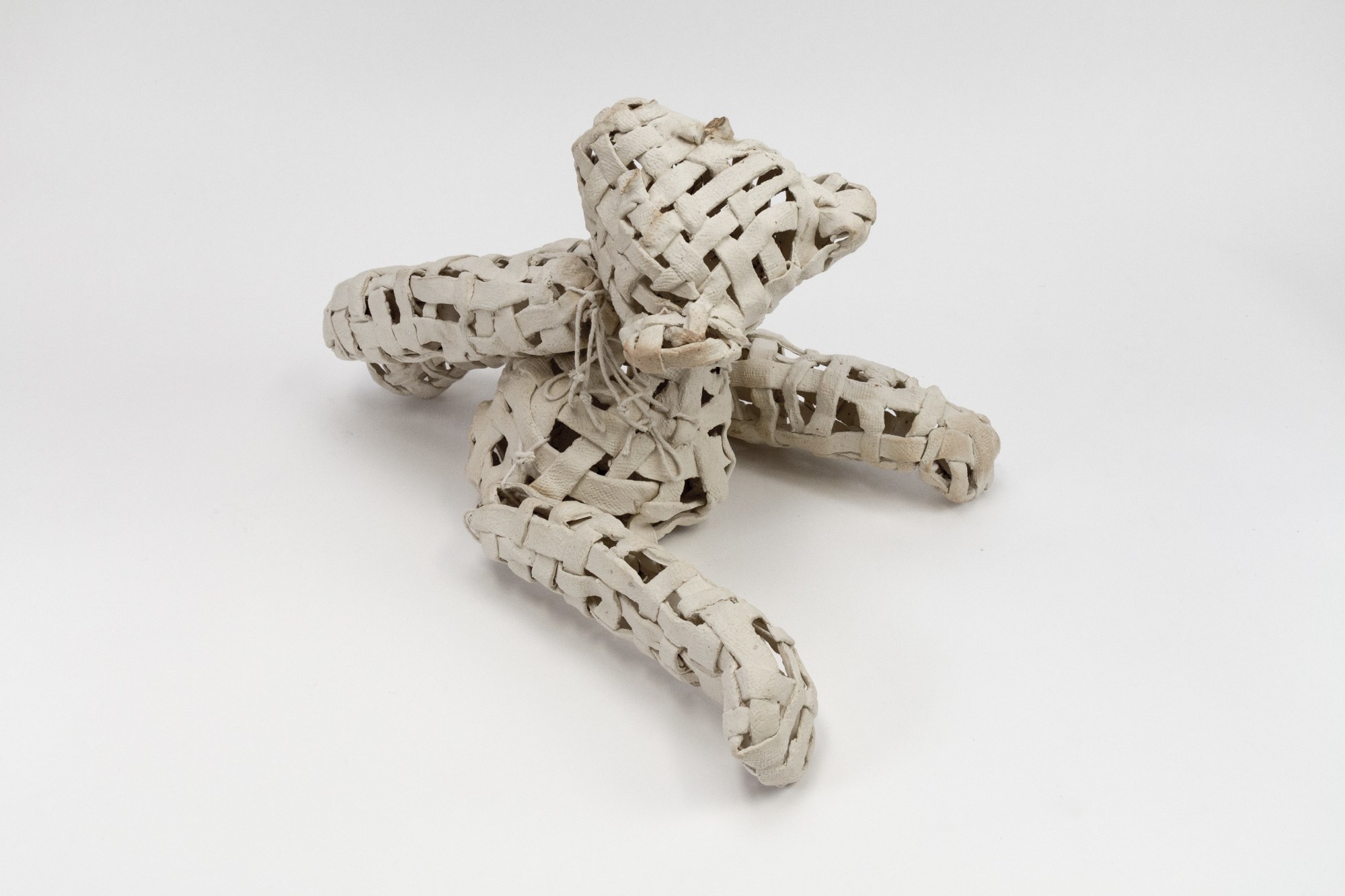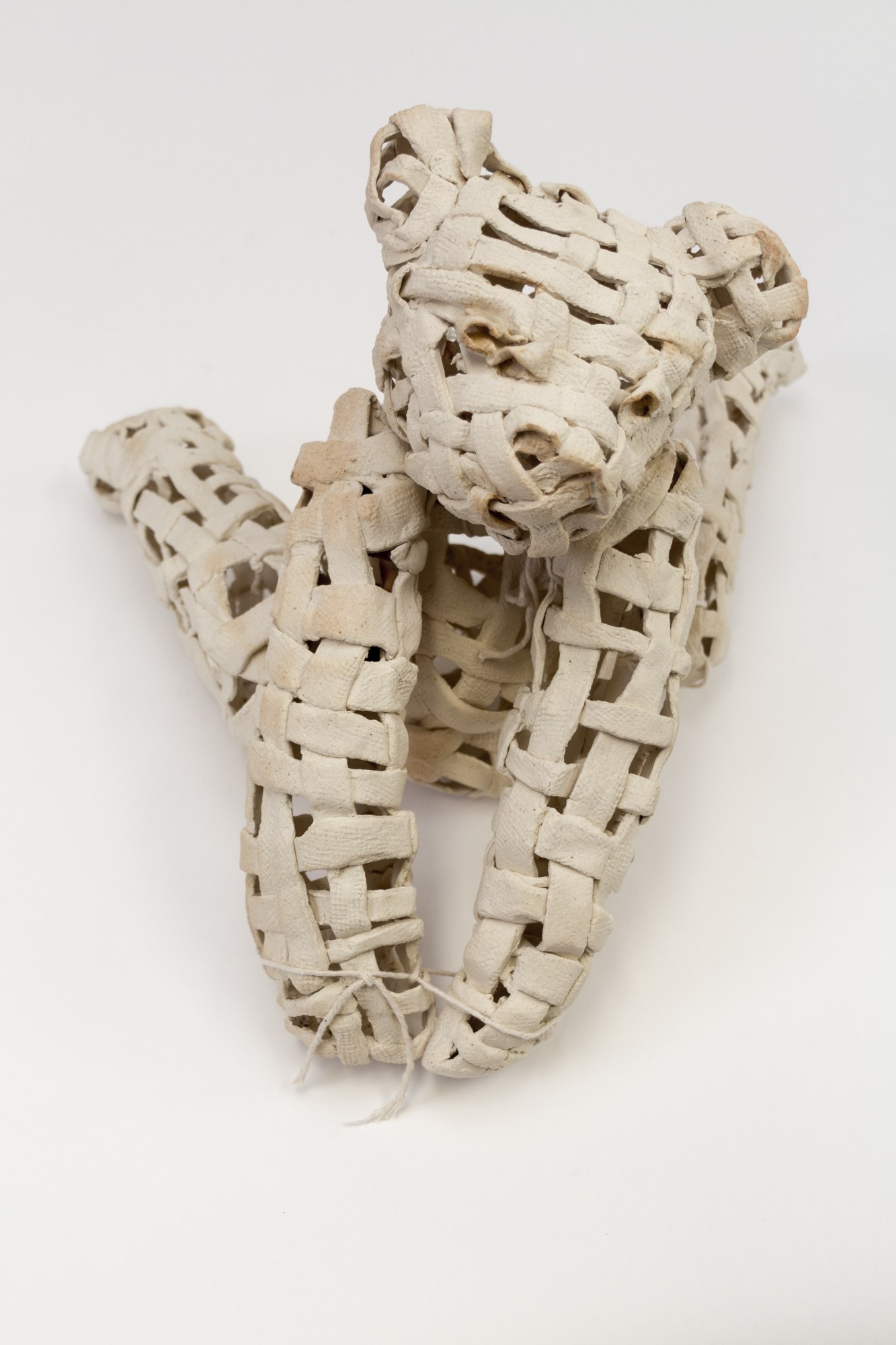 An expressive emotional study of a passionate addiction, the ceramic toy bear sculpture ‘Basket Case,’ by Gina M. is a fragile, hollow, empty frame, knotted, bound and contorted in a longing pose with a face of melancholy and distress. Air and light pass through her basket weave skin.