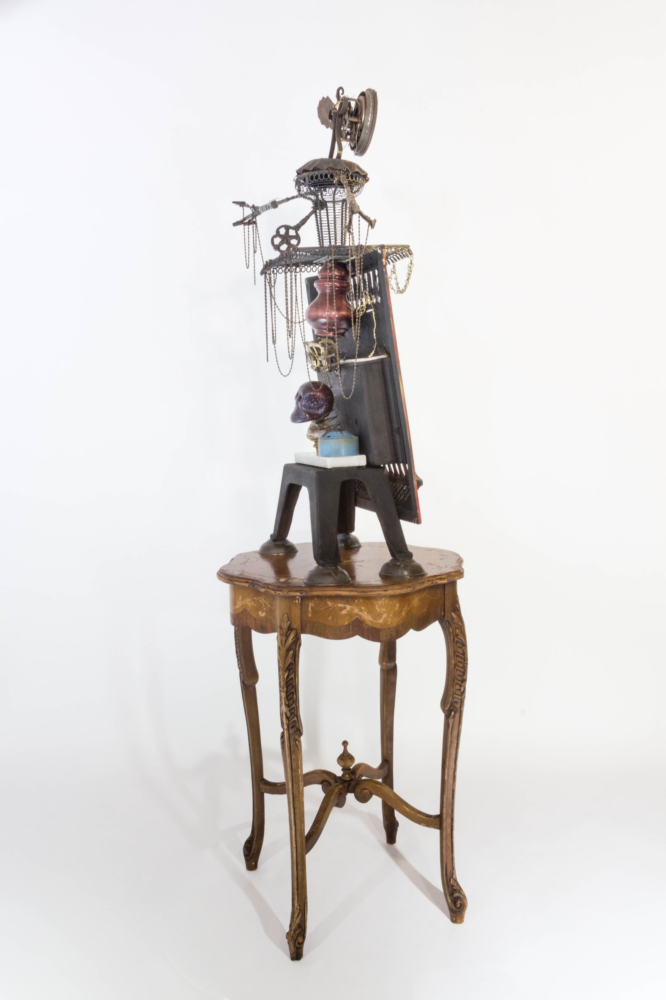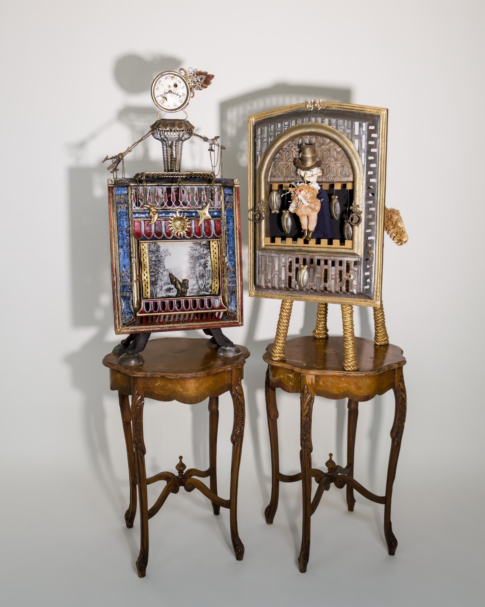 Matching found side tables, vintage heater grills, bronze bits, rope, book pages, chain, ceramic, clock parts, wood, acrylic metallic paint.