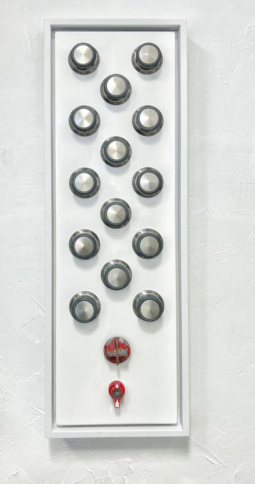 In this wall-mounted piece, I use repurposed oven knobs on appliance lacquer to highlight climate change. By mixing everyday objects with familiar surfaces, I’m exploring how we’re contributing to environmental issues. Framed in white wood, this artwork encourages you to reflect on our role in shaping the climate’s future, blending homey vibes with big global concerns.