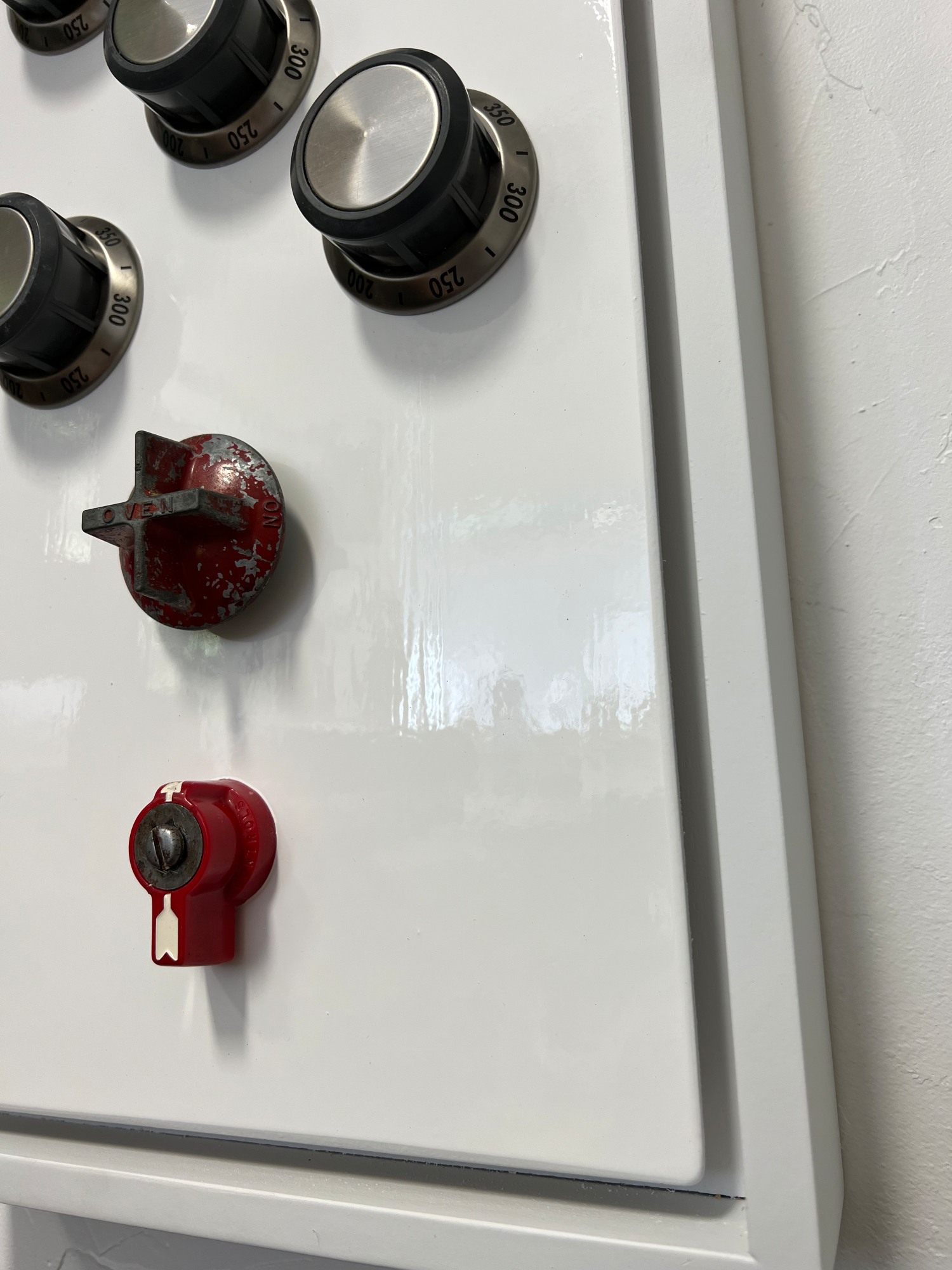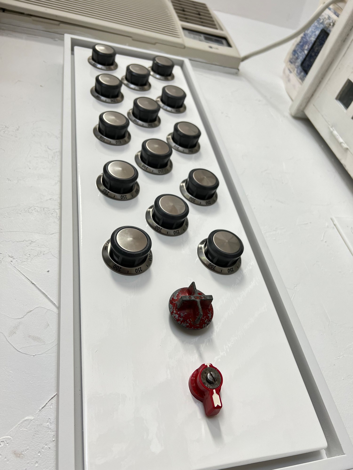 Repurposed oven knobs, appliance lacquer paint, wood frame