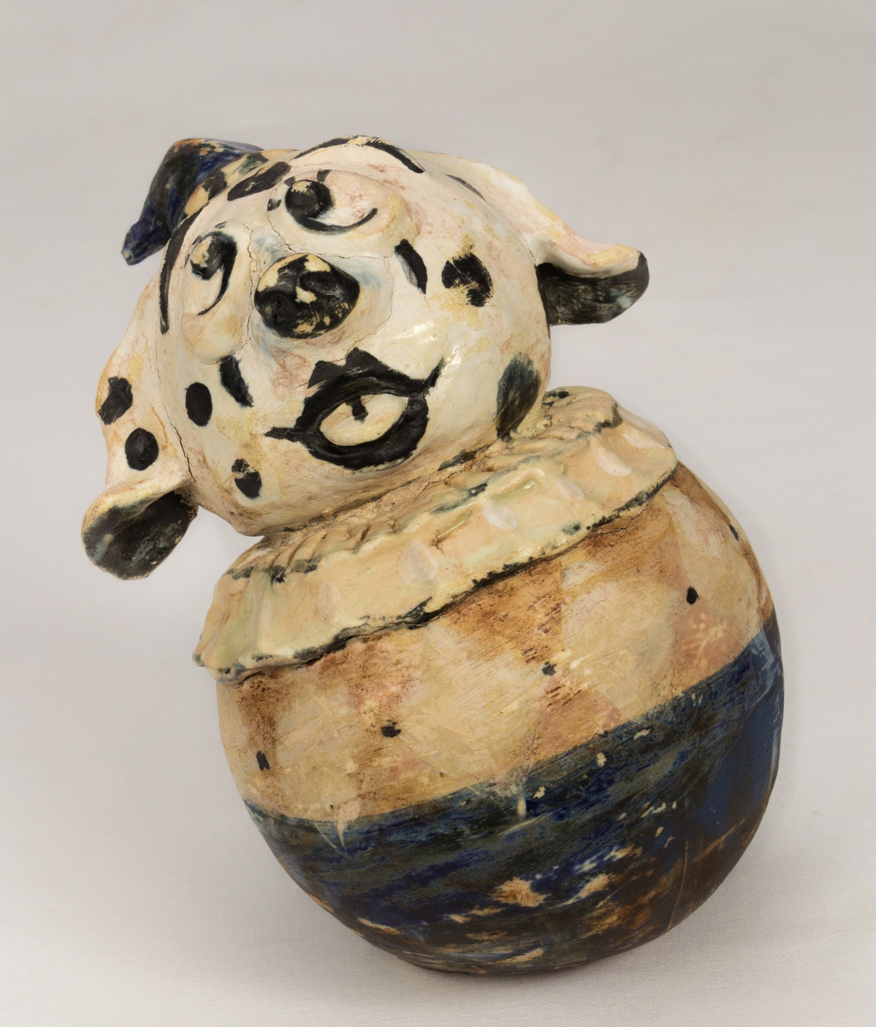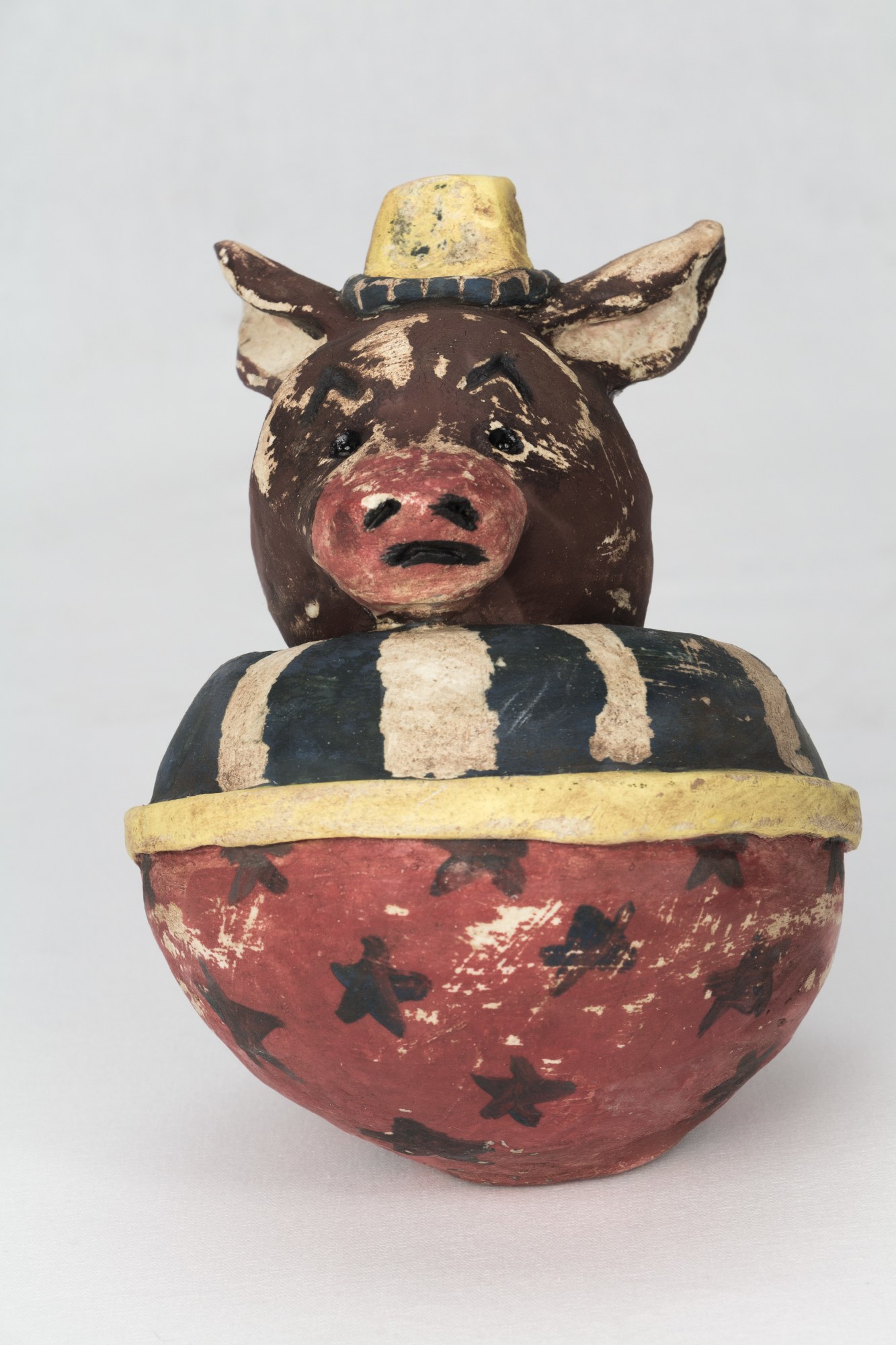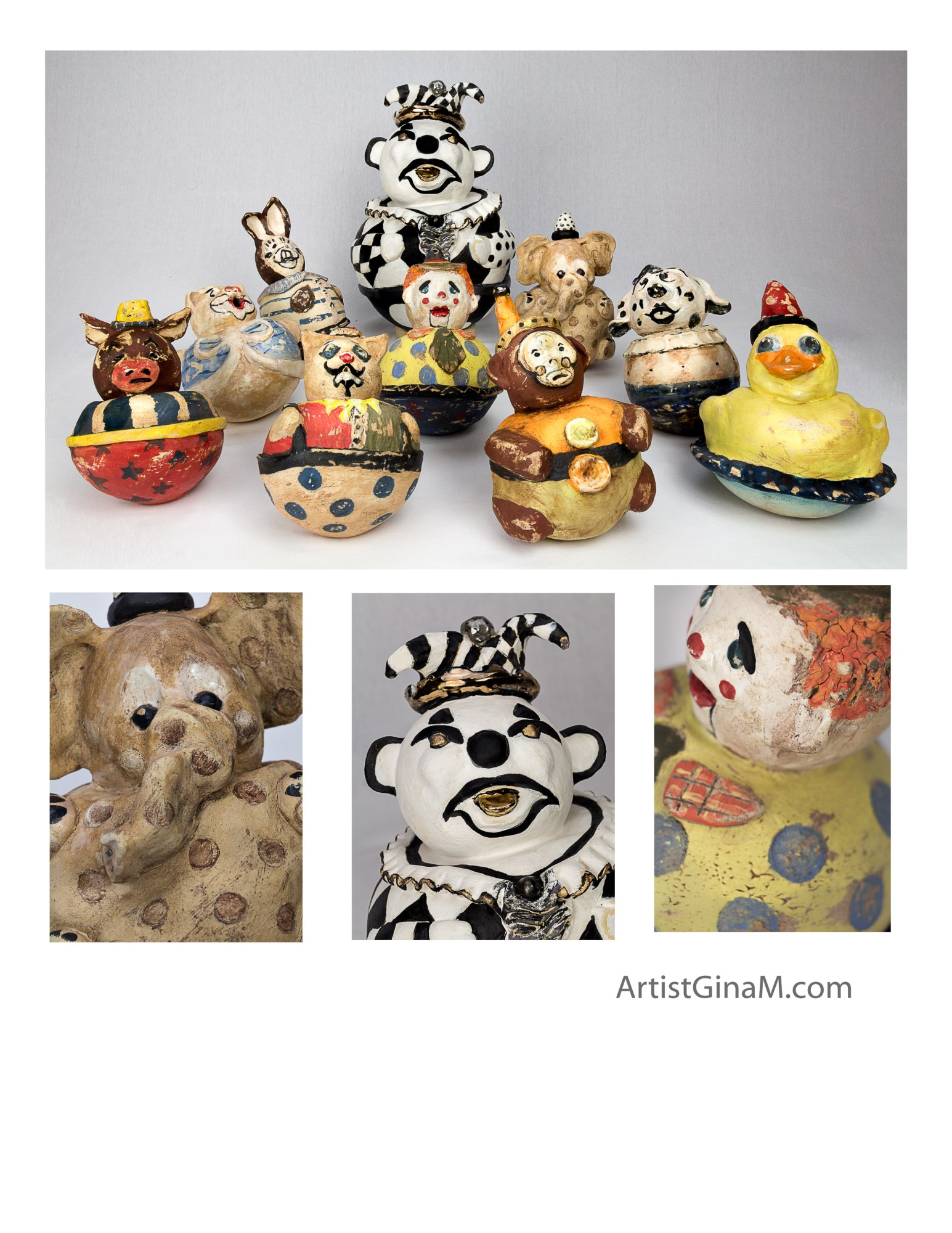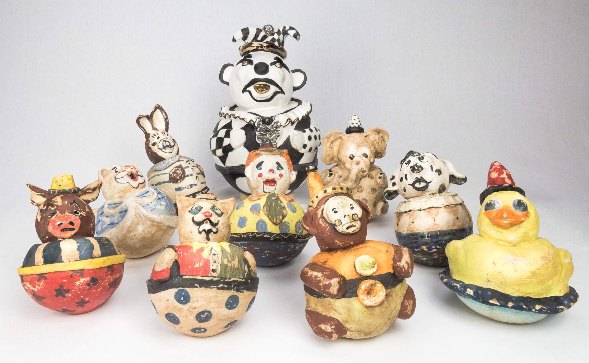 Follow The Leader, a high-fired ceramic and encaustic sculpture of nine small, faded, vintage, roly-poly toy clowns parading after a larger gilded hypnotic pompous clown demonstrates the media mockery of this 45th presidential election and describes my trust in the democratic process.