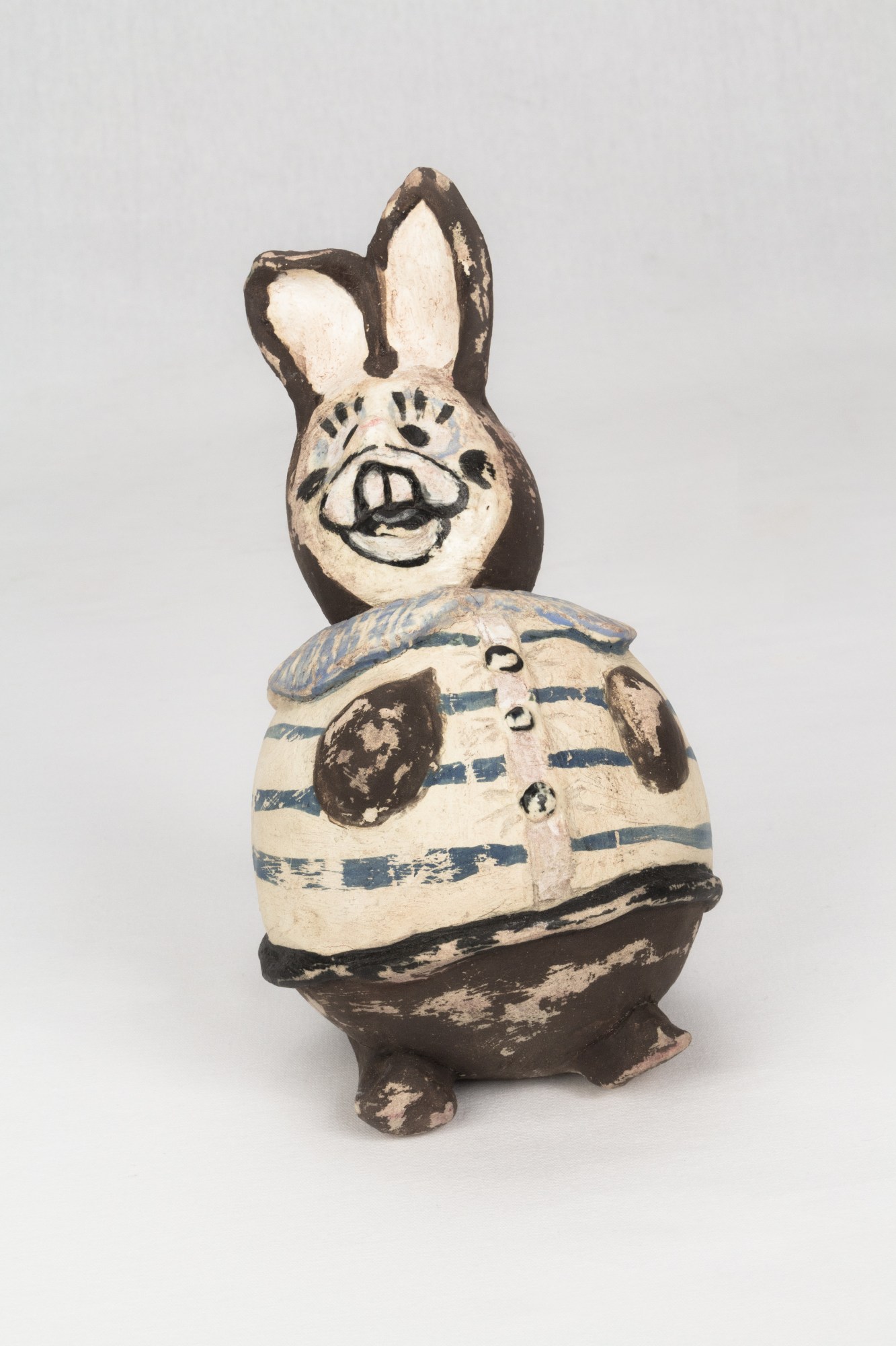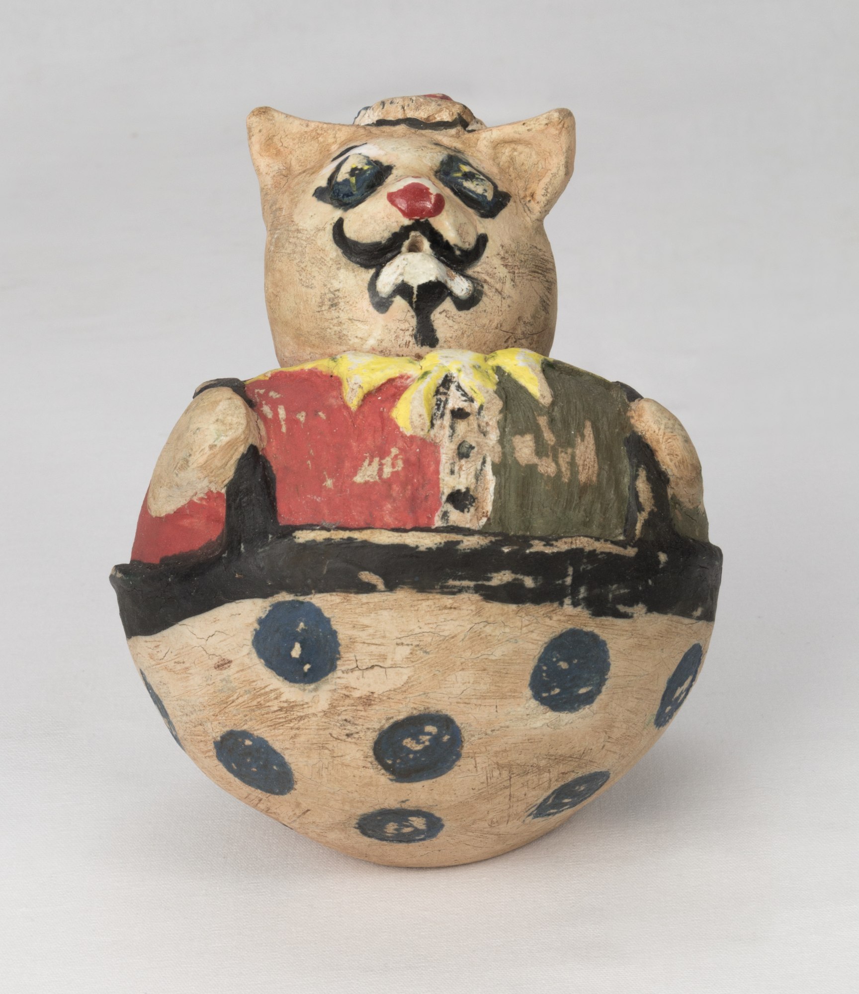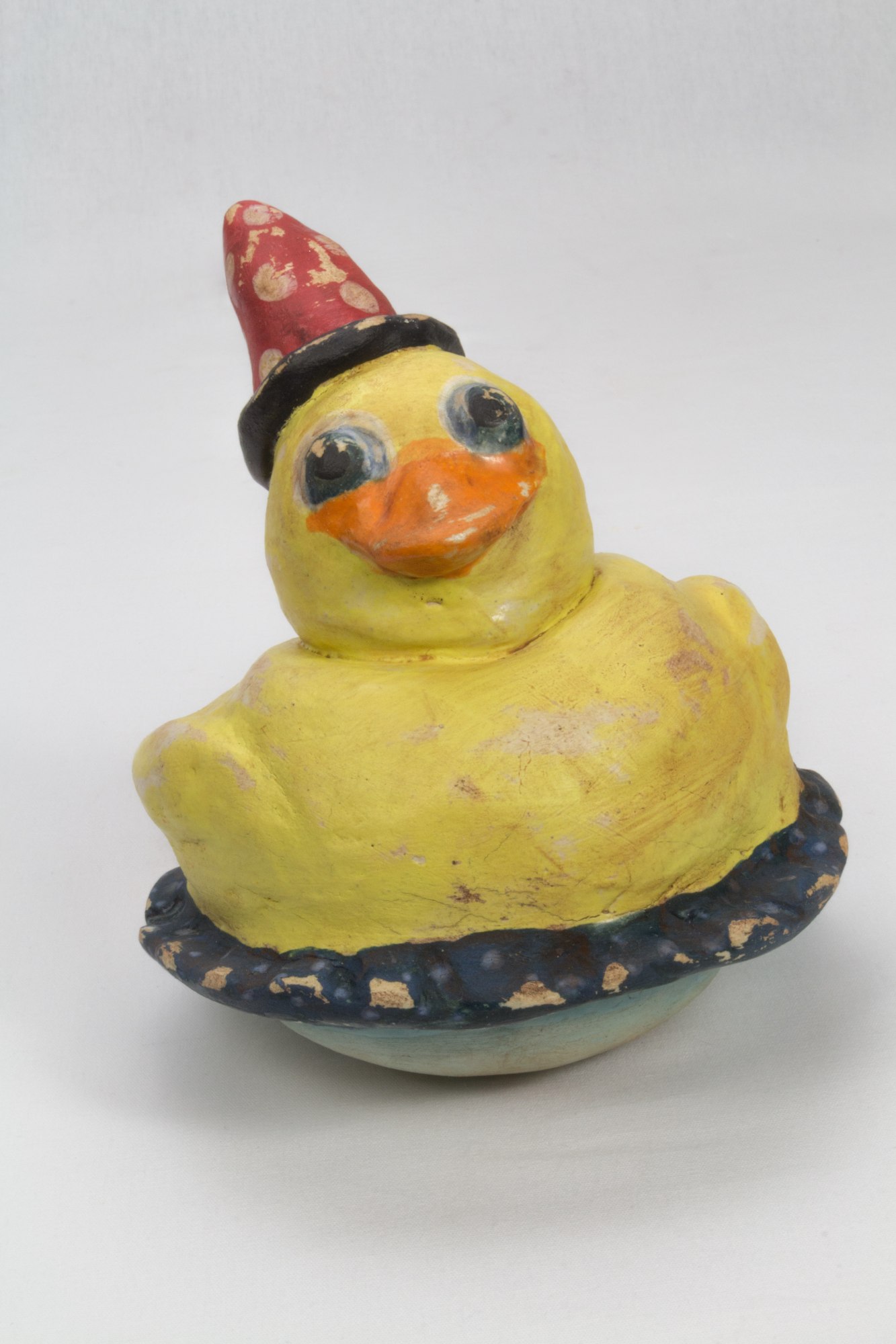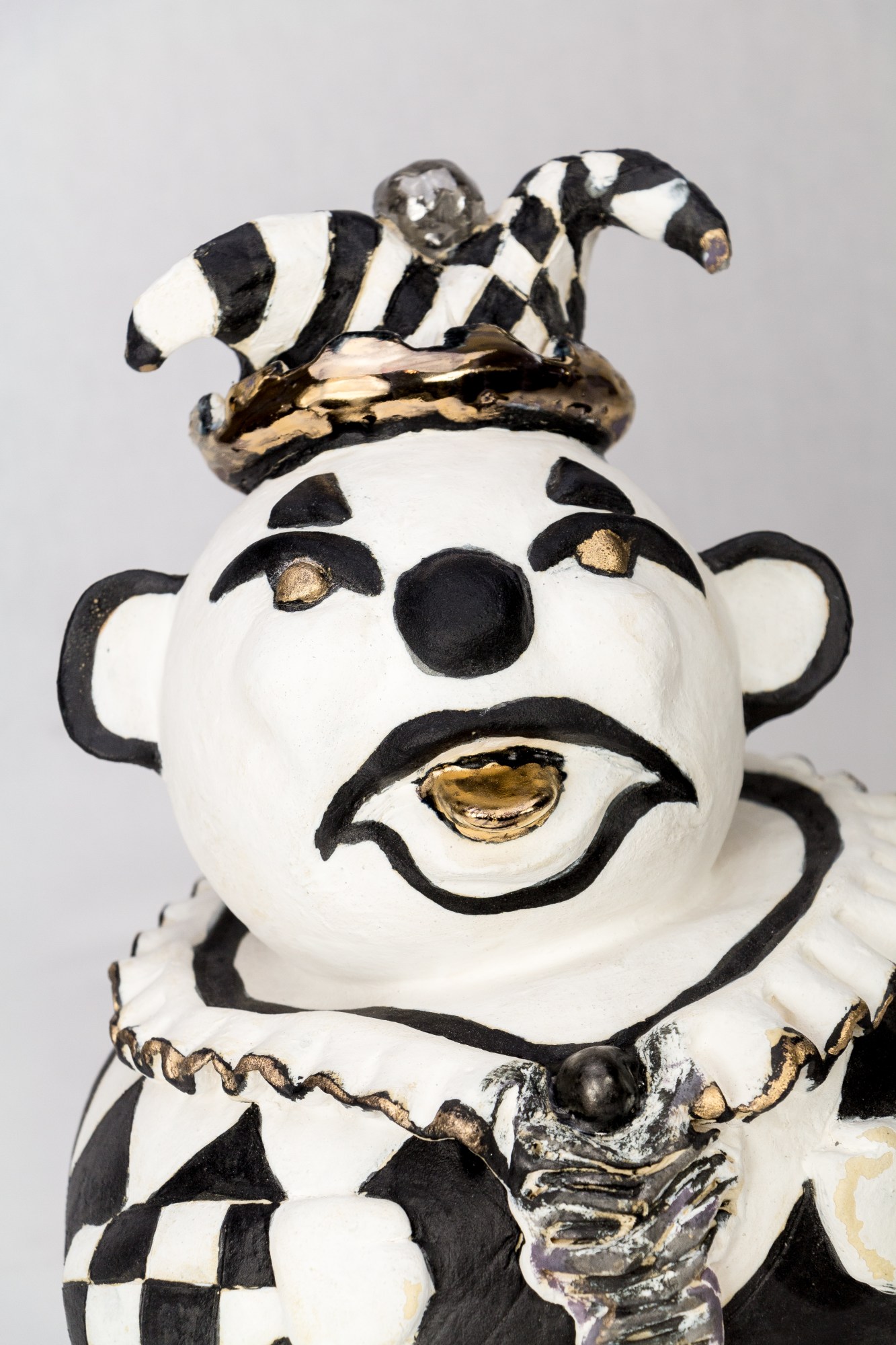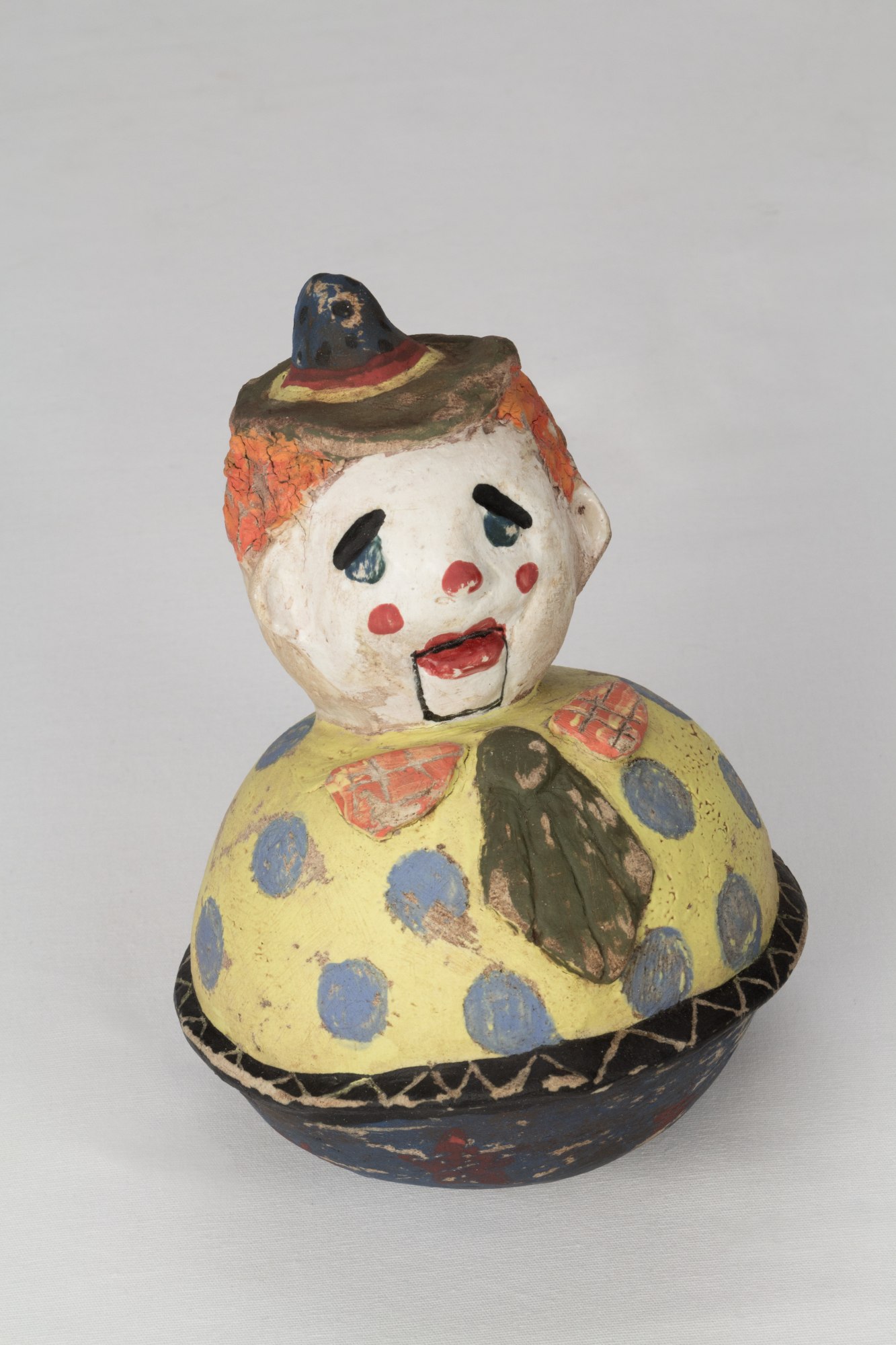 Follow The Leader, a high-fired ceramic and encaustic sculpture of nine small, faded, vintage, roly-poly toy clowns parading after a larger gilded hypnotic pompous clown demonstrates the media mockery of this 45th presidential election and describes my trust in the democratic process.