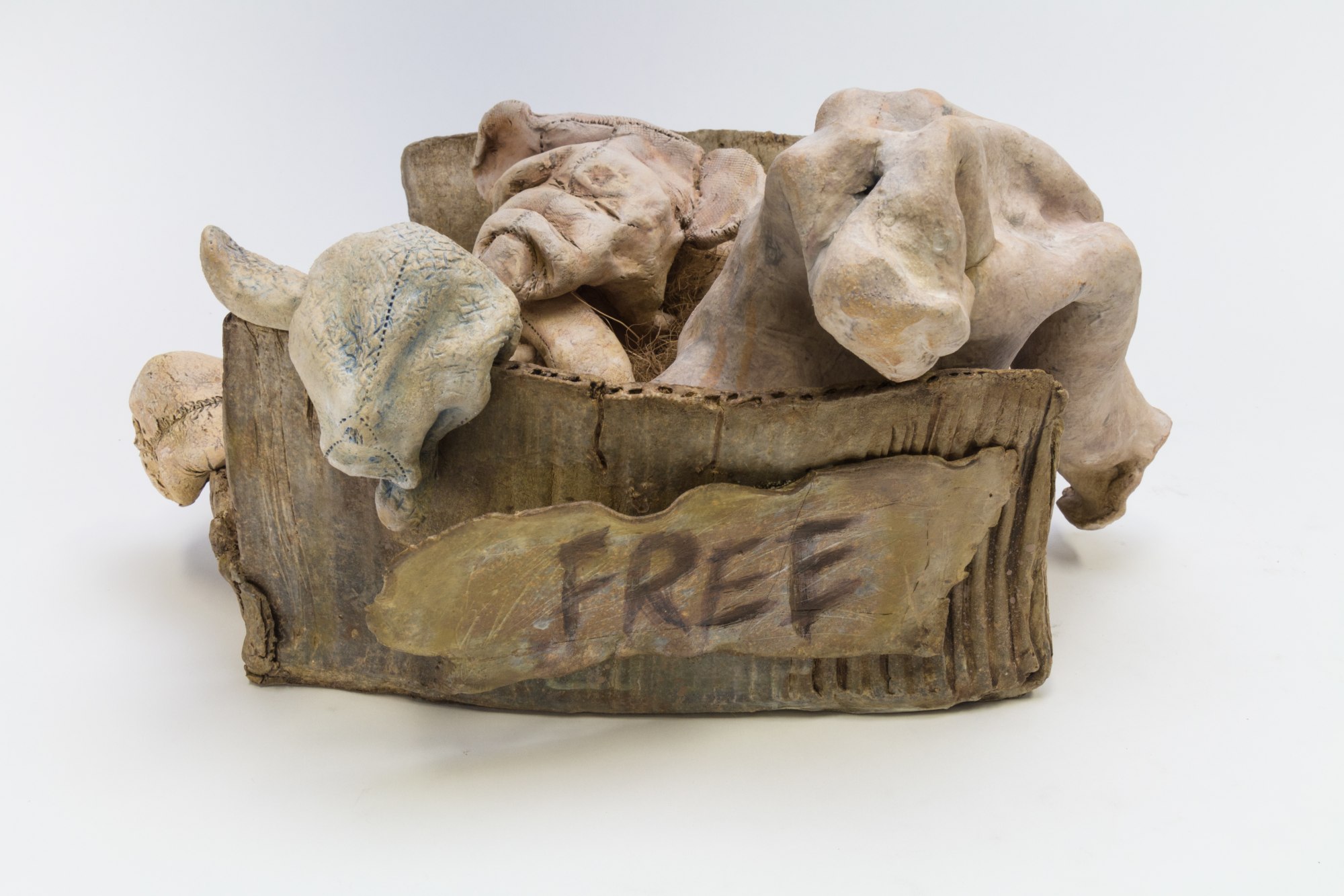 Made to fool the eye. A collection of bare memories, made of high-fired ceramic, sit abandoned in a (faux) cardboard box waiting for a new home.