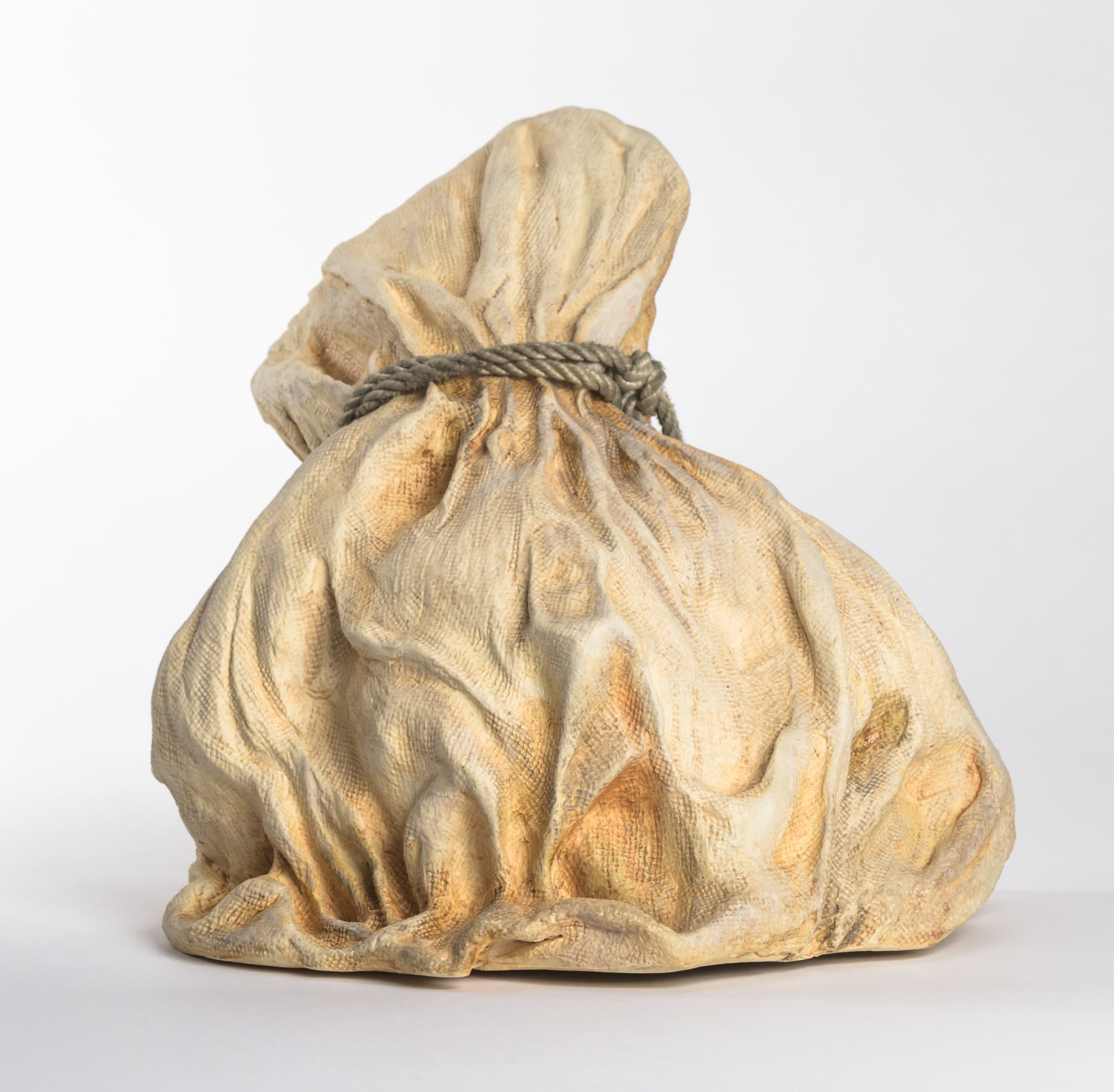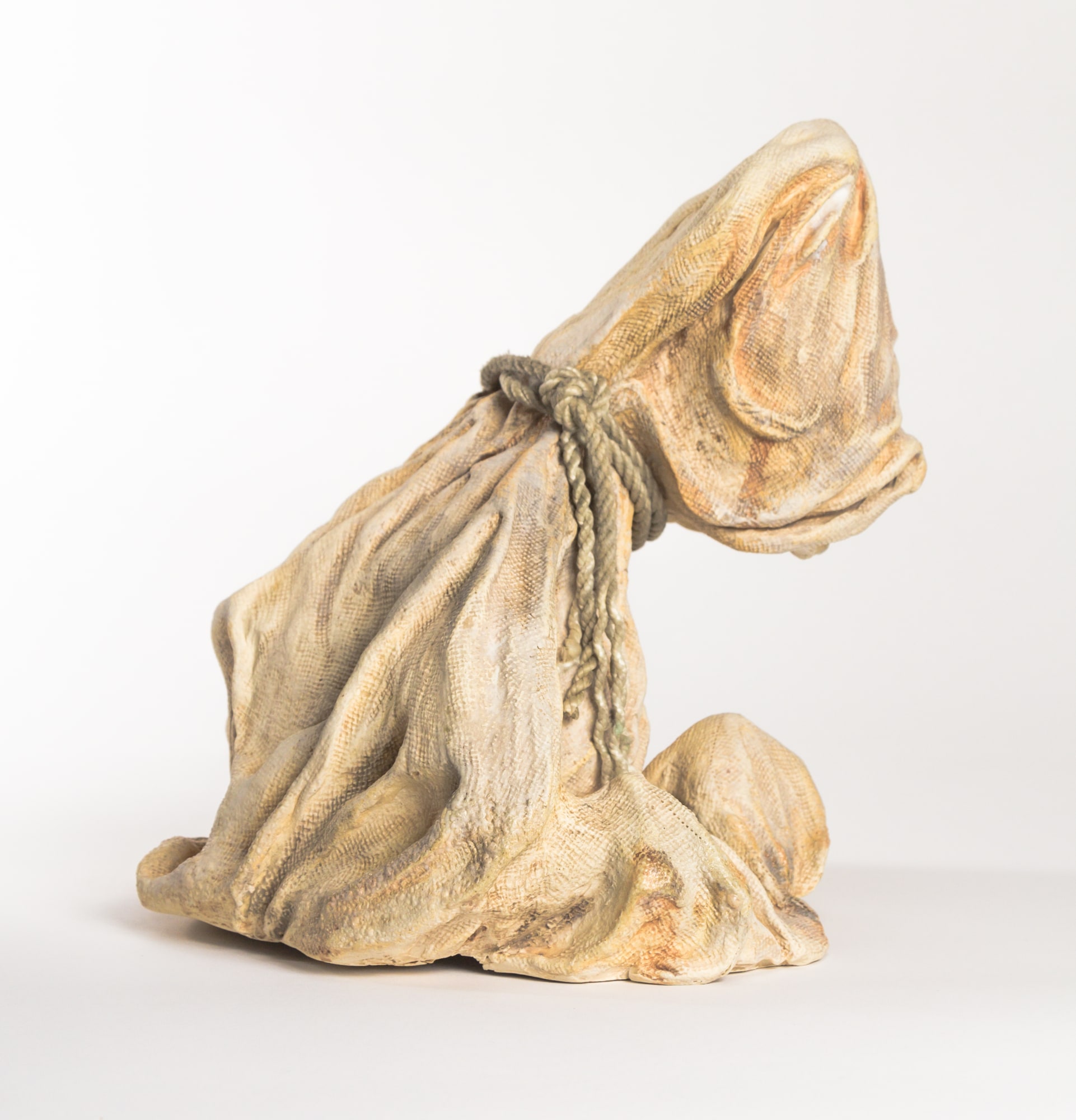 A ceramic sculpture From the series "Lost Not Forgotten,"A burlap textured bag tied with an old rope covers a seated toy bear in ‘Hostage’, by Gina M. It personifies an emotional prisoner showing a stuffed toe rising slightly, giving way to a glimpse of the vacancy underneath.