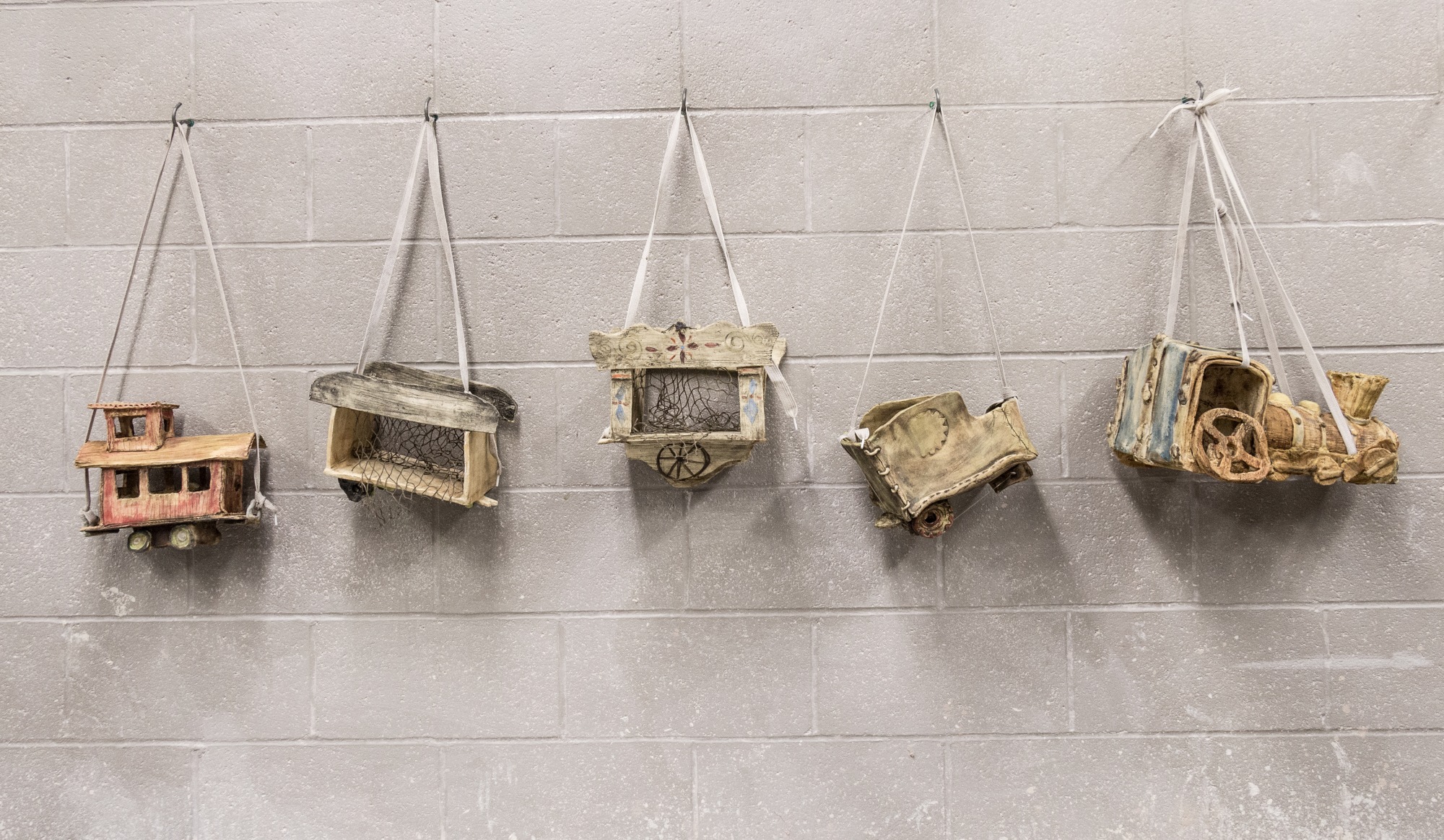 Hanging from wall hooks, ceramic, underglaze and paint create a wonky line of dilapidated toy train cars, suspended by dirty shoelaces. The title "I Thought I could, I thought I could," comes from the ending of a children's book where positive thinking created a positive outcome. However, this train is questioning their over-enthusiasm after surveying the damage.
