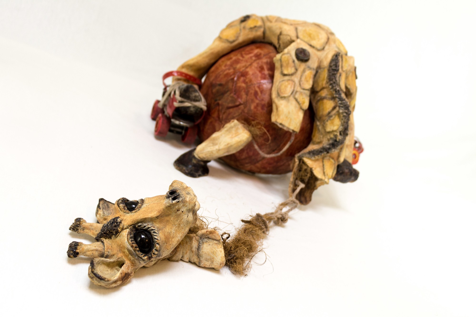 roller skating toy giraffe motionless, oozing her stuffing, draped over a red leather ball revealing one possible consequence of attempting the complex or difficult.
