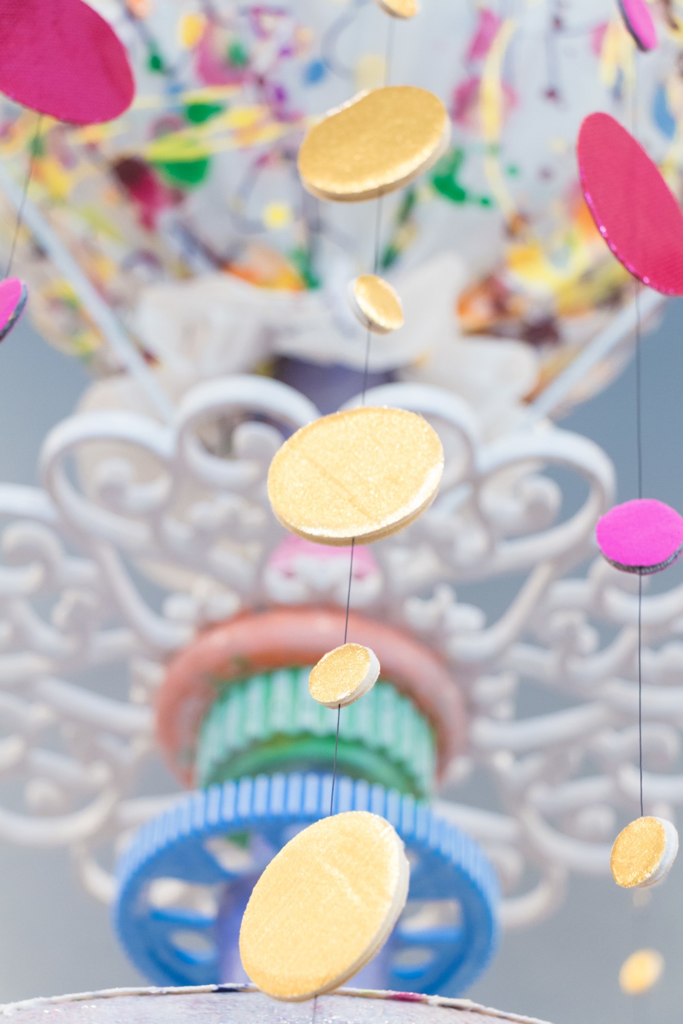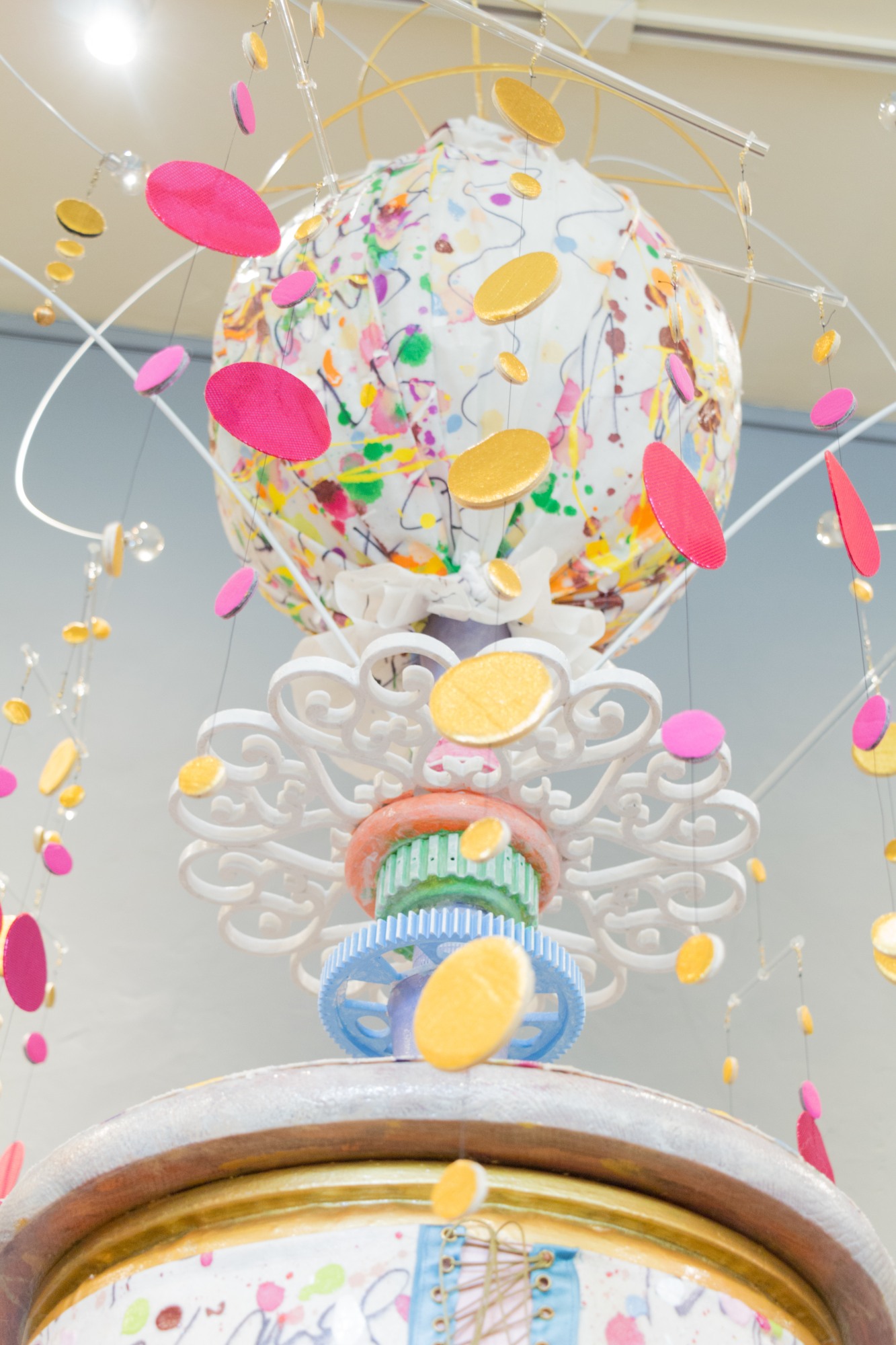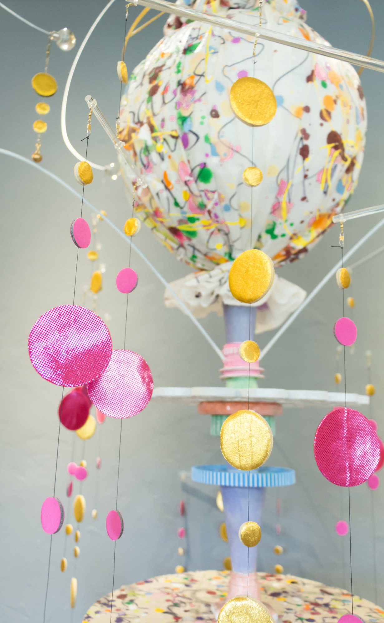 Artist Gina M.’s found objects merge, stack, and tower on top of each other, as Courtney Rackley’s painted dots and text jacket them with bold bright bursts of color. Fabric dots dangle like puppets from 6 mobile arms, encircling the lollipop head of the 8-foot sculpture It’s My Party, floating, spinning and dancing to a phantom beat no one can hear.