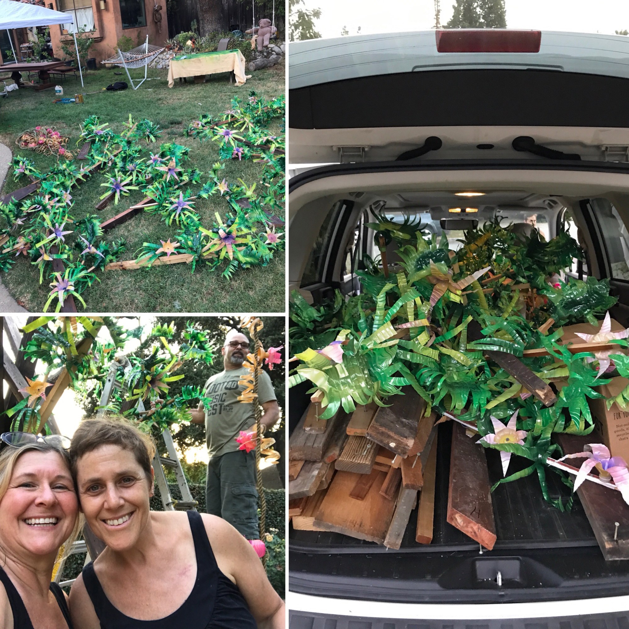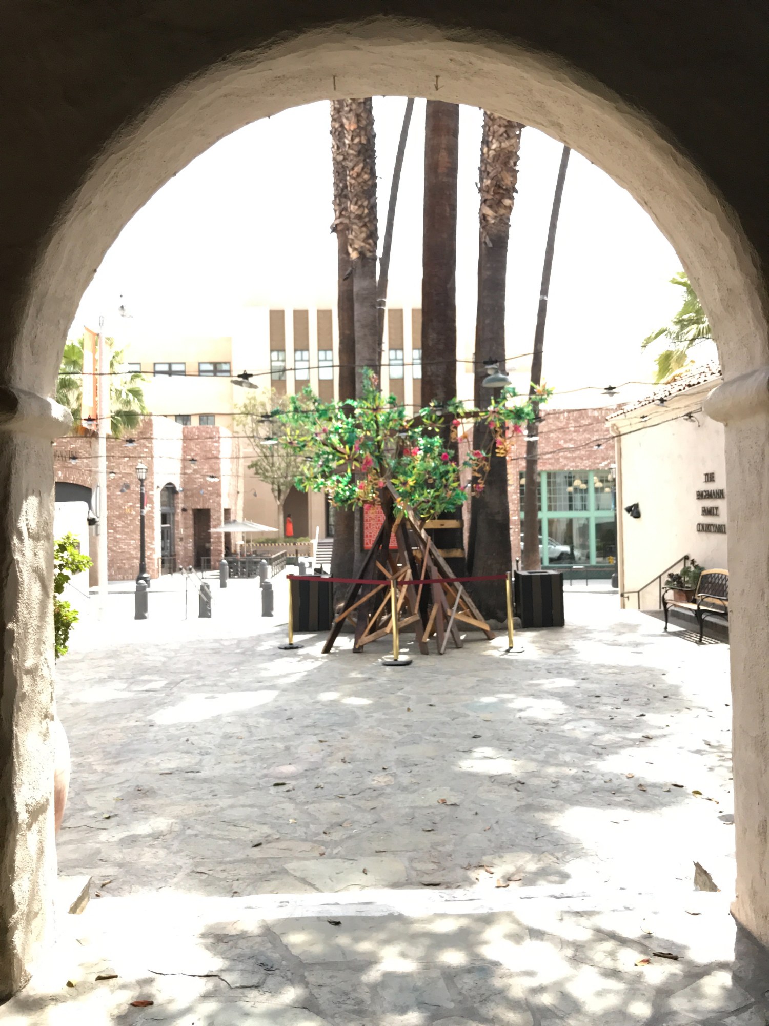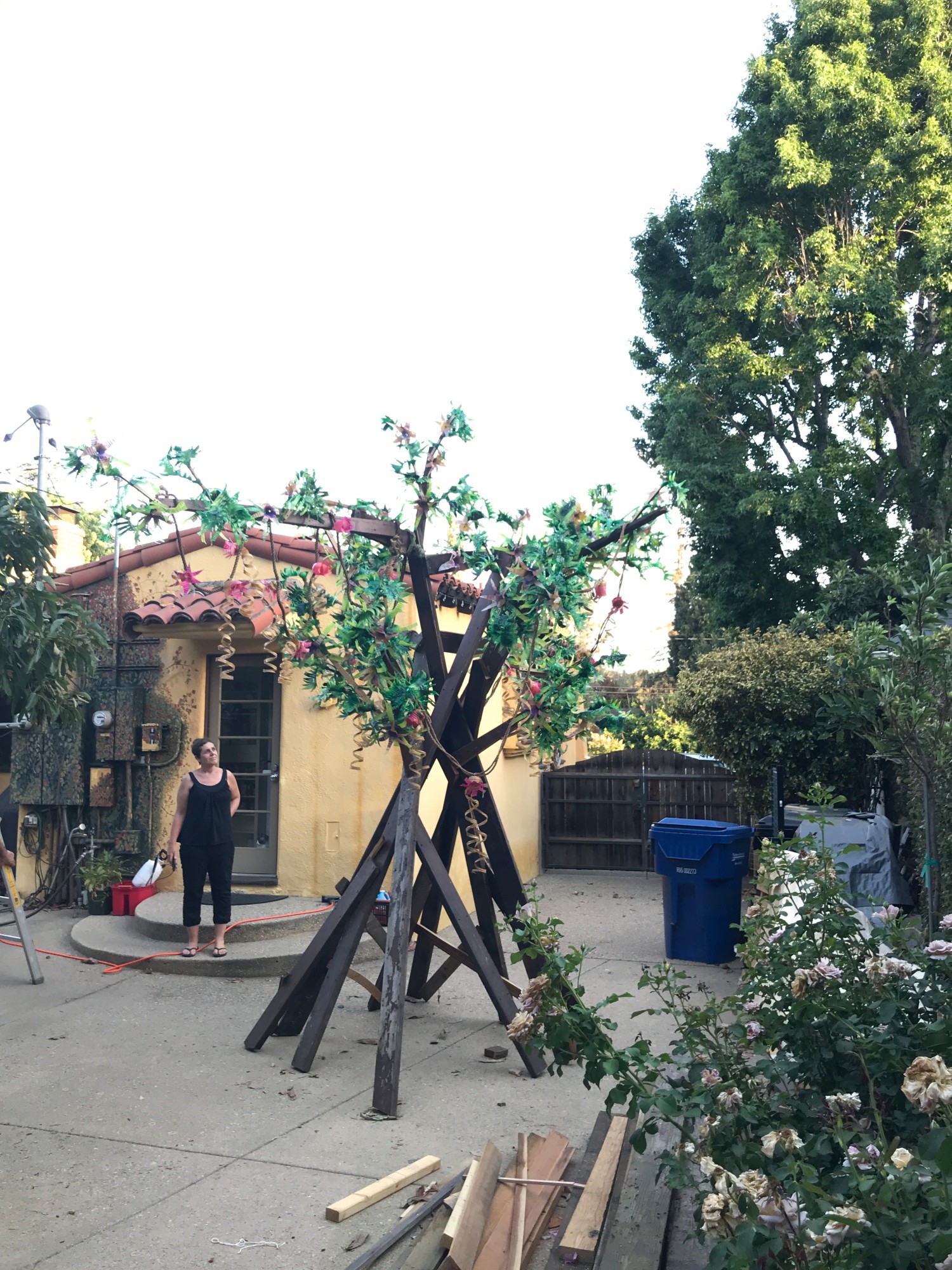 One custom made 10 foot high contemporary tree sculpture - delivered and installed in the courtyard of the Pasadena playhouse, on July 10, made from the PPH’s 300 donated recycled plastic bottles, the artist recycled decking materials, screws, rope, and spray paint.