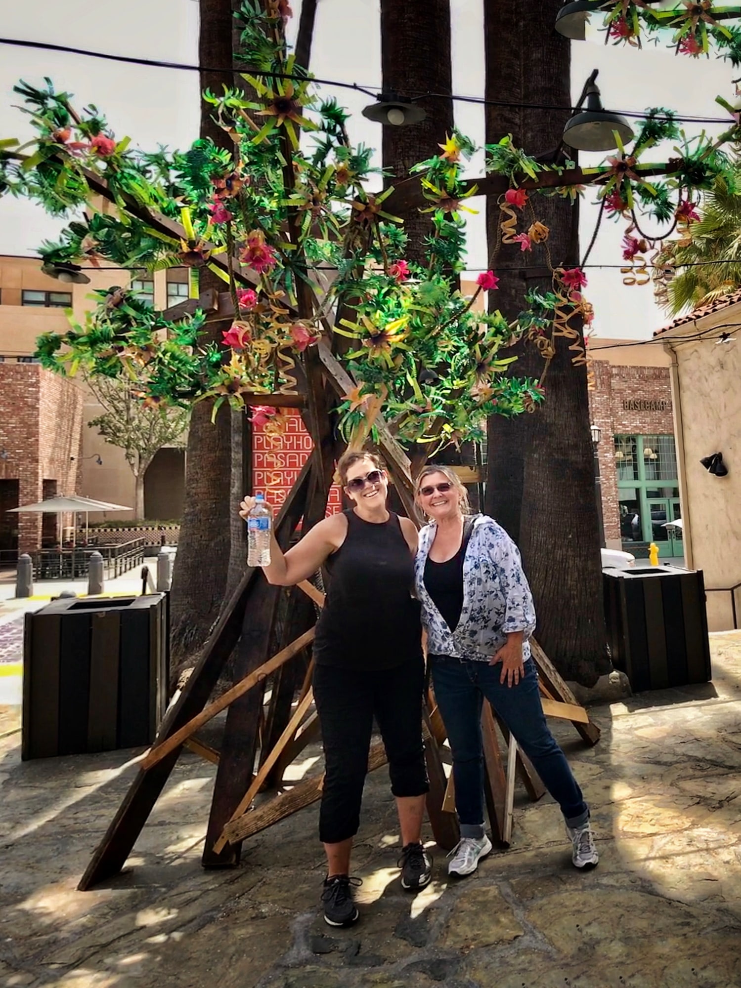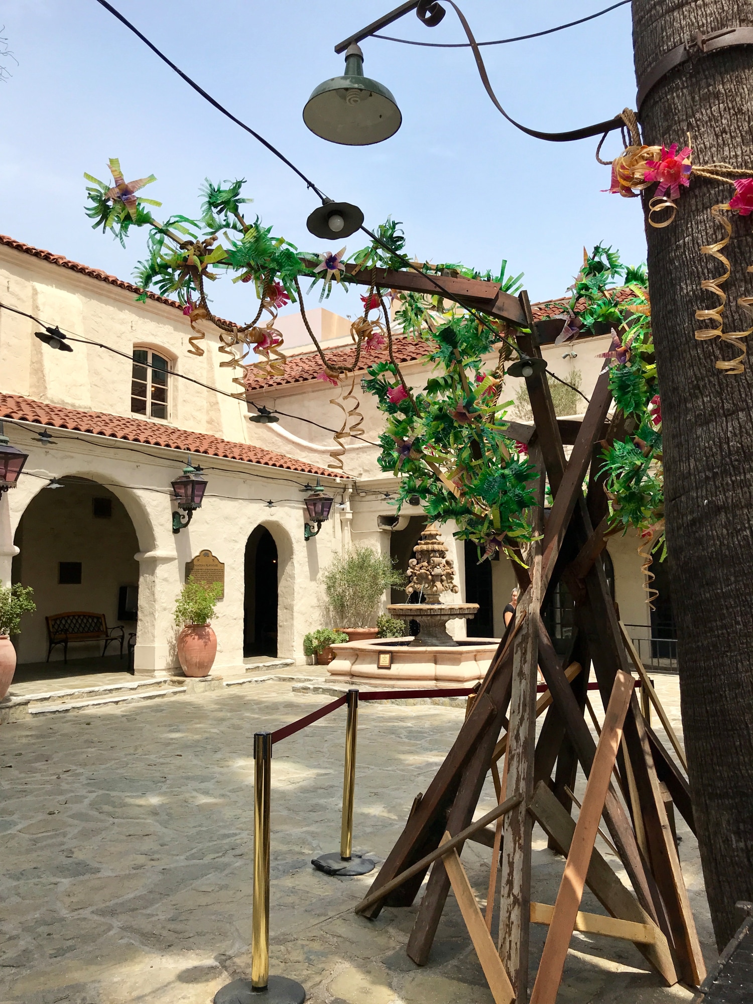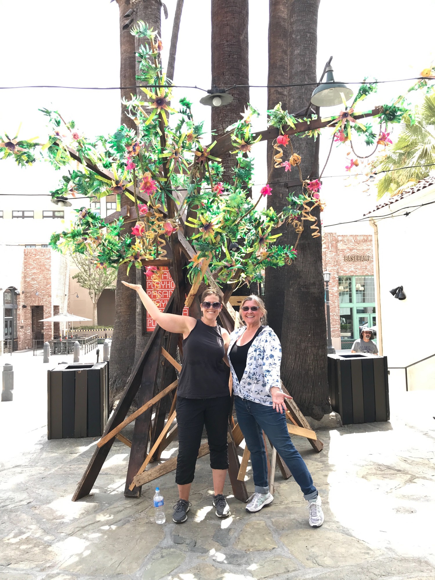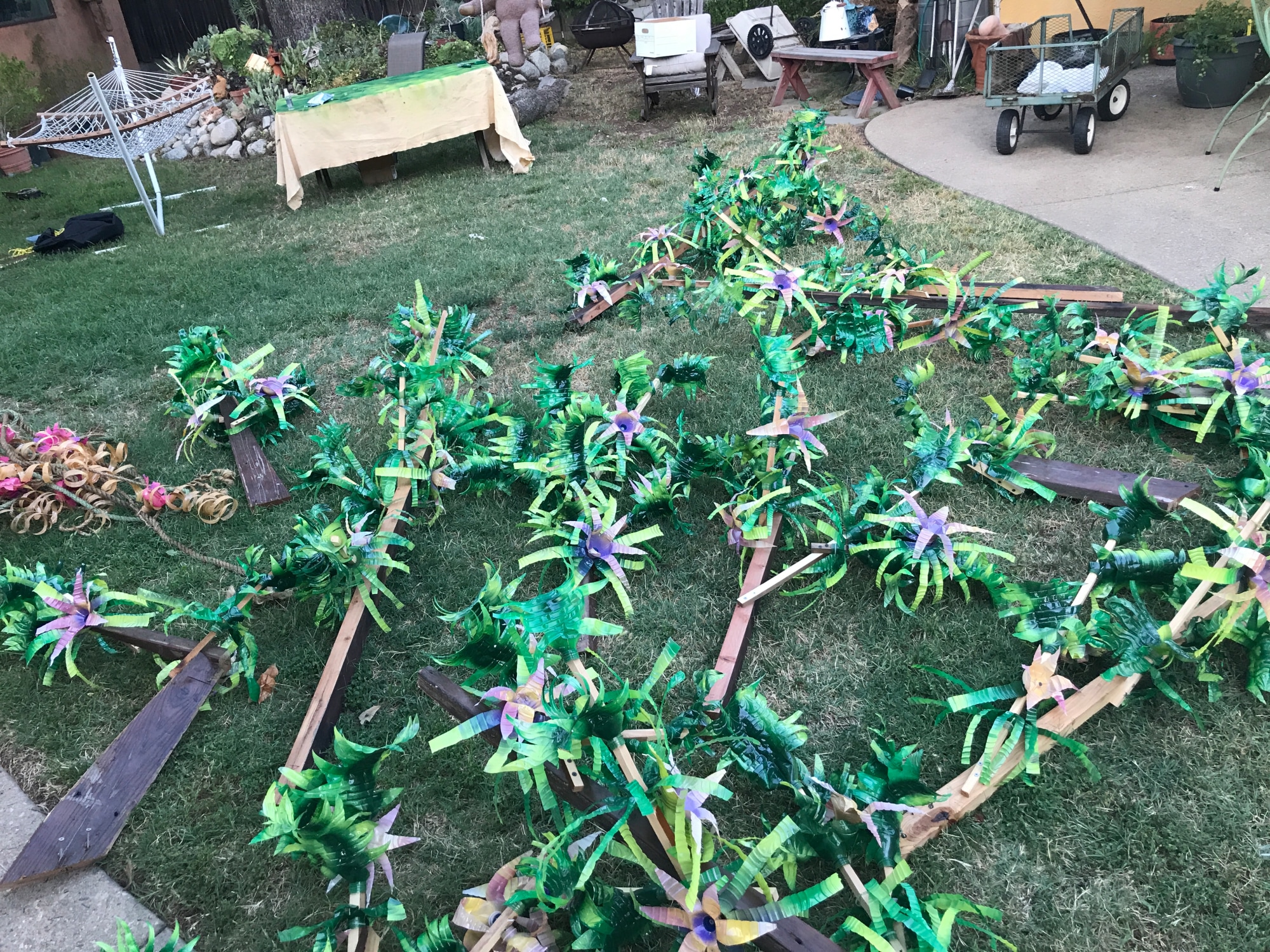 One custom made 10 foot high contemporary tree sculpture - delivered and installed in the courtyard of the Pasadena playhouse, on July 10, made from the PPH’s 300 donated recycled plastic bottles, the artist recycled decking materials, screws, rope, and spray paint.