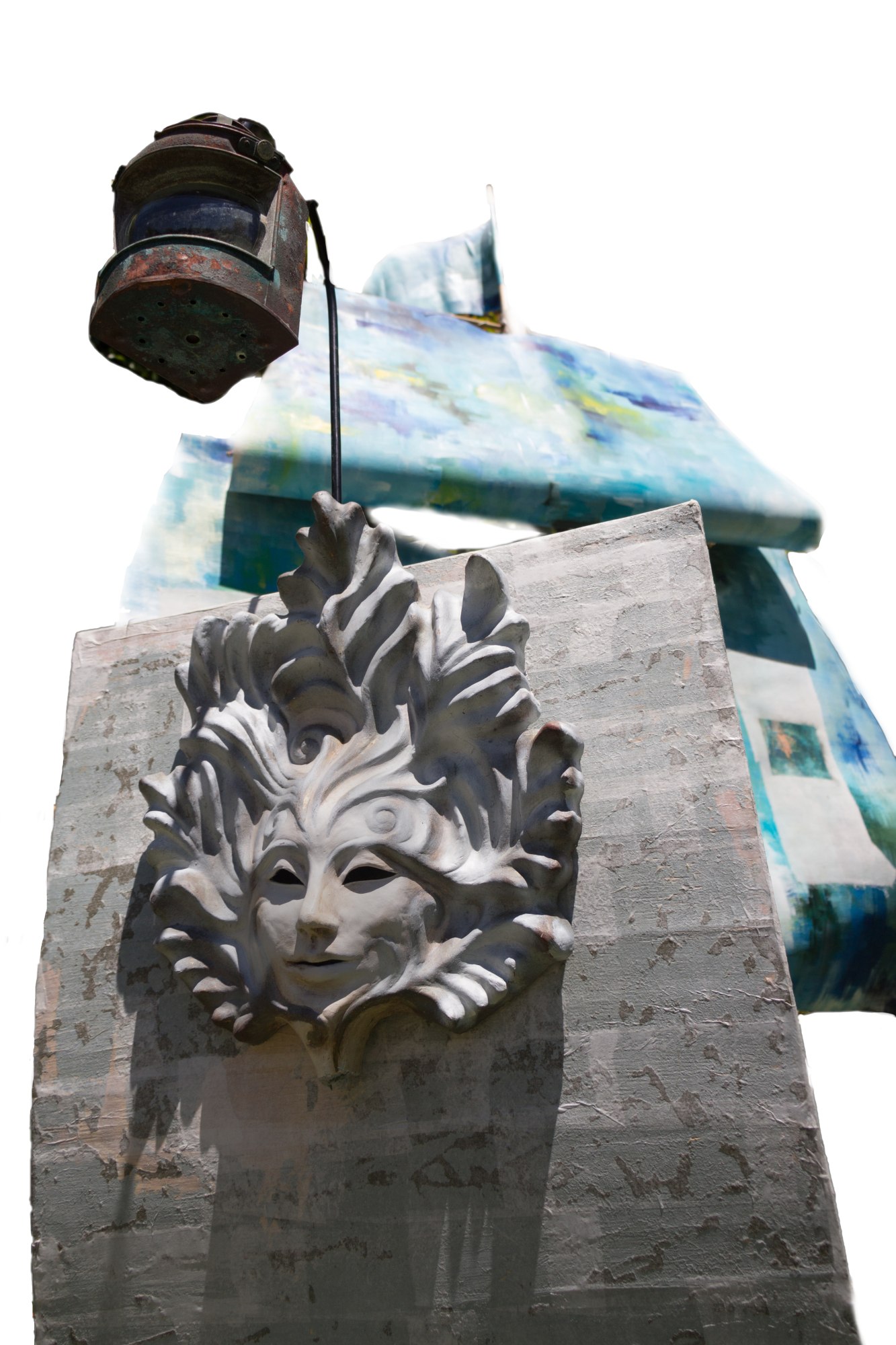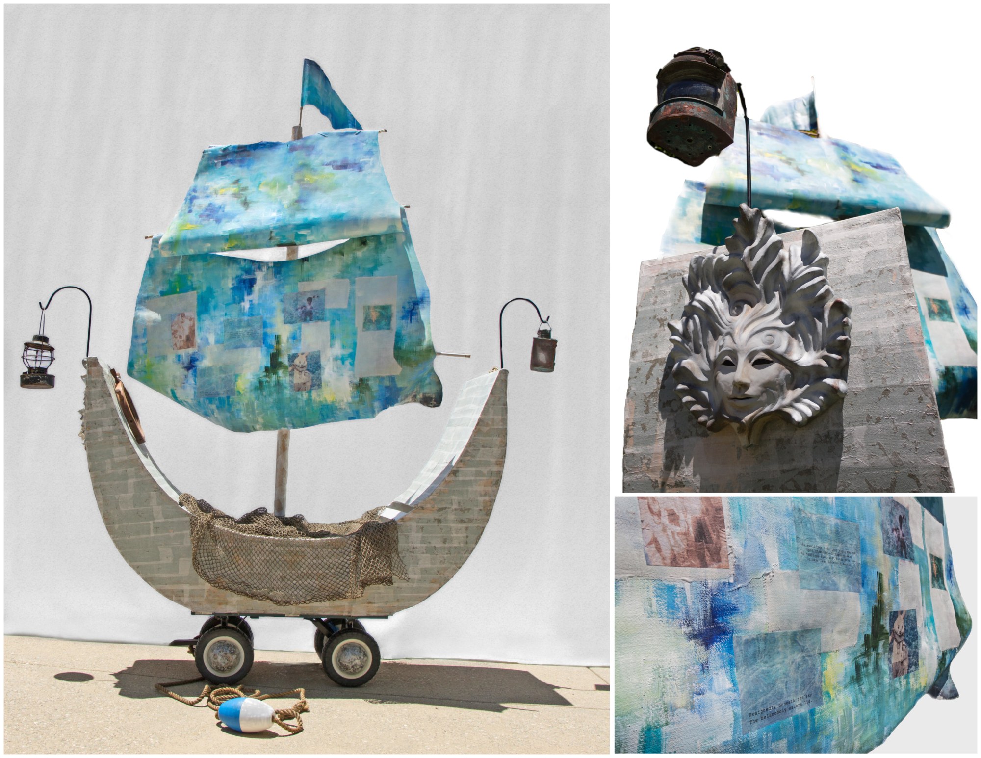 Gina and Kristine transformed found objects into a whimsical oversized toy boat with sails unfurled. A crescent moon wrapped in tissue, a rusty wagon, found nautical objects, and acrylic paint on paper morph, the way a child's pillow fort morphs, into a dreamboat of possibilities. The bright blue abstract sail creates a playful backdrop for the two artists childhood photographs that float among quotes from “The City in the Sea,” by Edgar Allan Poe.