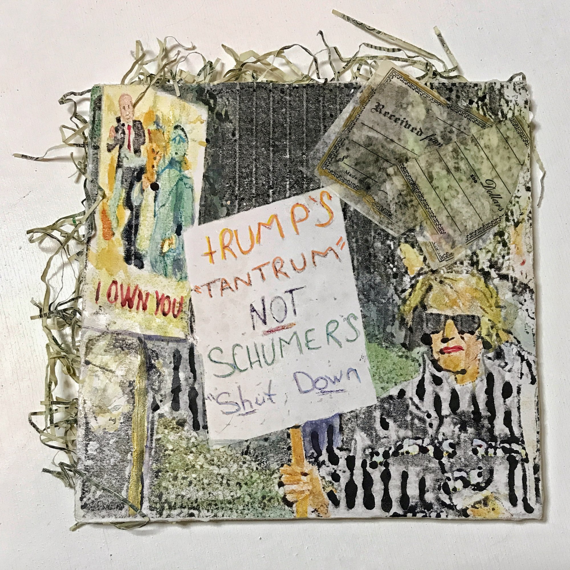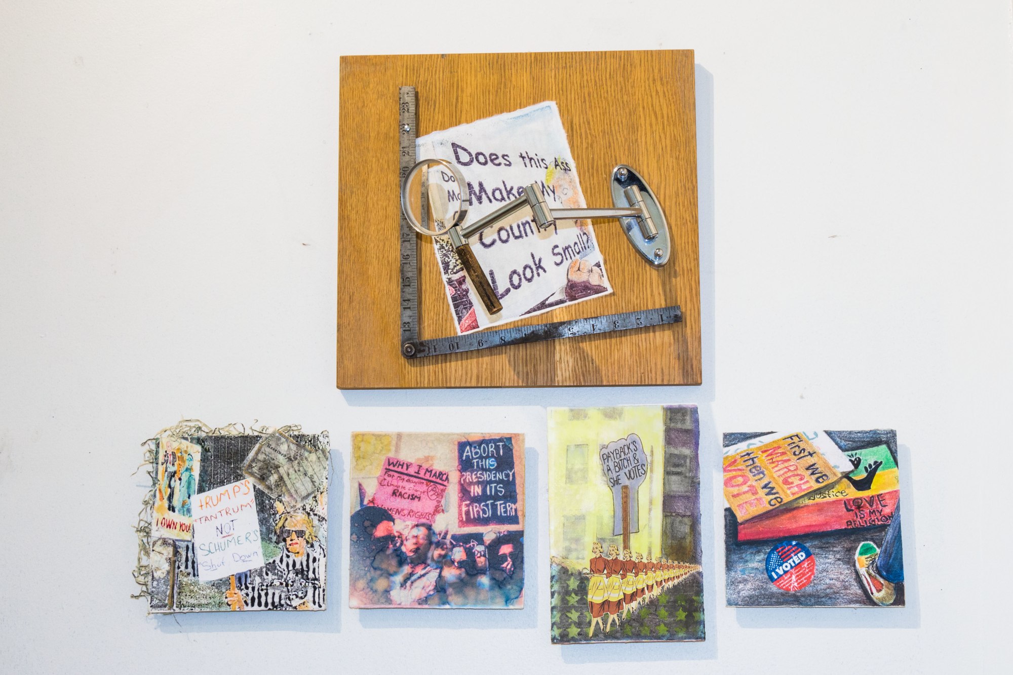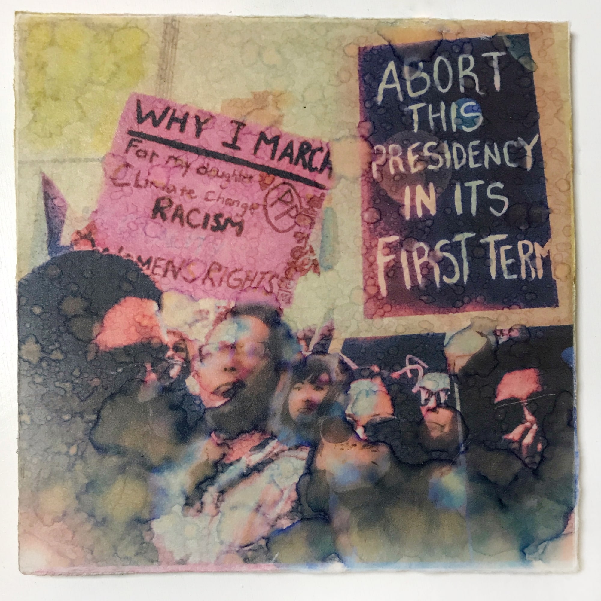 “More of Us – Embellished”, grew from digital photographs I took at the Los Angeles March for Our Lives, 2018. I printed them onto clear film using inkjet ink and indiscriminately hand pressed them onto various papers. I used alcohol, watercolor pencil, stickers, found objects, stamps, pens and a UV coating to embellish them, highlighting or exaggerating the message on the sign. I create these to extend the feeling of protest and resistance.