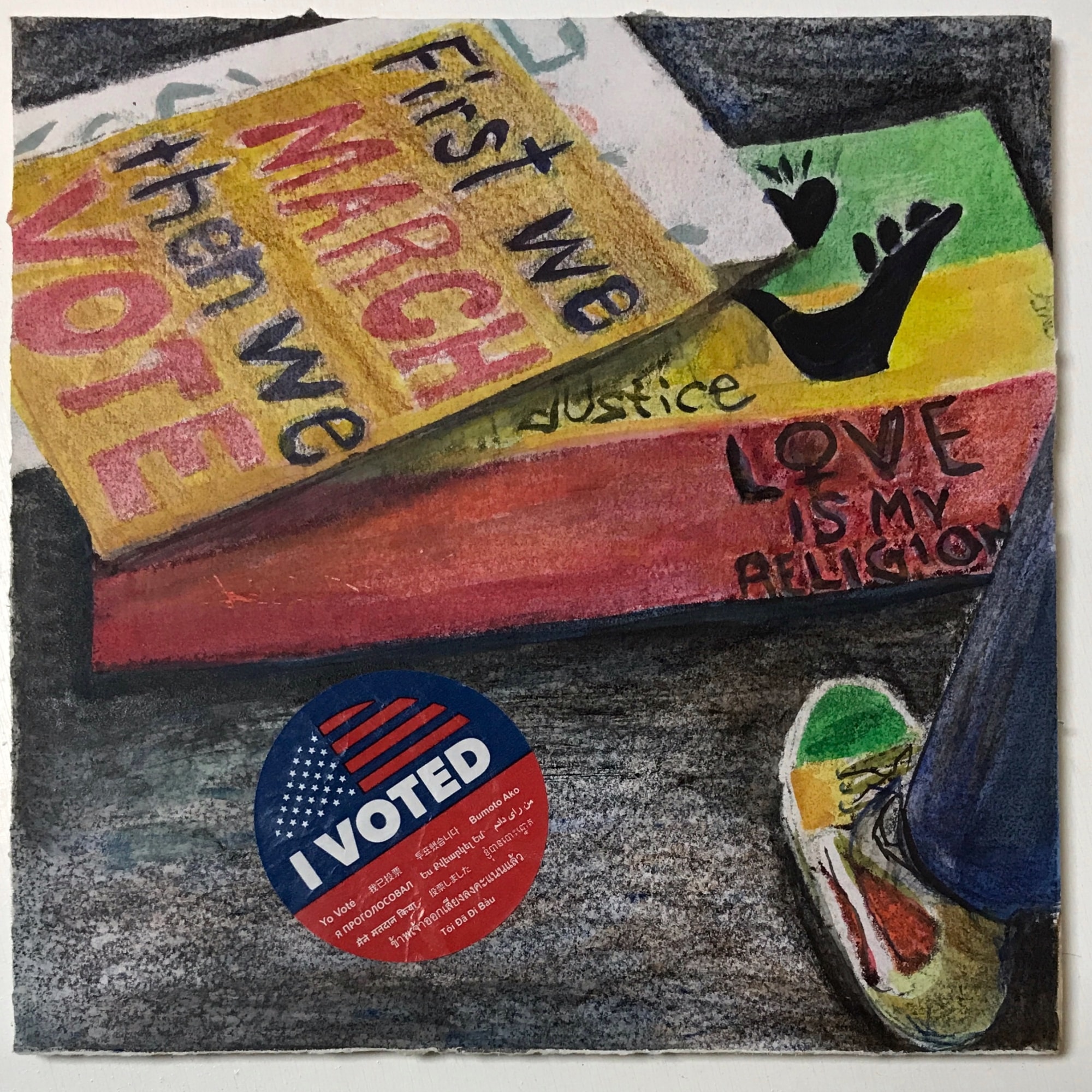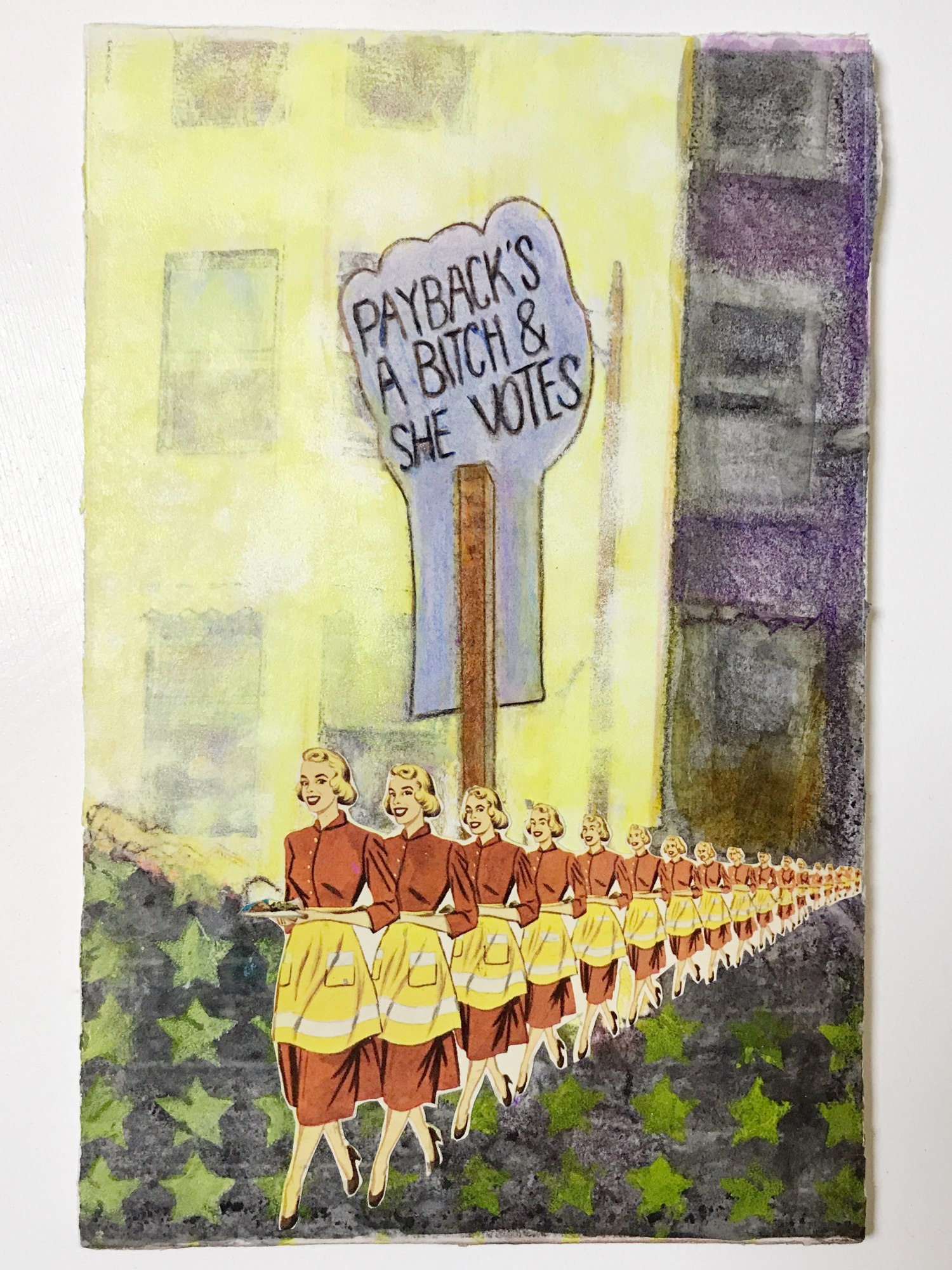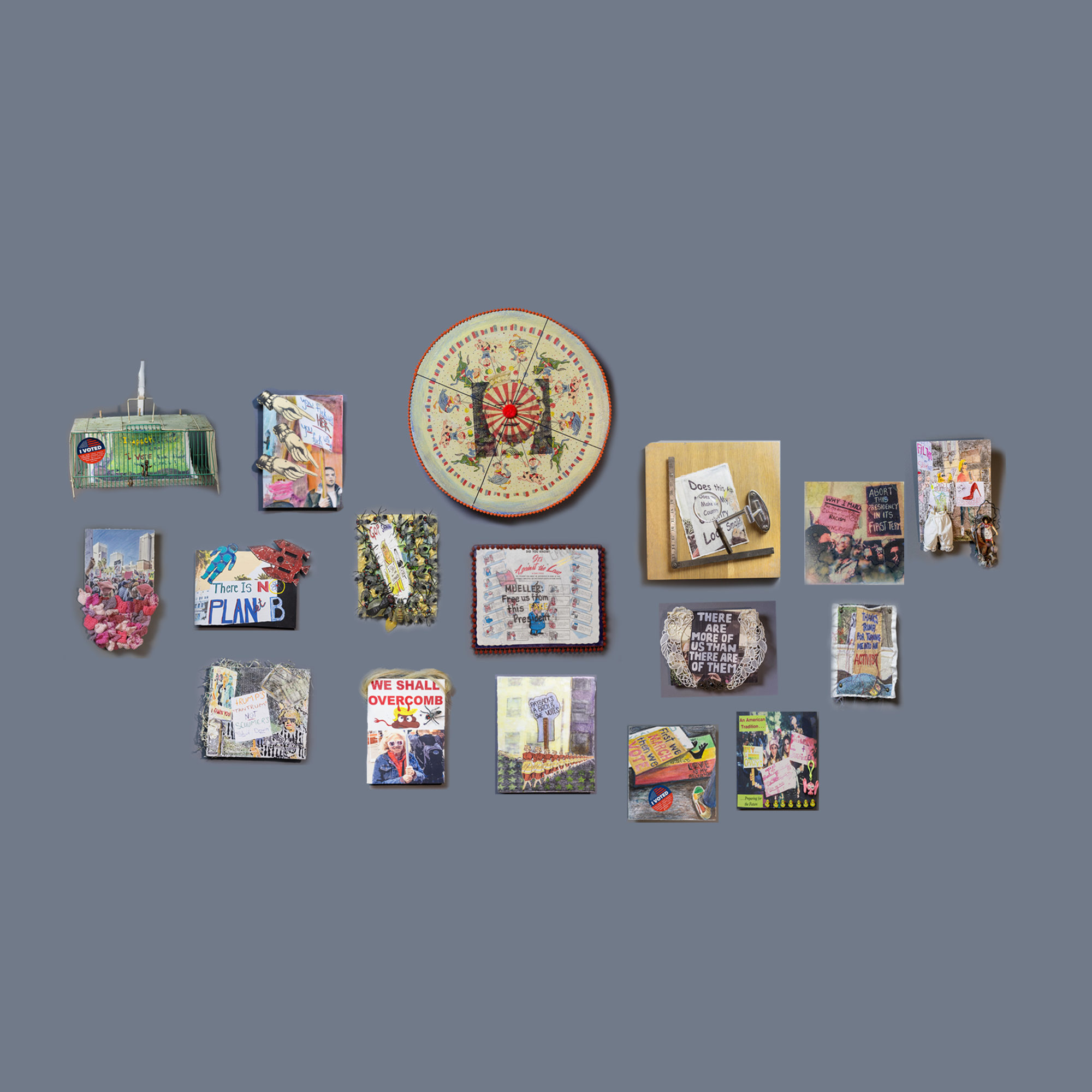 “More of Us – Embellished”, grew from digital photographs I took at the Los Angeles March for Our Lives, 2018. I printed them onto clear film using inkjet ink and indiscriminately hand pressed them onto various papers. I used alcohol, watercolor pencil, stickers, found objects, stamps, pens and a UV coating to embellish them, highlighting or exaggerating the message on the sign. I create these to extend the feeling of protest and resistance.