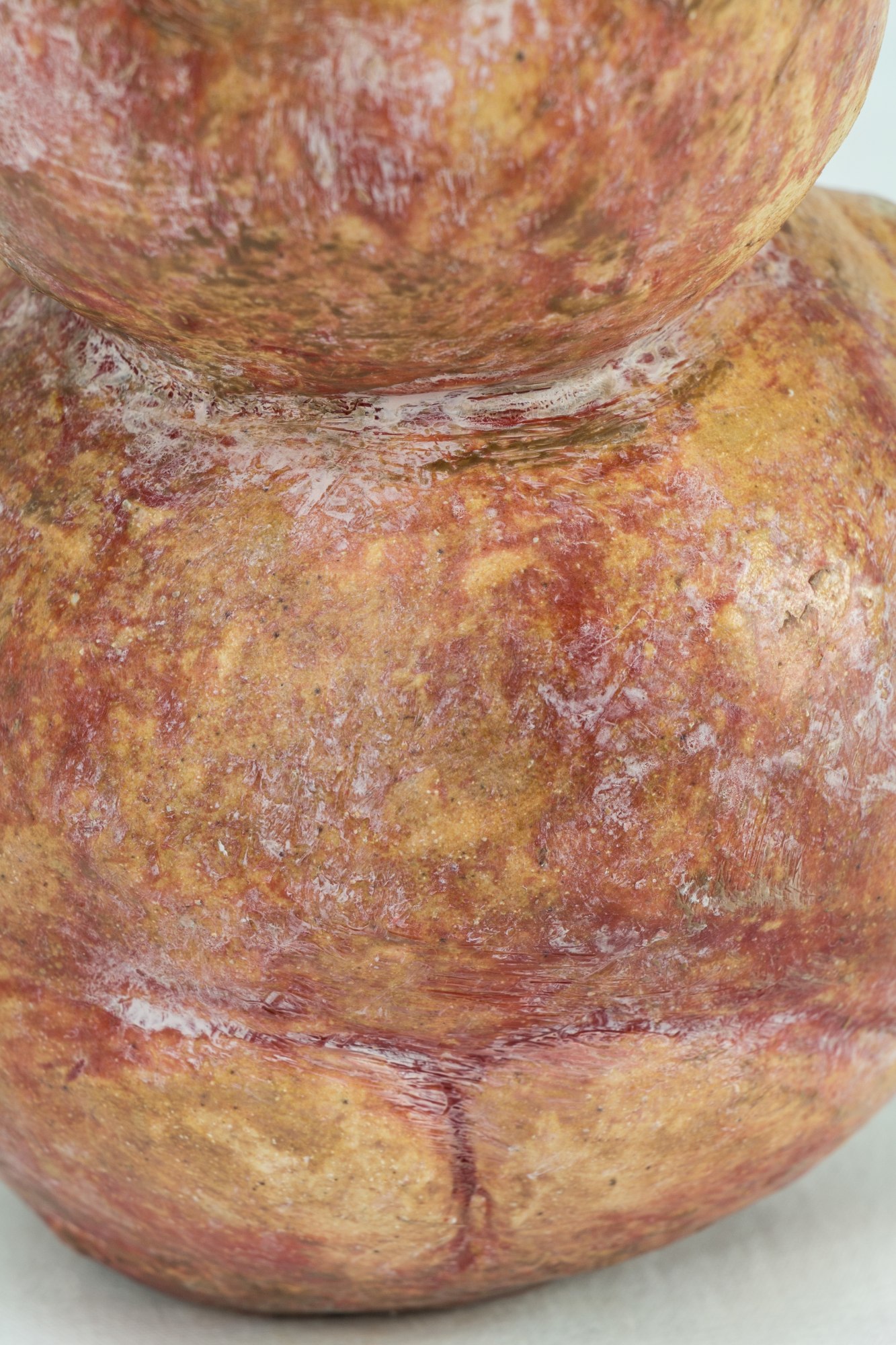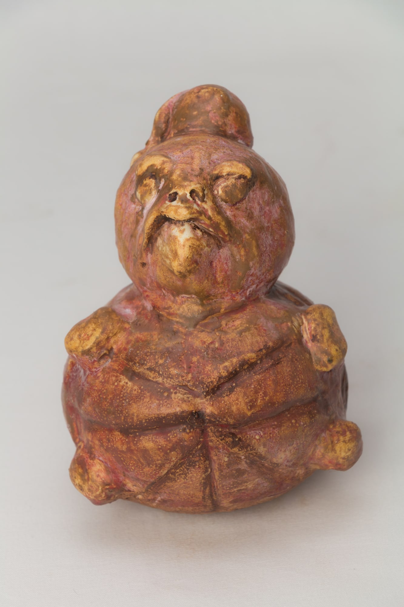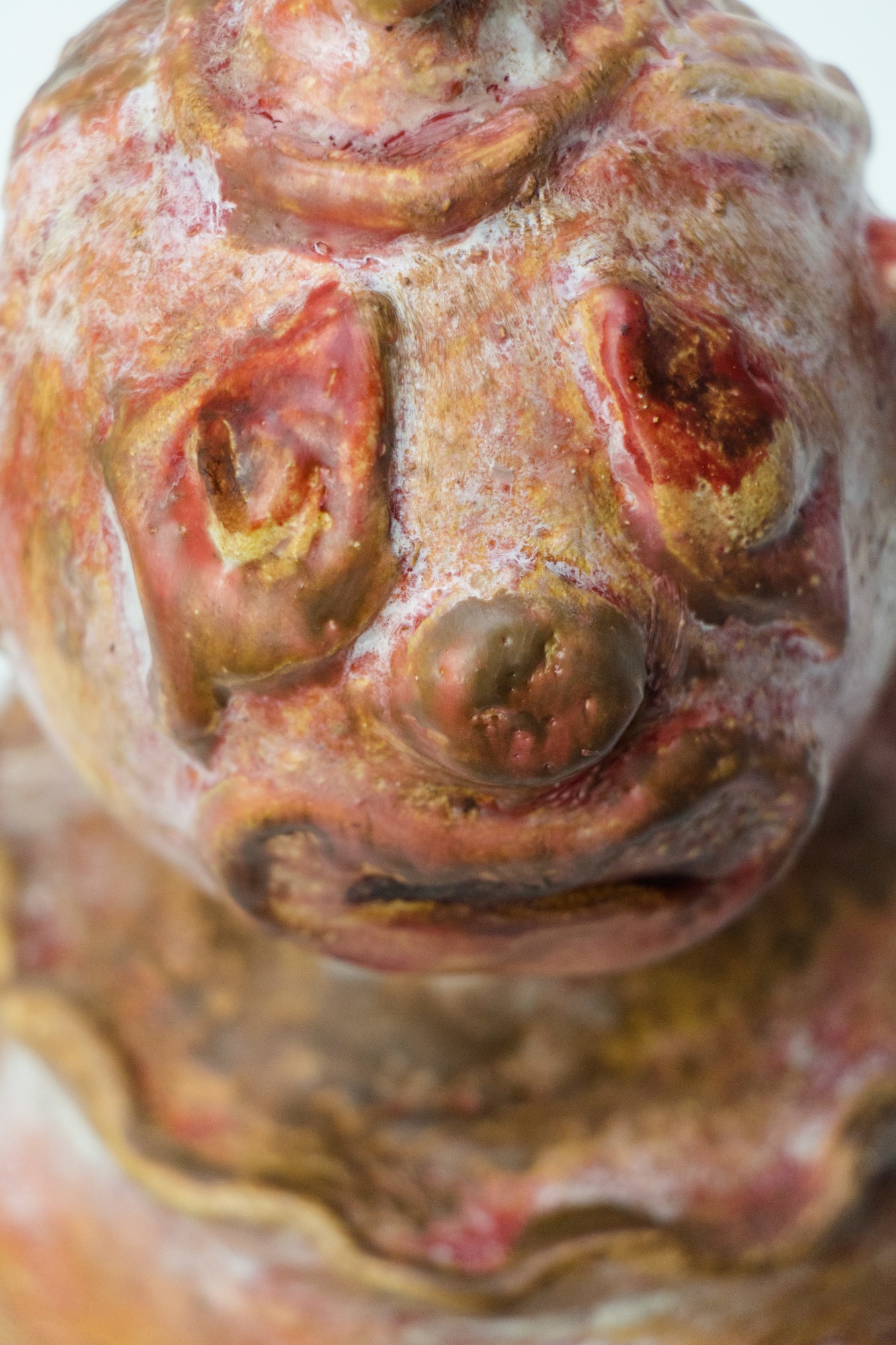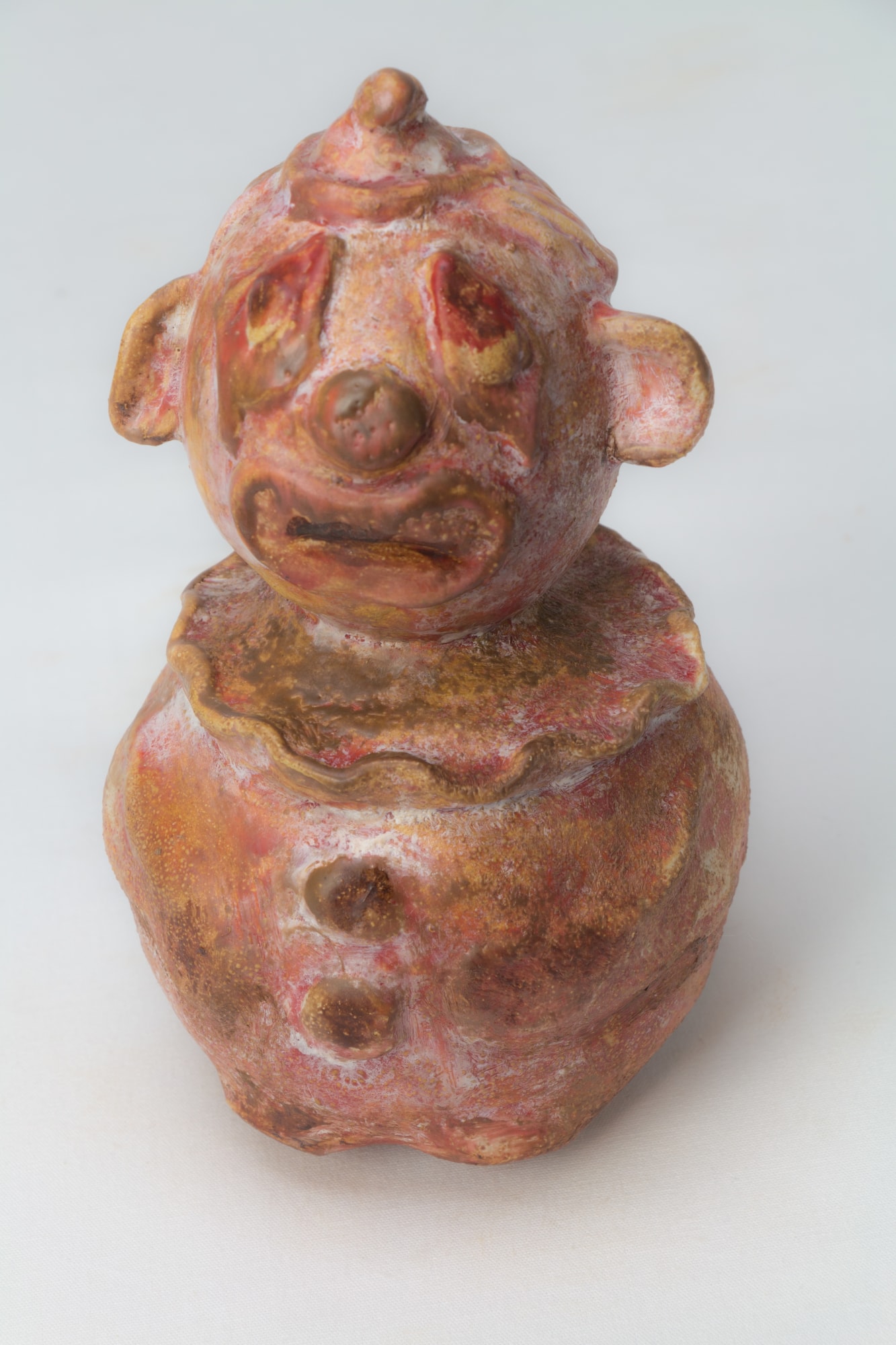 In response to my companion piece, Follow The Leader, No Worse For Wear, a high-fired ceramic and encaustic sculpture uses the same vintage roly-poly toy imagery, this time with only 5 small faded mutant clowns surrounding a larger apocalyptic toy in a gas mask, reminding the viewer to consider the consequences, the aftermath, of action or inaction. Remember, there is always an “after” someone has to live through and we help shape that future.