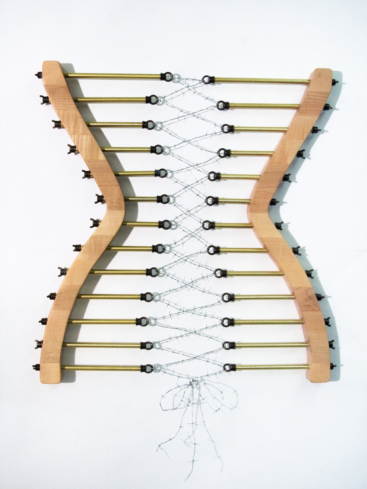 The piece Of Corset Hurts, made from butcher-block wood, hand made barbed wire and lamp parts, exemplifies the pain of femininity at every age.