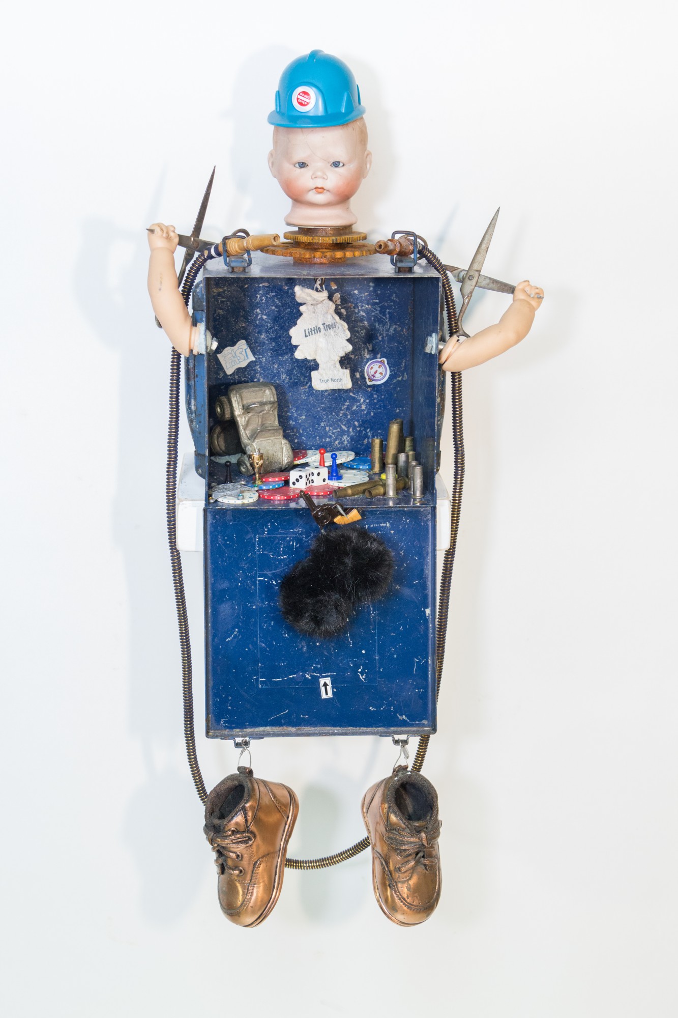 assemblage, blue box, doll head, scissors, bullets, air freshener, bronze baby shoes
