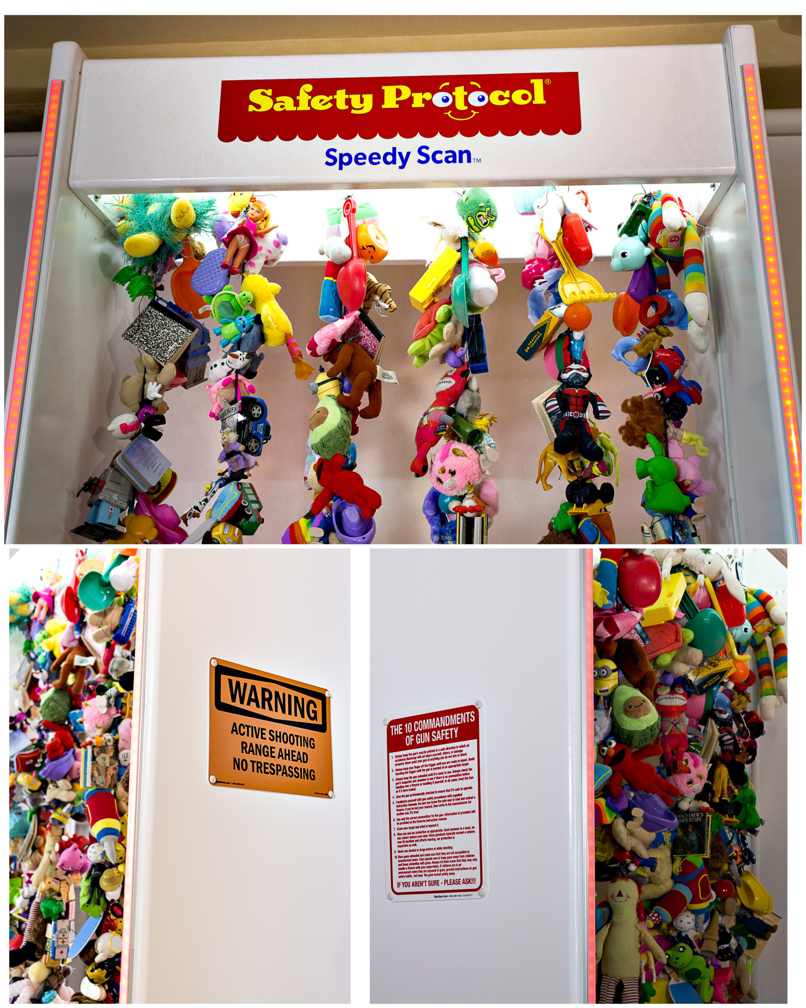Safety Protocol, Speedy Scan replicates a walkthrough metal detector with real warning labels on the sides. Colorful toys hang from chains filling the doorway while lights blink from the motion as you walk through; A subconscious conditioning of child’s play to accept a new normal of gun violence.