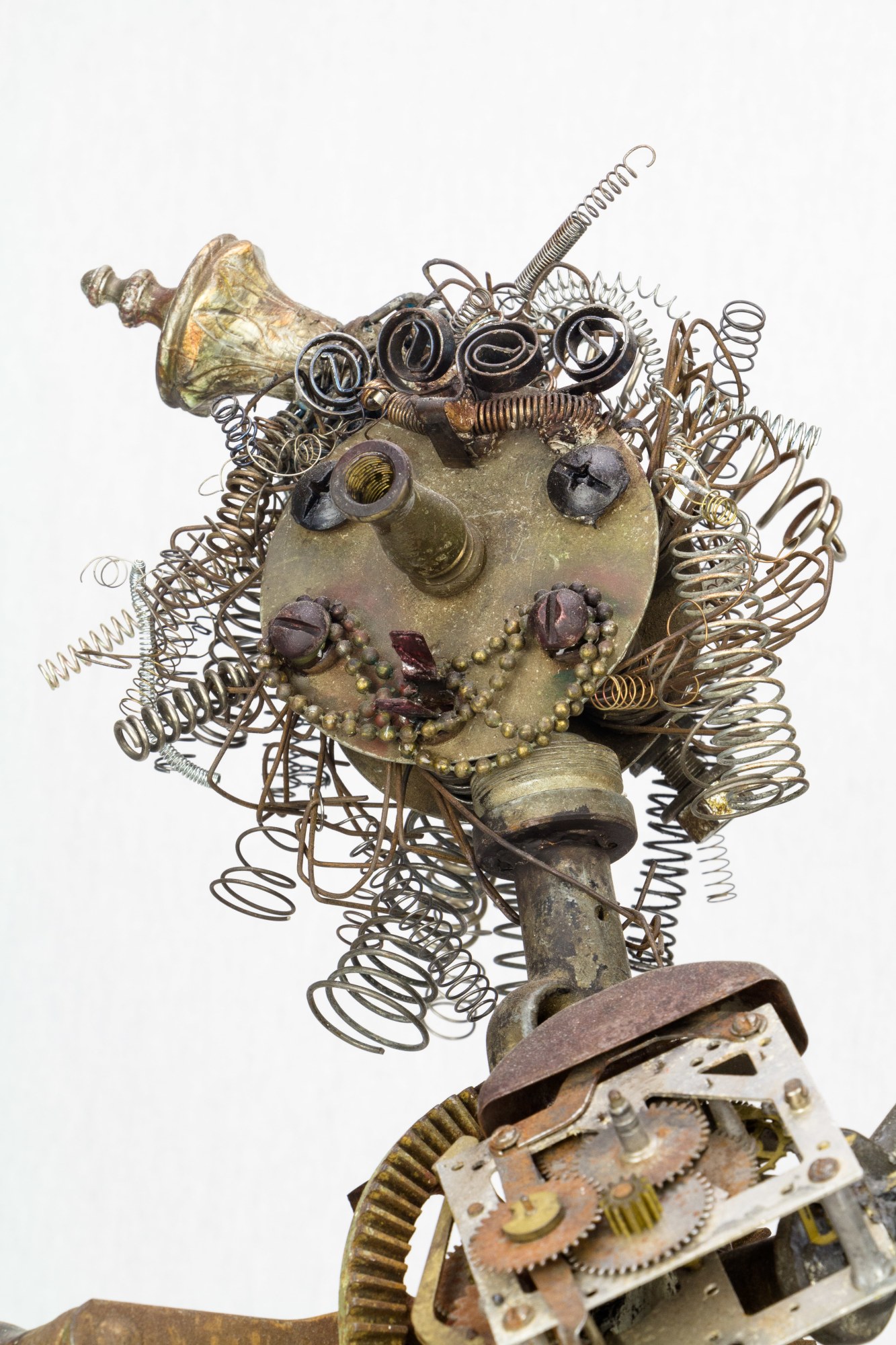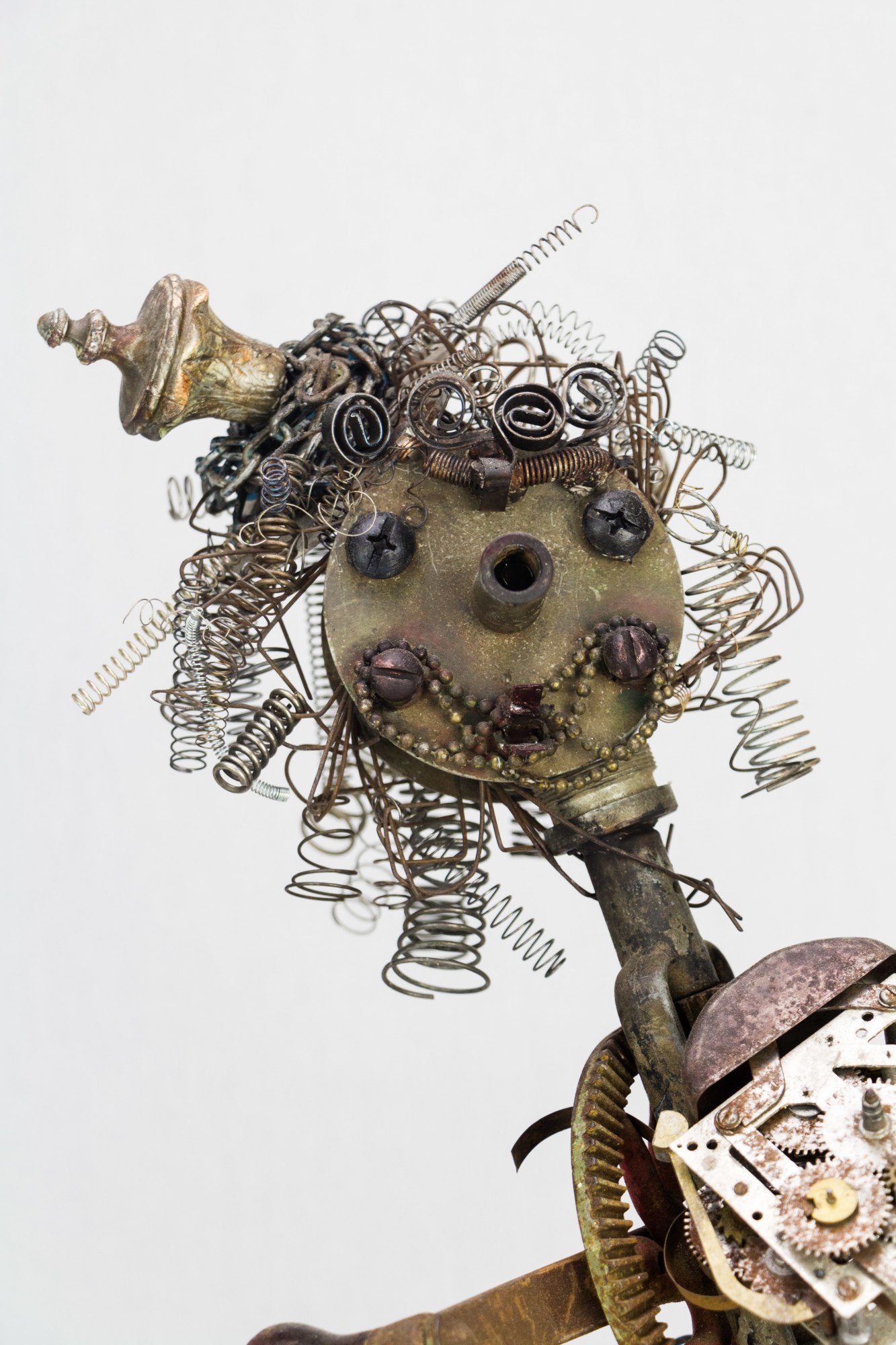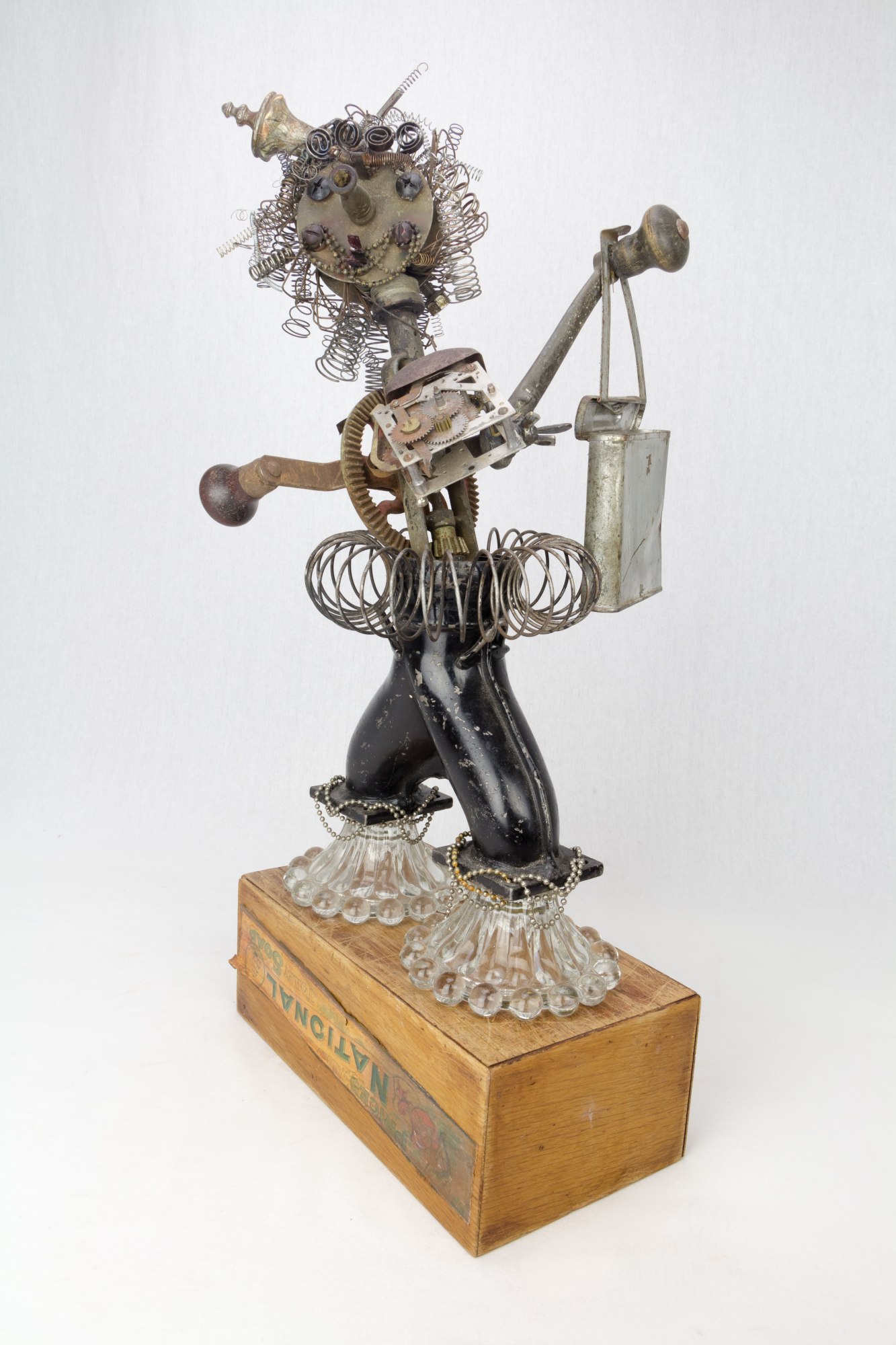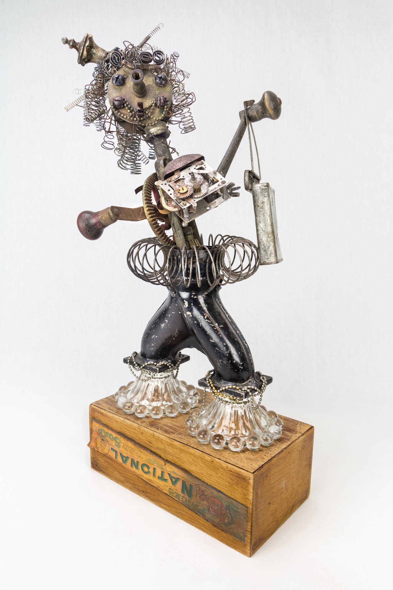 This Soapbox Diva, made of repurposed tossed away objects, stands in her glass slippers, waving her rusty arms demanding attention.