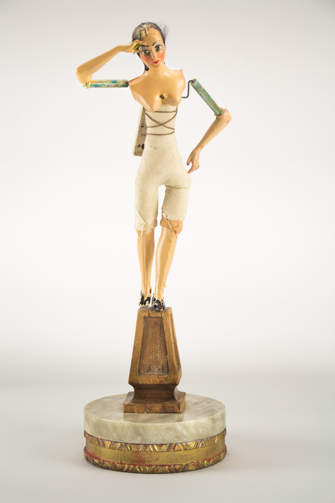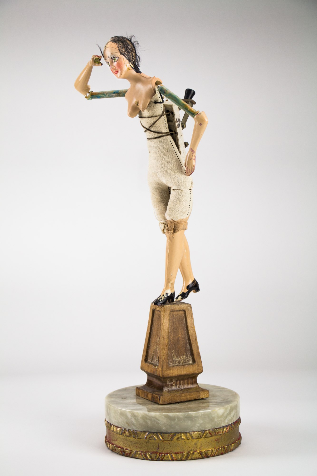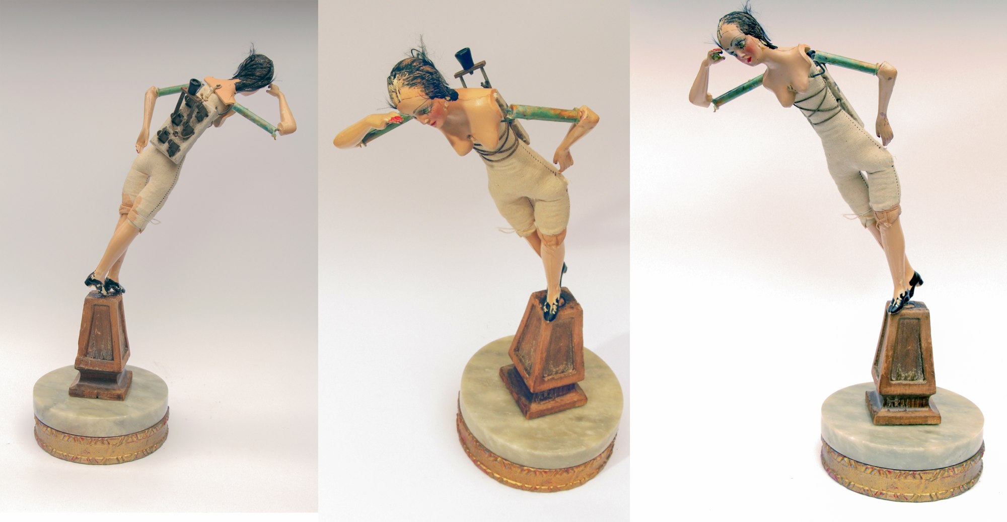 A re-purposed doll body, electrical switch, lamp base and string create someone longing for something lost.