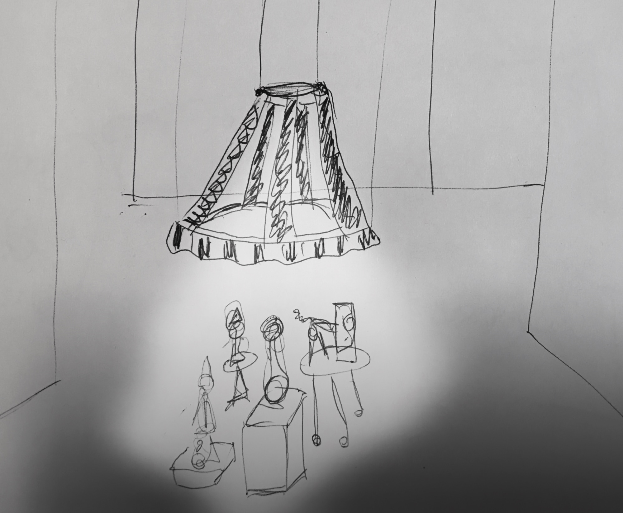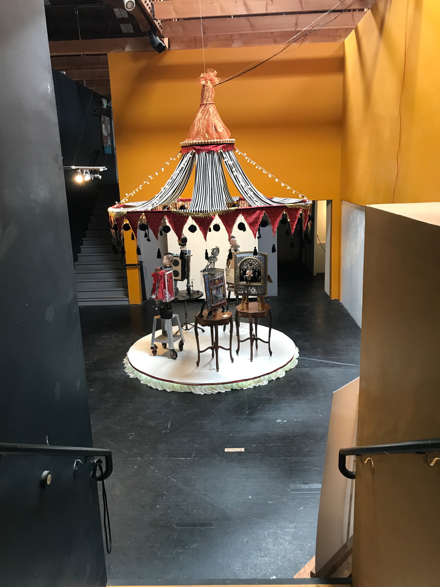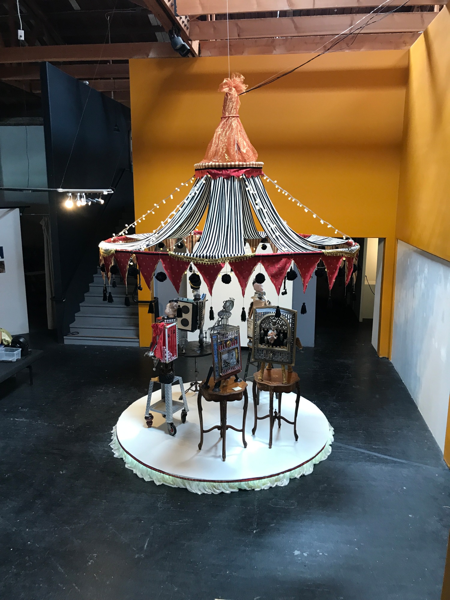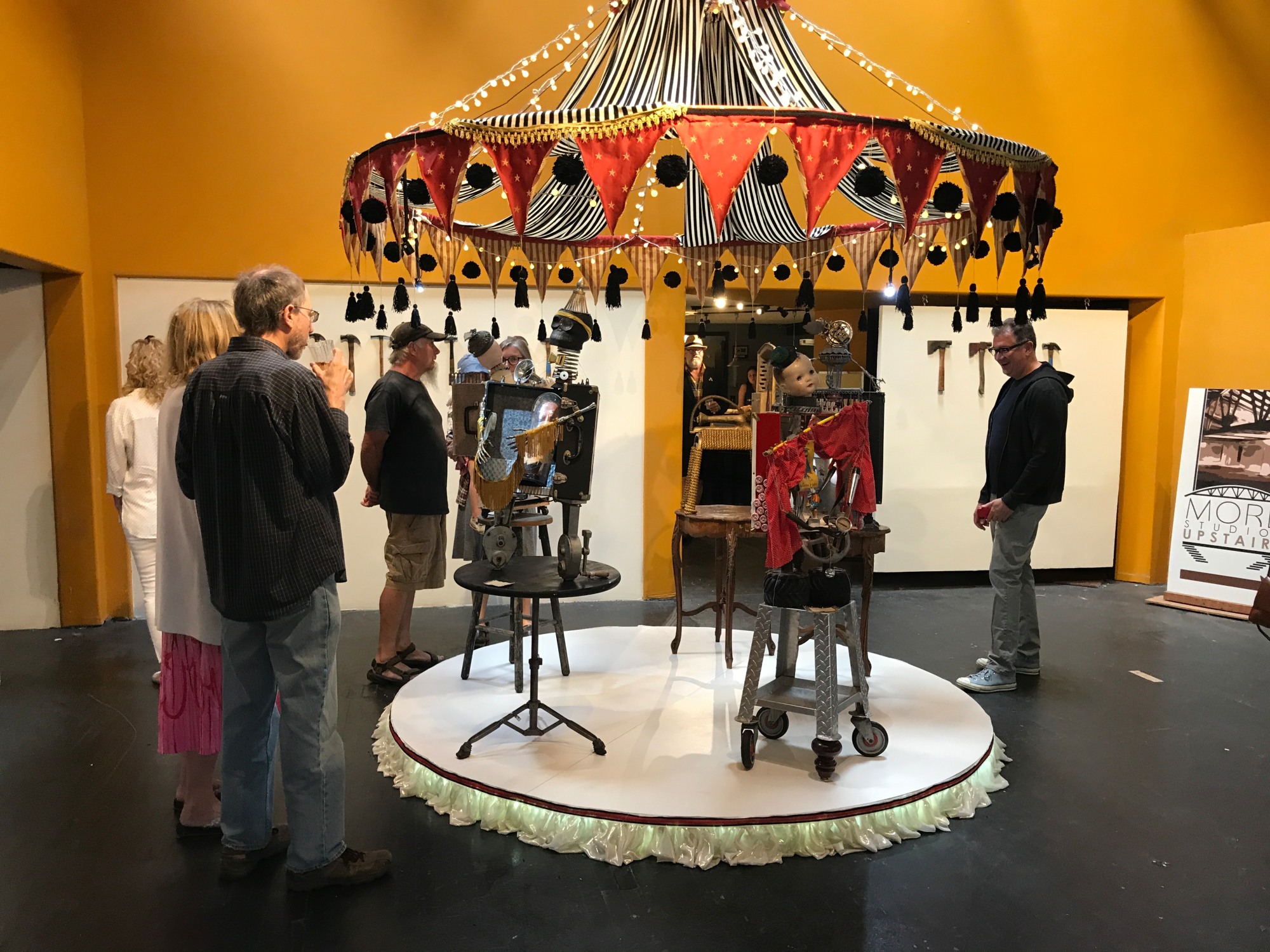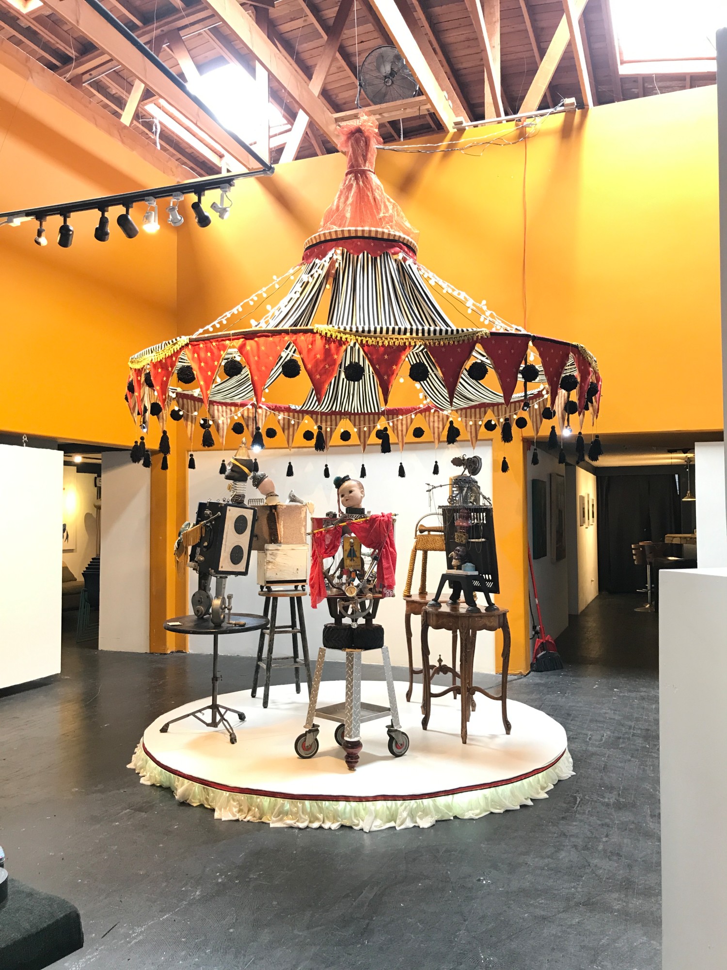 The center of the gallery incorporates a suspended 9-foot wide by 4 foot high hooped canopy wrapped with strips of faded striped canvas interwoven with café globe string lights. Five assemblage sculptures standing 4-5 feet high parade around an 8-foot wide by 6-inch high round stage or riser. The gallery lighting theatrically spotlights each toy on display, showcasing the unique one-of-a-kind story it holds.