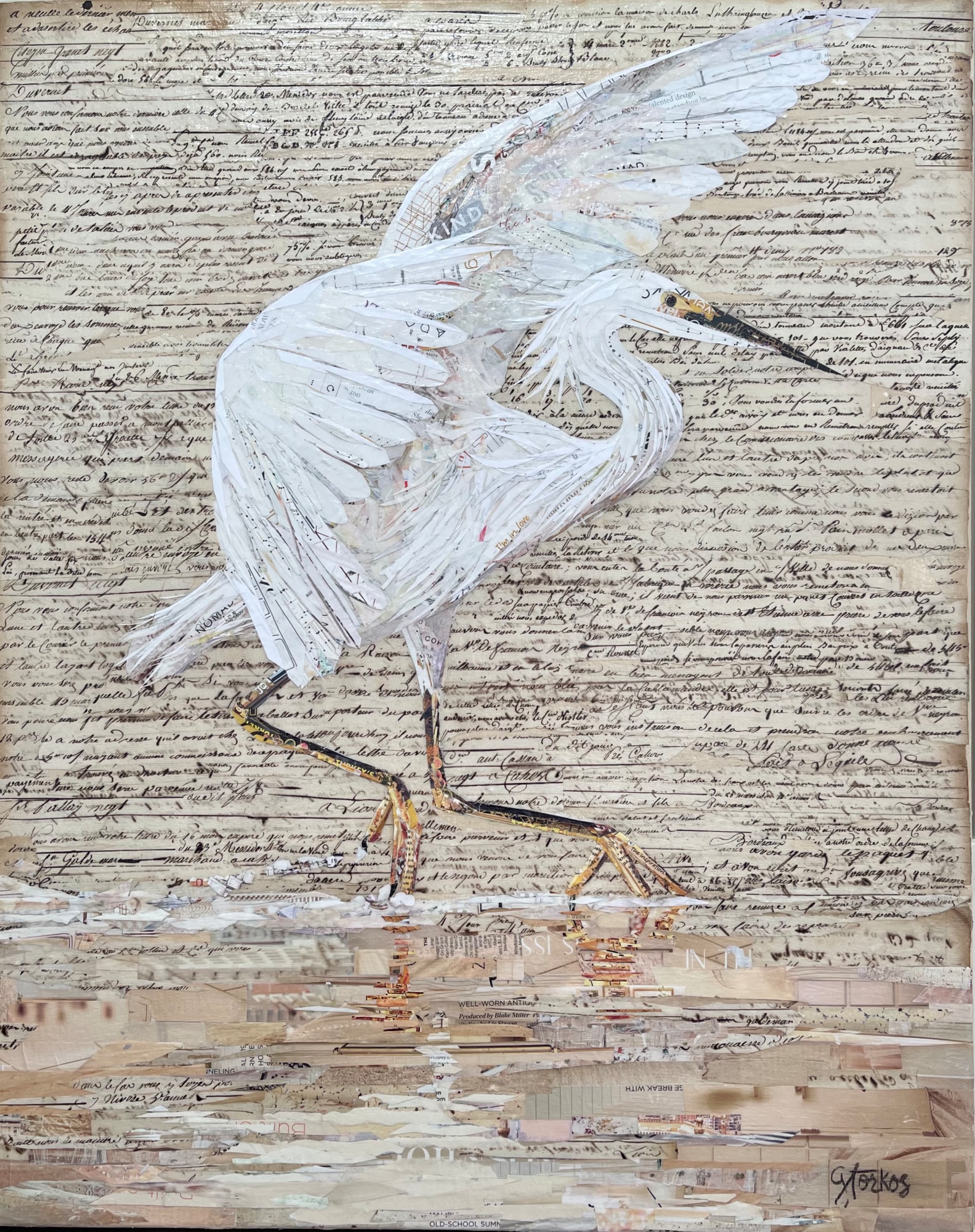 Snowy Egret walking on water. Vintage french ledger sheets in the background