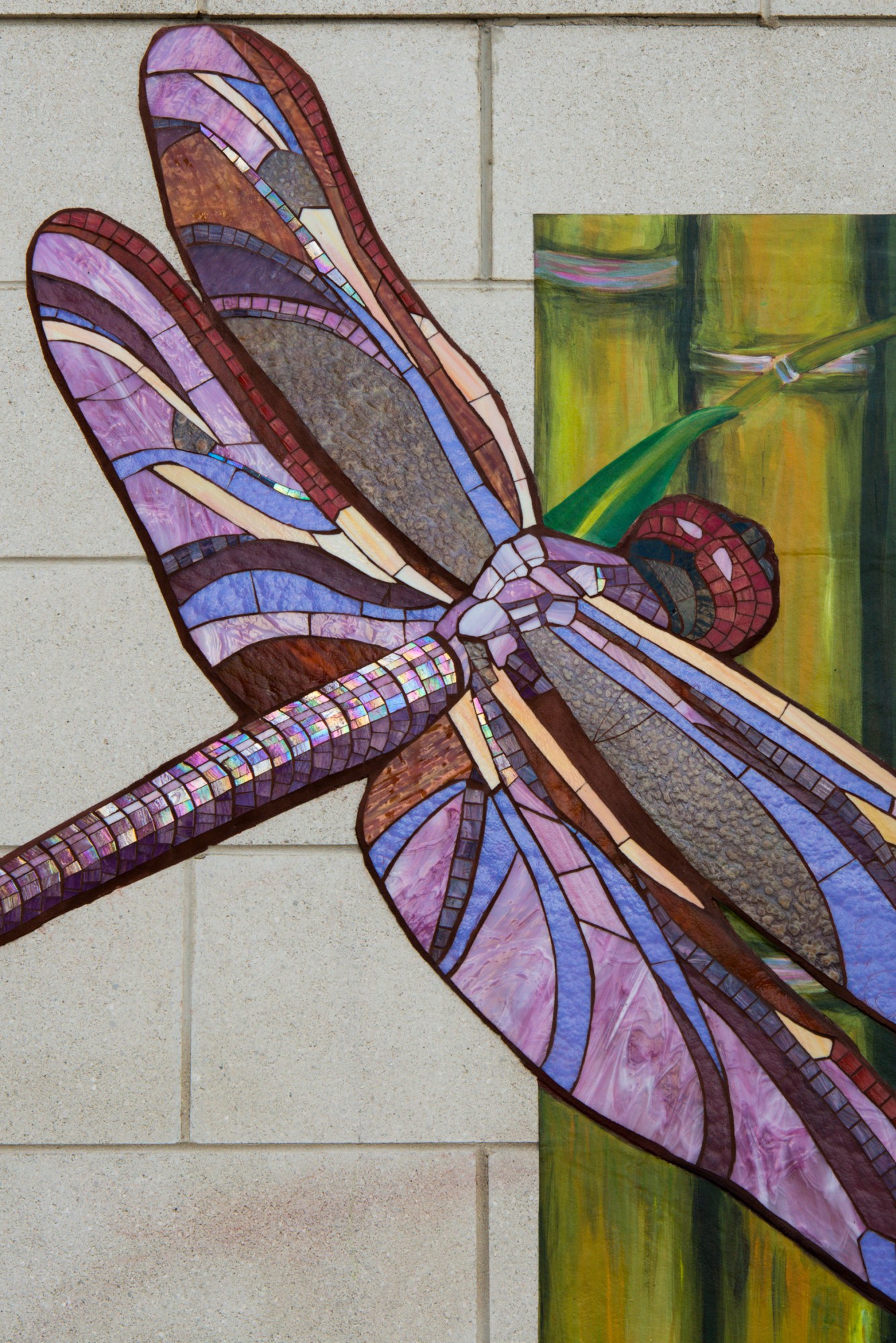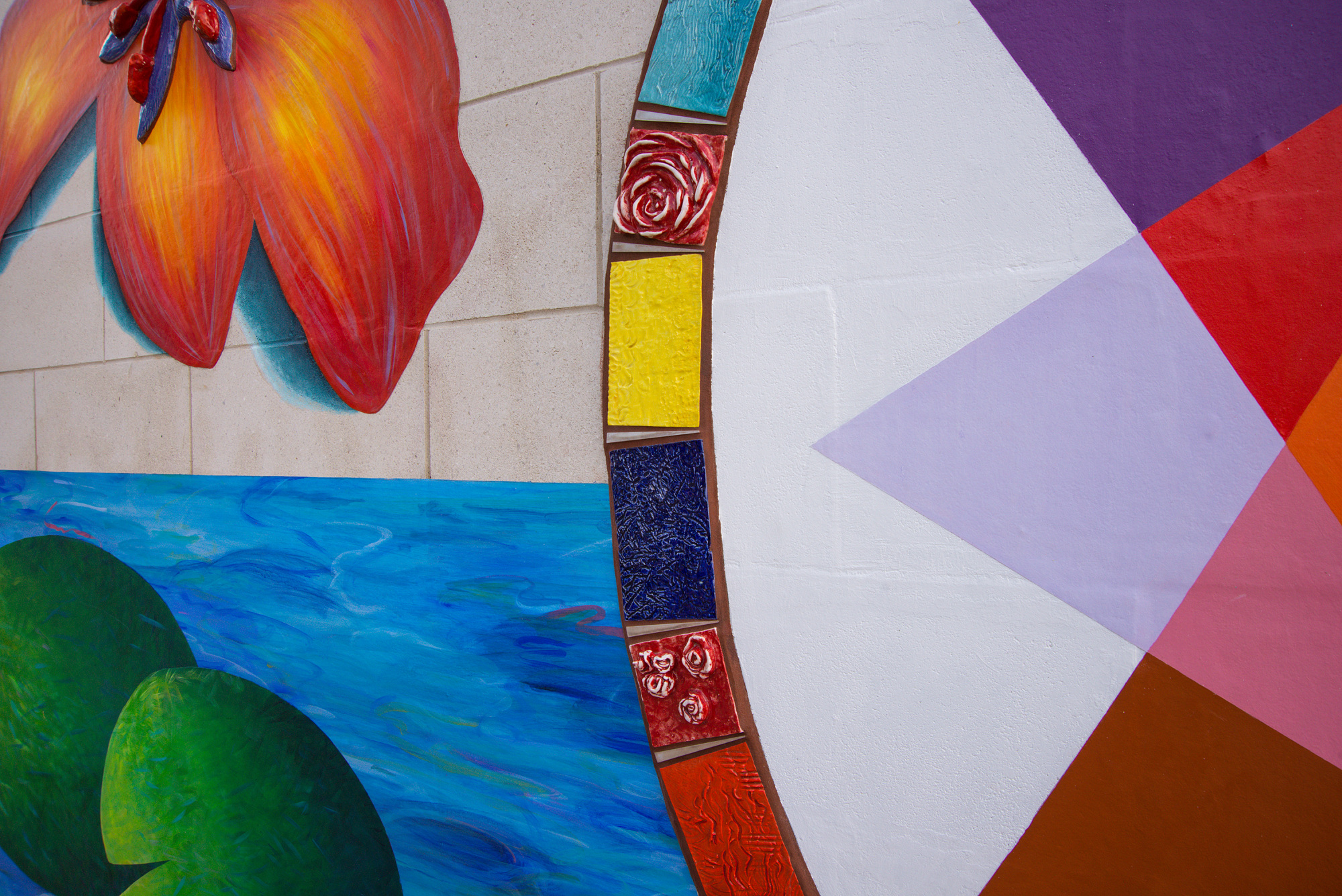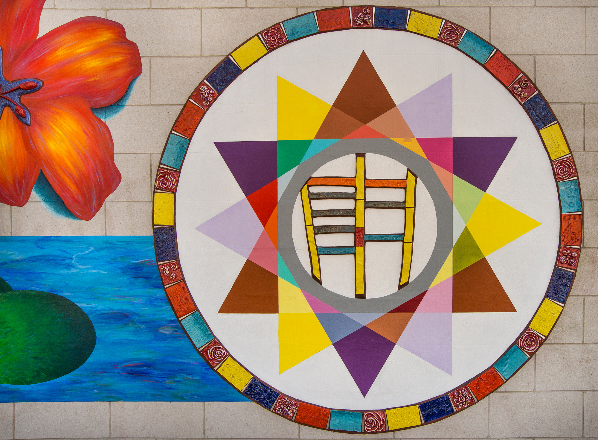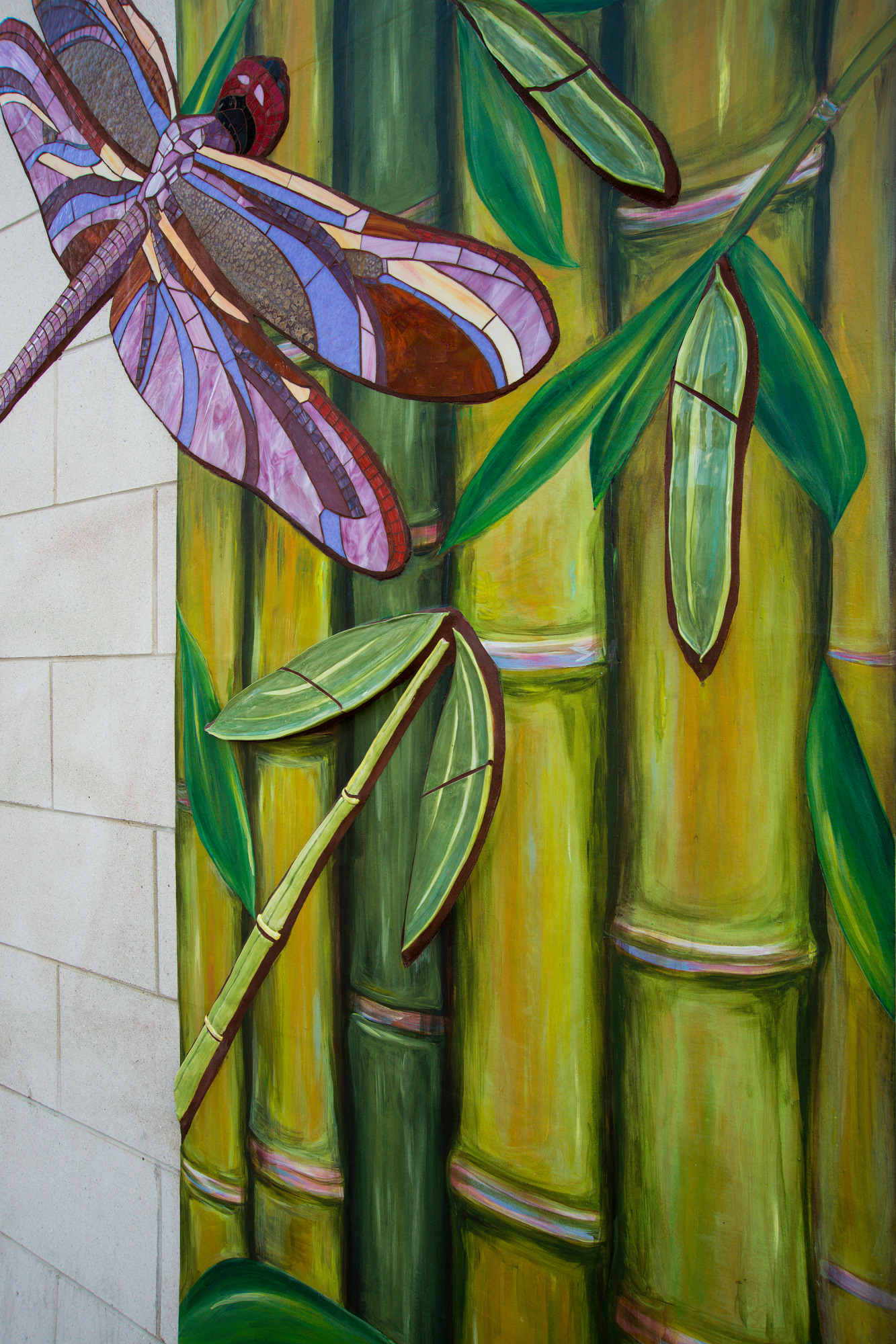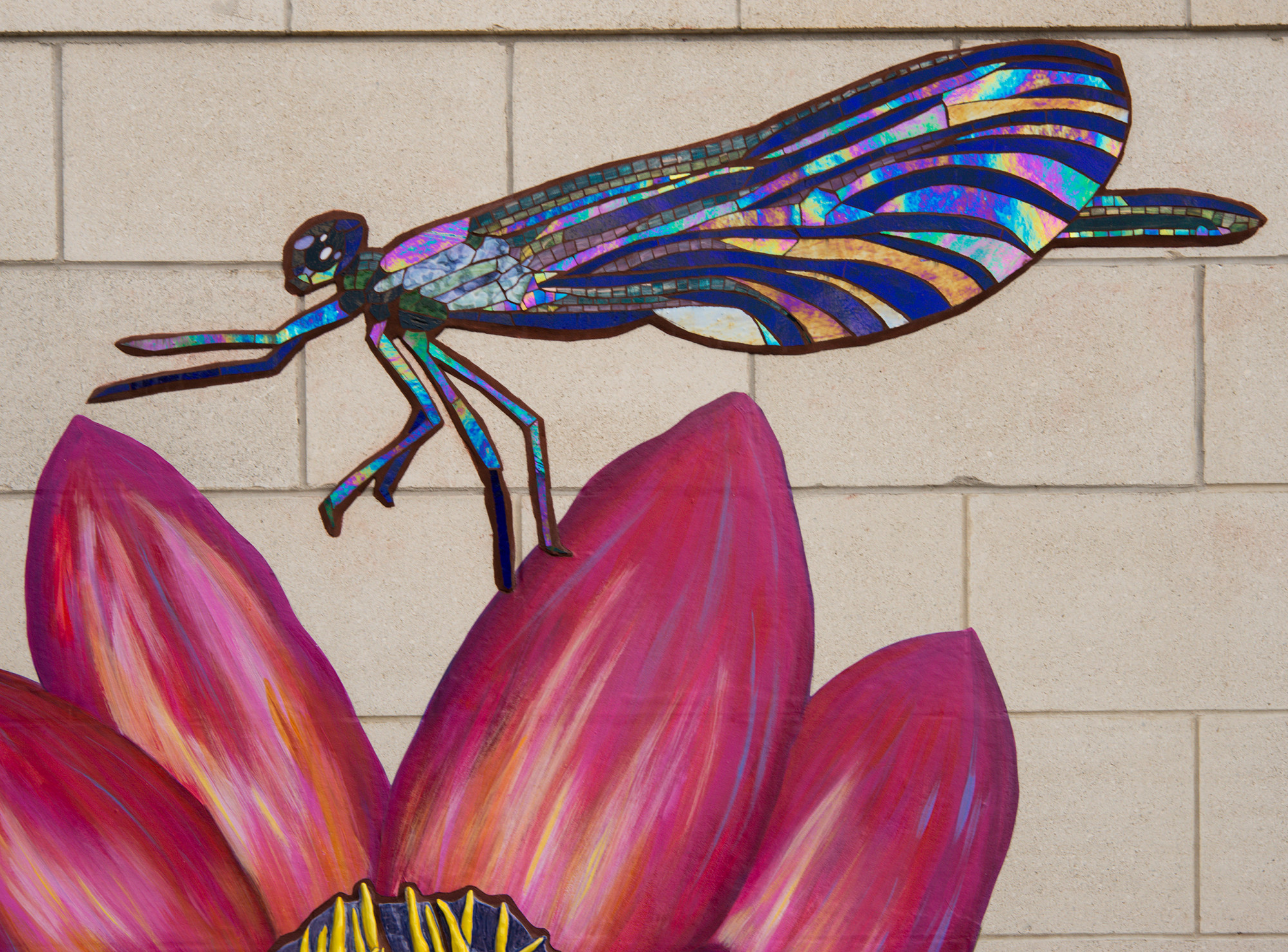 Painted Non-woven Media, Glass Tile Mosaic, and Ceramic Bricolage on exterior wall