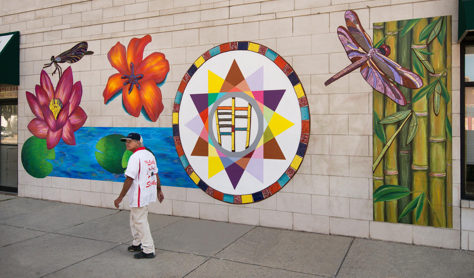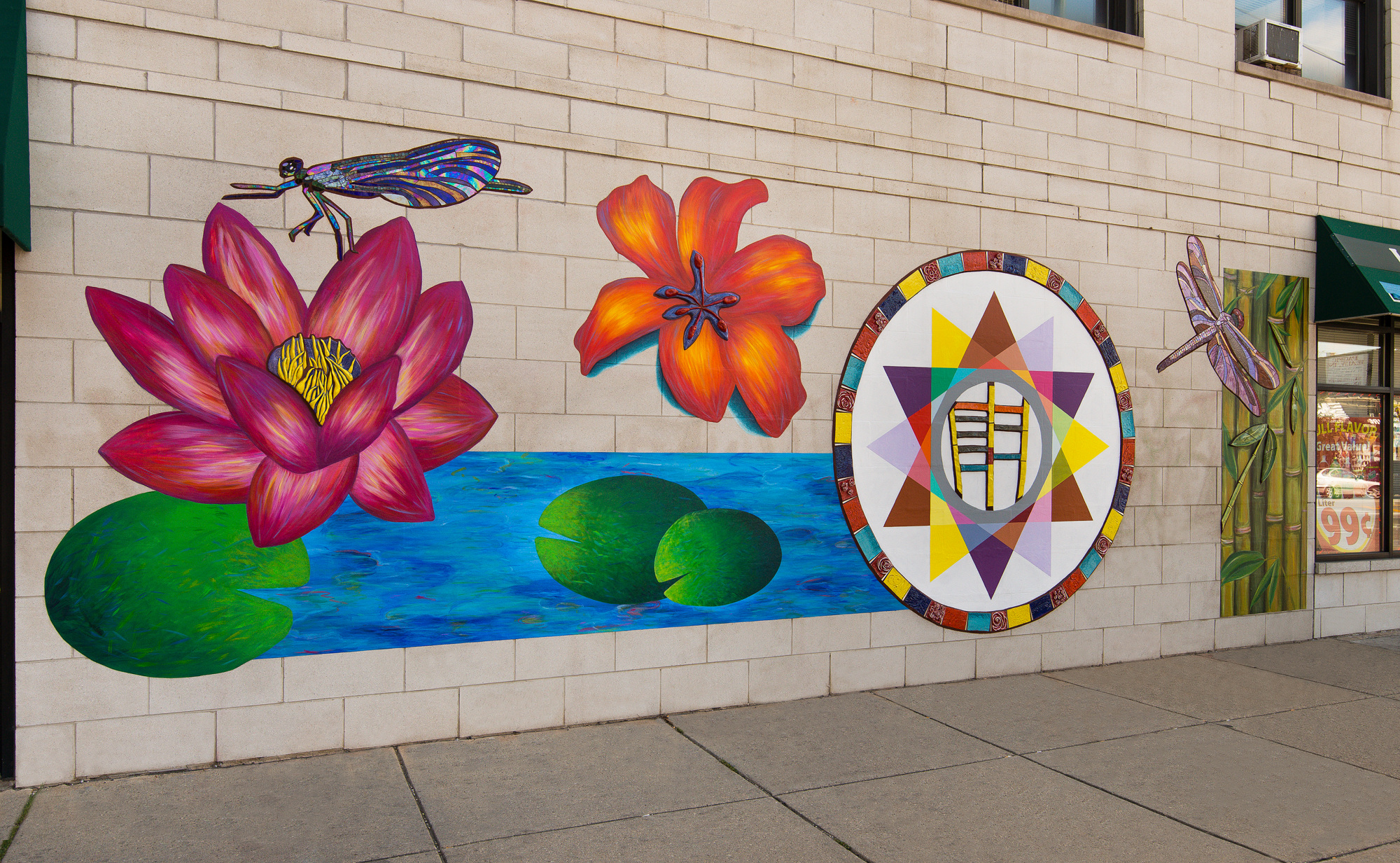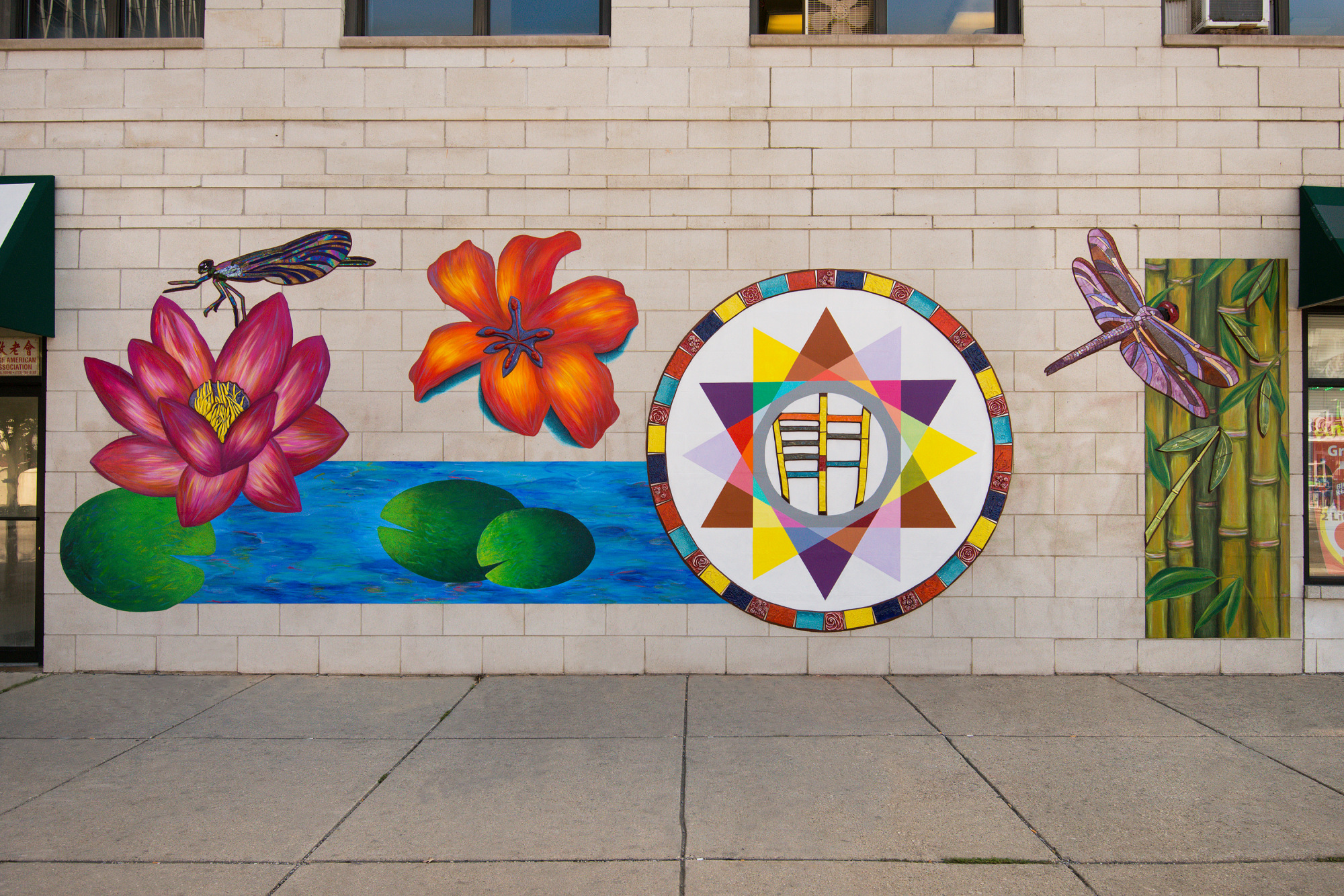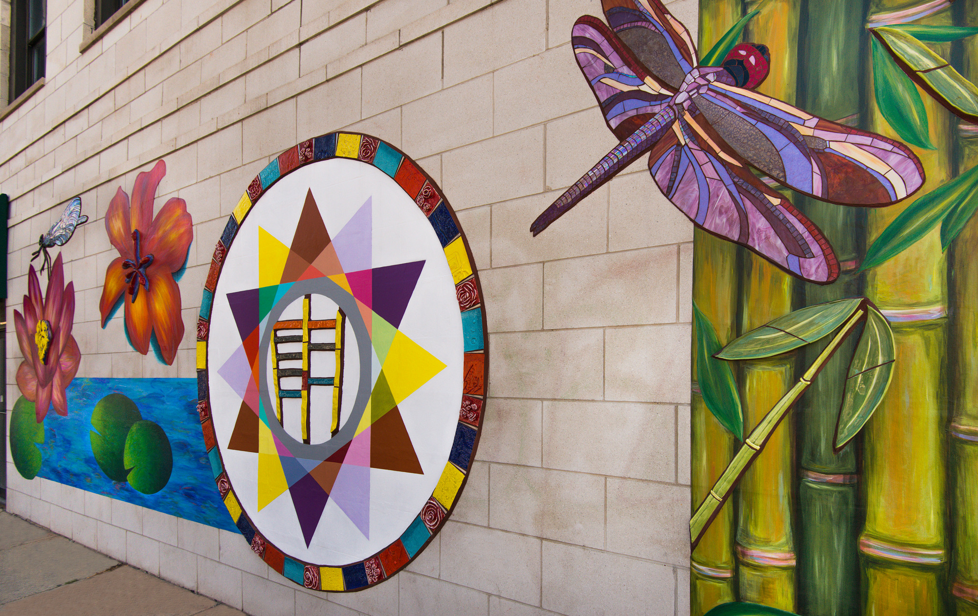 Painted Non-woven Media, Glass Tile Mosaic, and Ceramic Bricolage on exterior wall