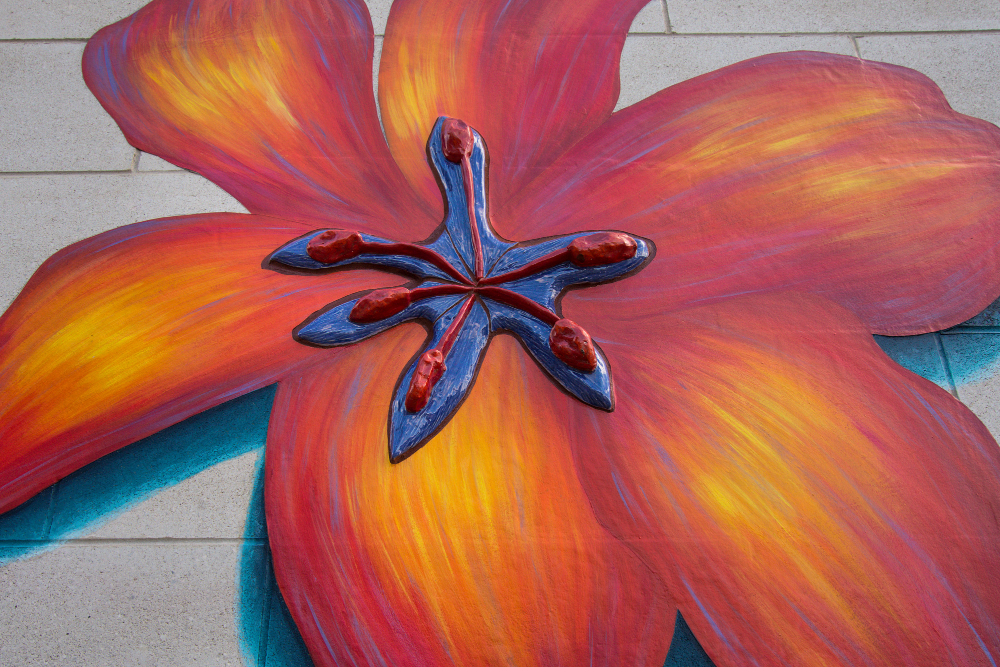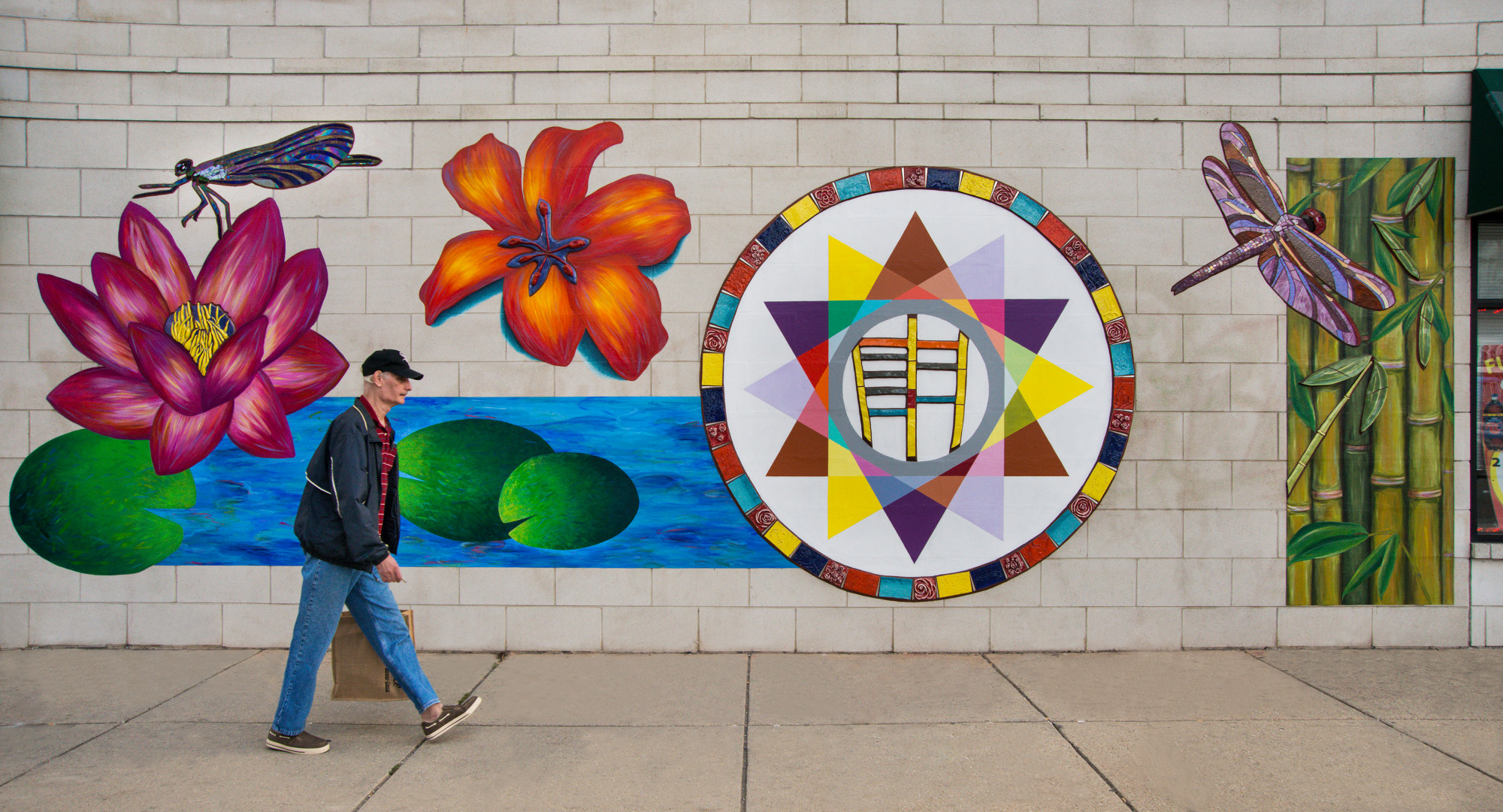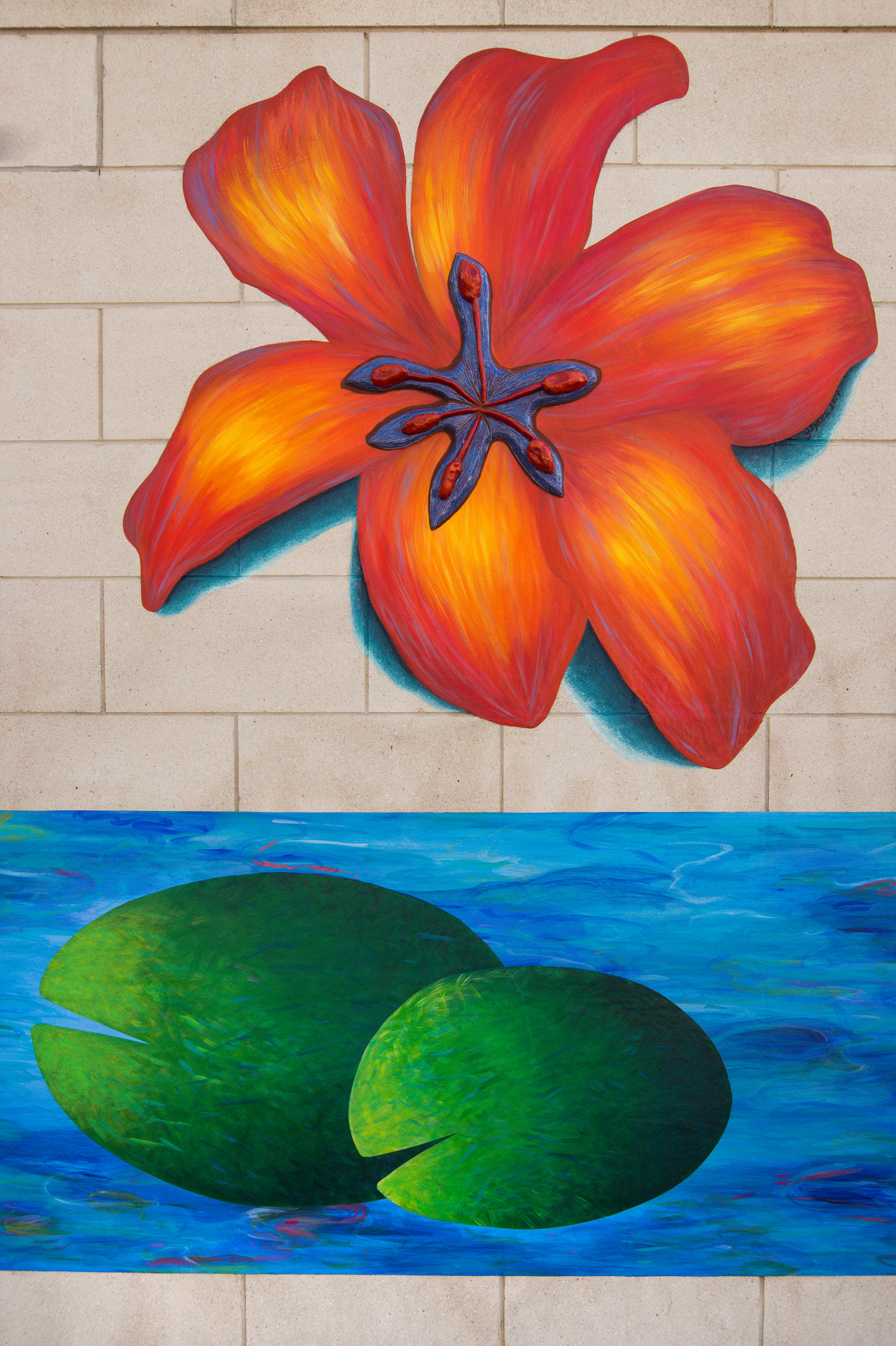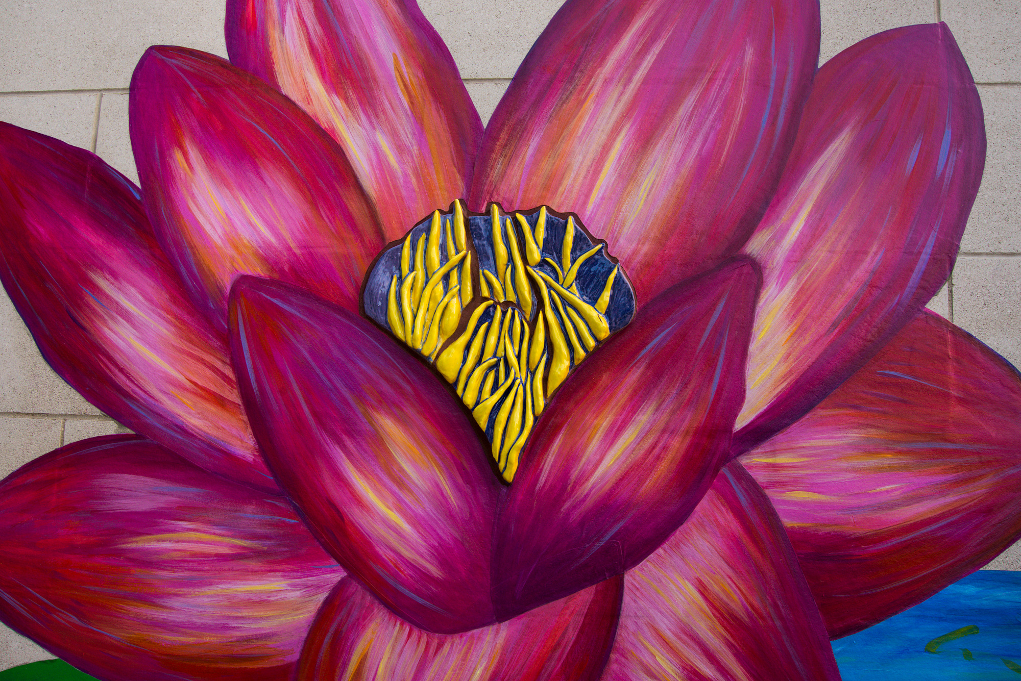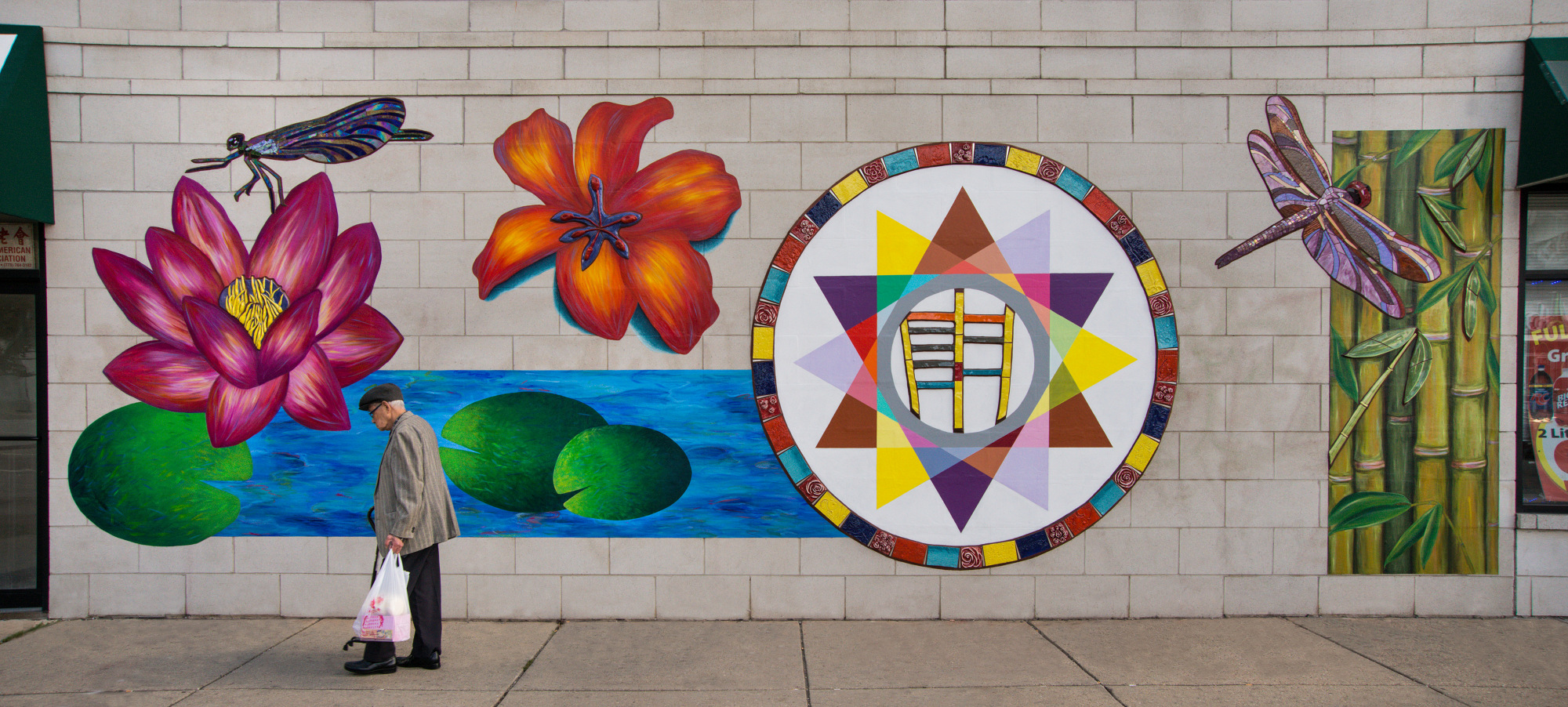Painted Non-woven Media, Glass Tile Mosaic, and Ceramic Bricolage on exterior wall