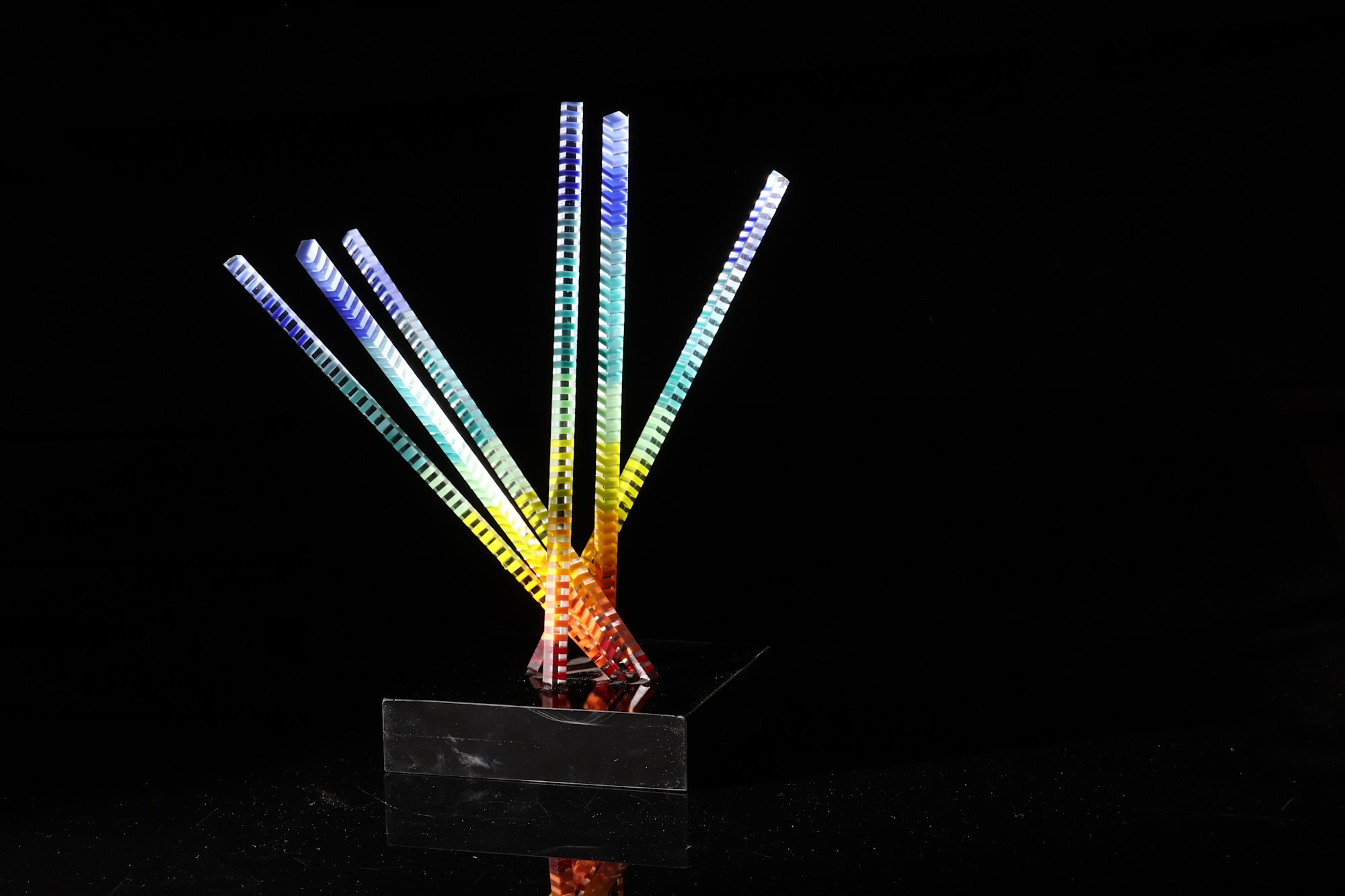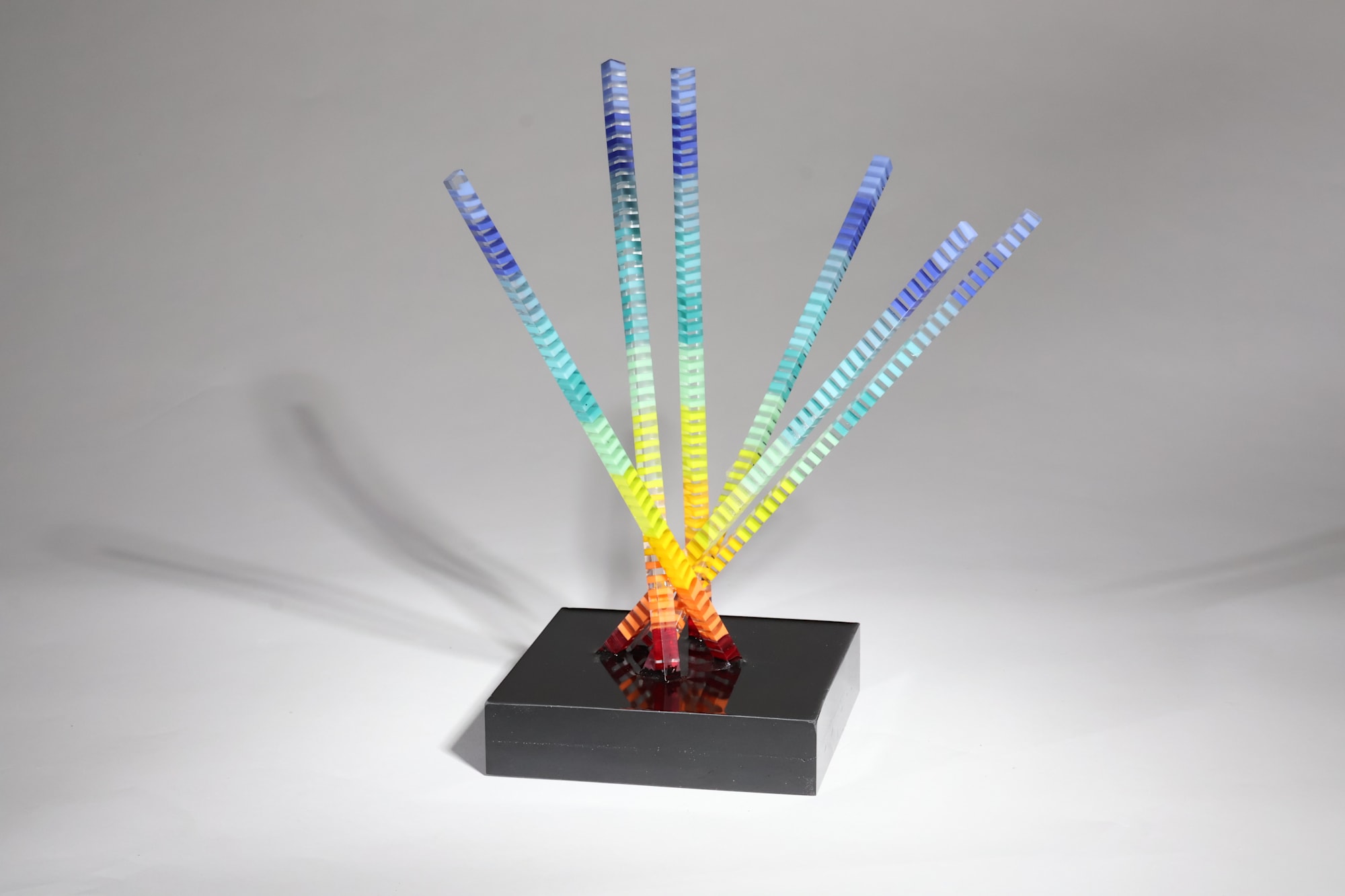 Geïnspireerd door het kinderspel Mikado is dit een glazen uitvoering van de vallende staafjes. De geslepen staven zijn gegoten in epoxy.