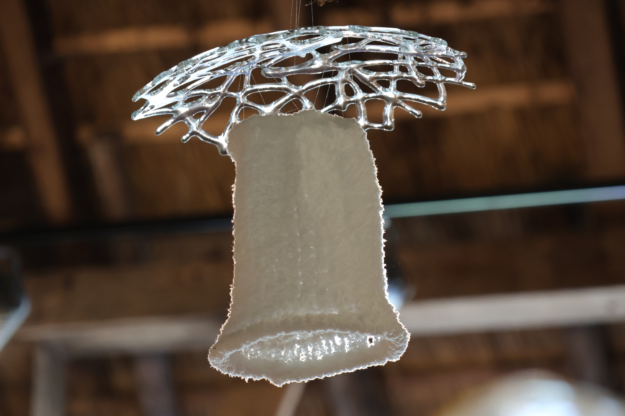 Paddenstoel van kleurloos glas en een witte, gebreide steel van mycellium garen.