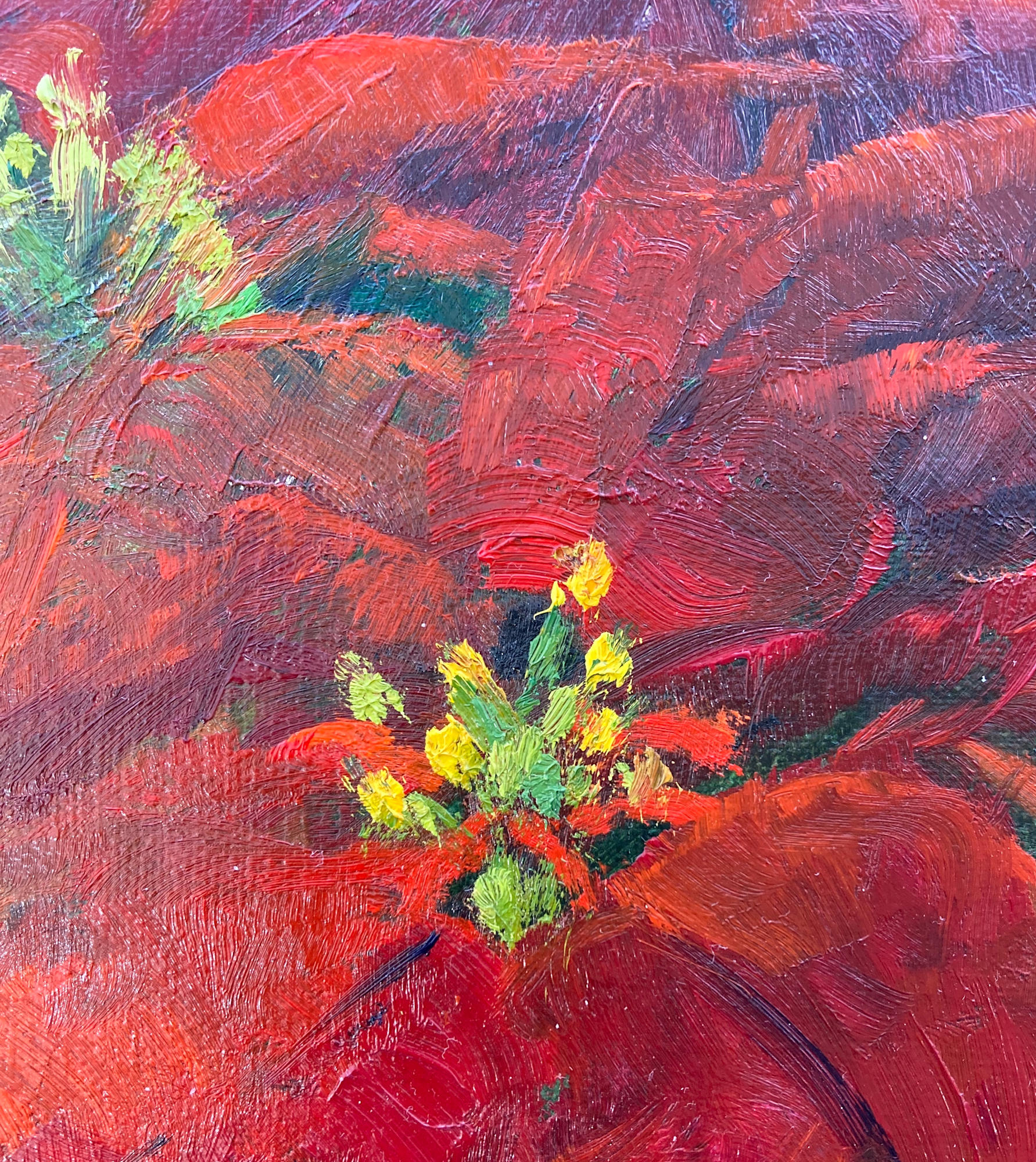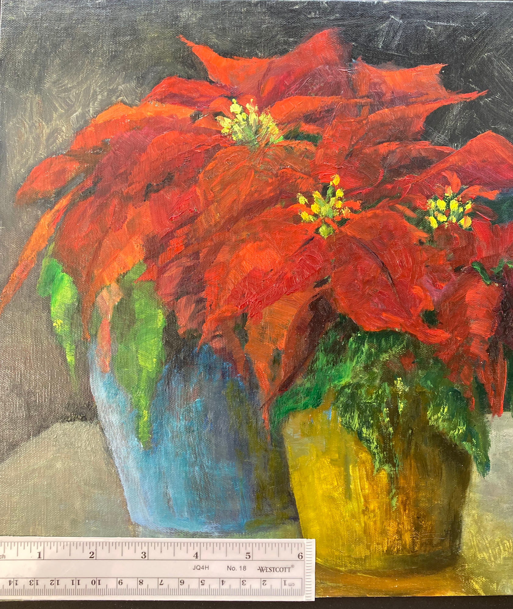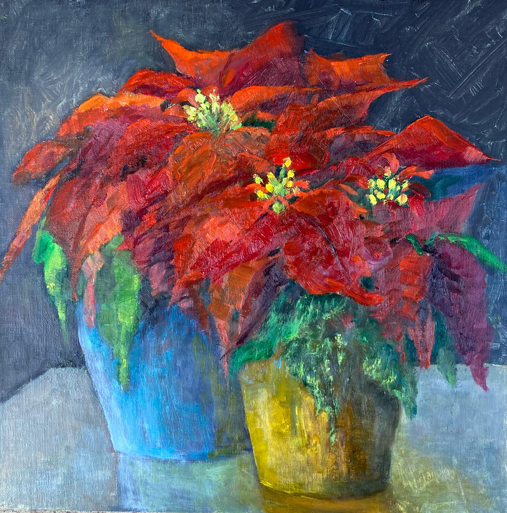 Seasonal maybe, Poinsettias set the bar pretty high for gaiety. The abundance of shades of red in each leaf offset with the deep green of the leaves provide a treat for the eyes, and soul. These two pots were destined for the dining table centerpieces before being detoured to the porch for painting. The artist couldn't resist doing a quick Alla Prima.