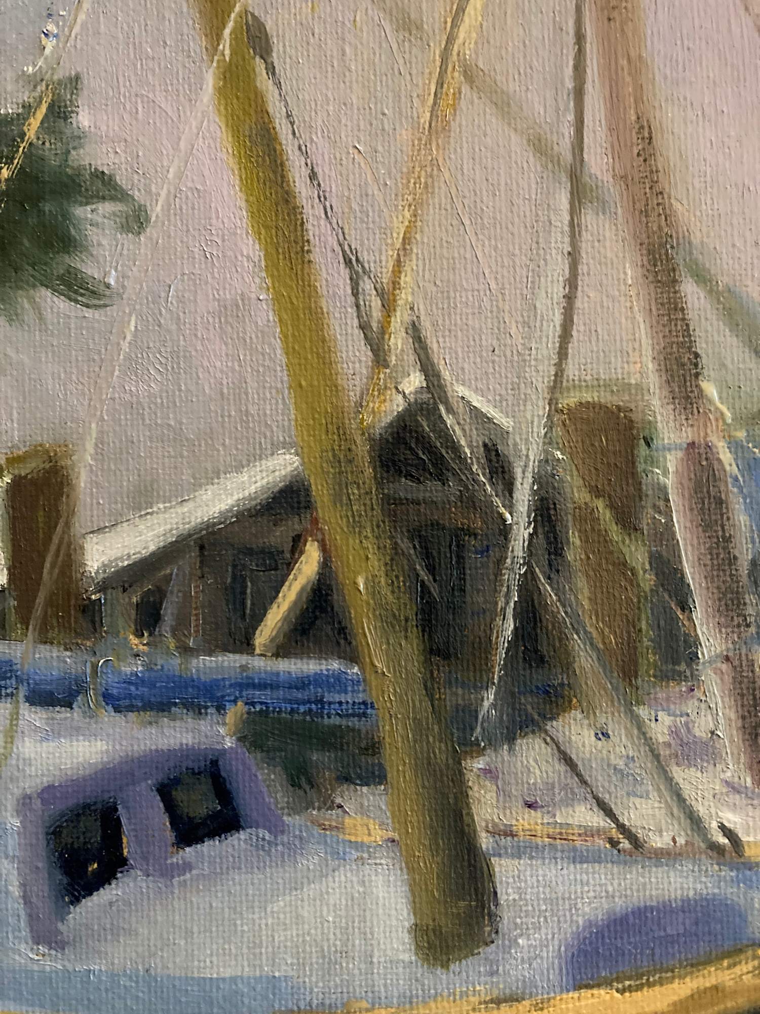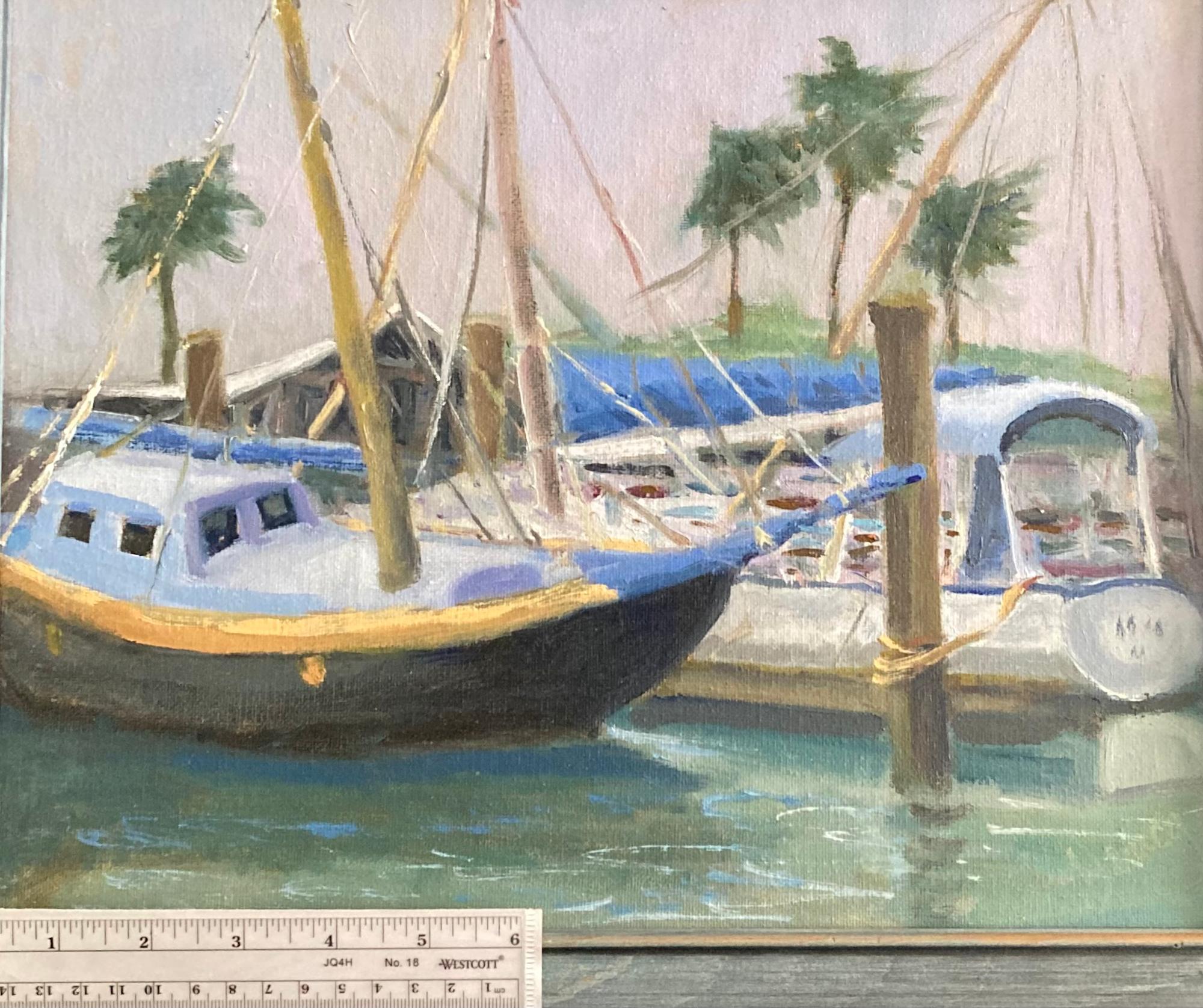 Sailboats can't always be out on the open seas, sometimes they need to rest. On this very gray day there seemed to be several blue/white colored sailboats moored side by side making for such a harmonic scene.