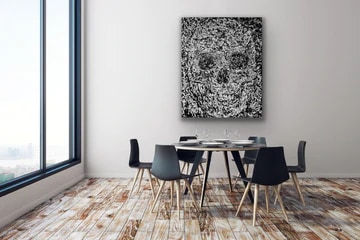 Black and white vanitas painting on canvas.