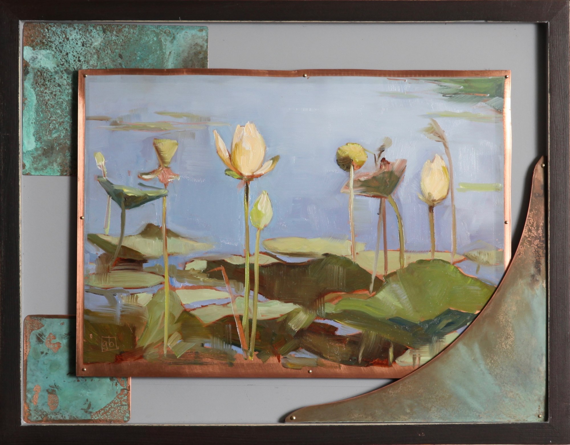 Like the lilies, we can rise to all circumstances. As I applied the patina to the copper I began to see the same colors that I saw when the sun hit the waters. I love the way the natural oxidized colors blended and worked with the oil paint. “Life is full of beautiful surprises!”