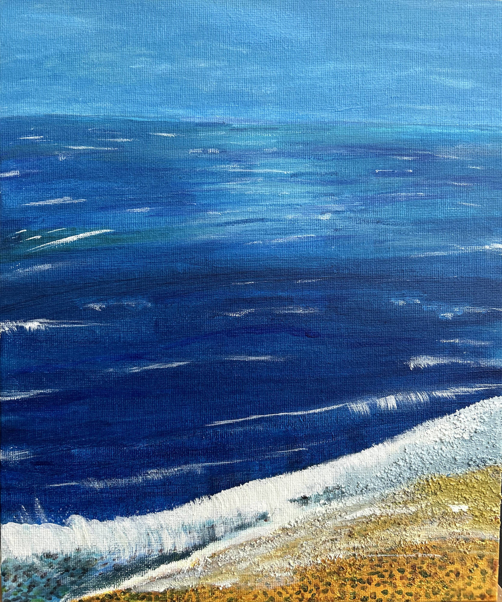 This acrylic painting captures a serene empty beach to which a family have just arrived to spend the day. The vibrant blue ocean, with its gentle white waves, effectively conveys the soothing rhythms of water meeting the shore. The gradient of the blues suggest varying depths, creating a dynamic yet calming visual experience that draws the viewer in.