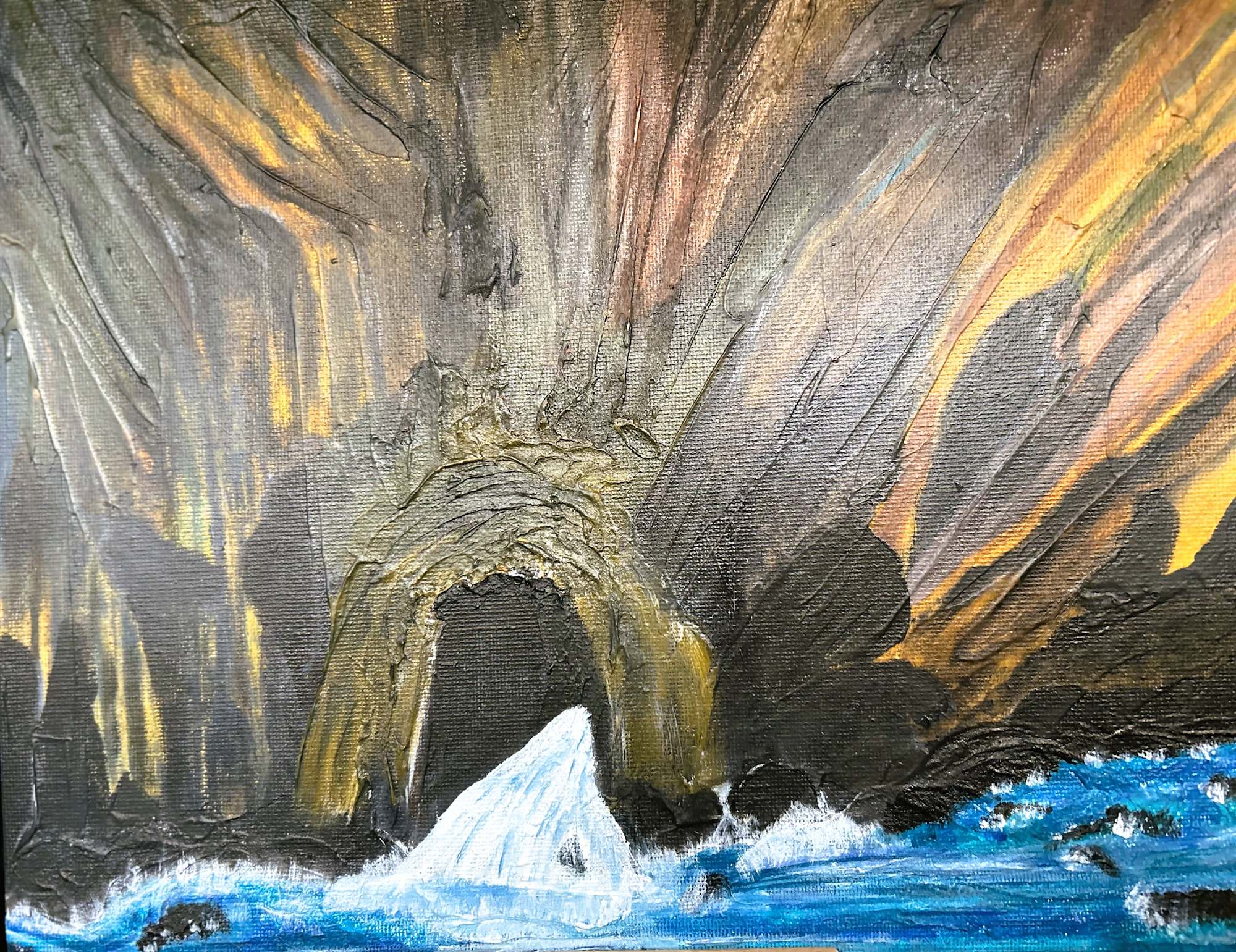 A significant portion of the piece seems to portray a cave-like or rocky formation, with varying textures and depths of color, that give a sense of depth.