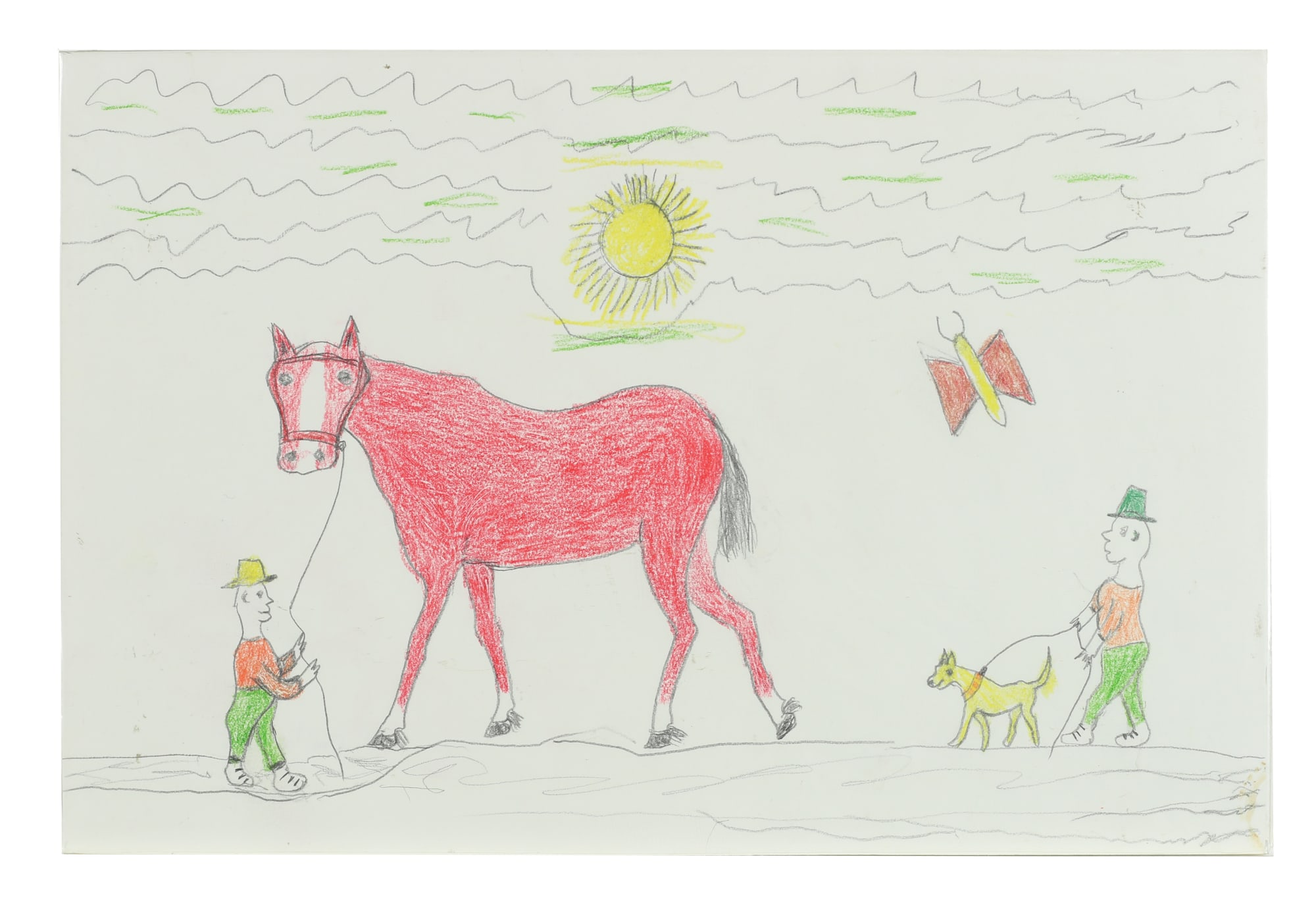 MessageMan holding a horse. Another man walking a dog. A butterfly flying and a sun above.