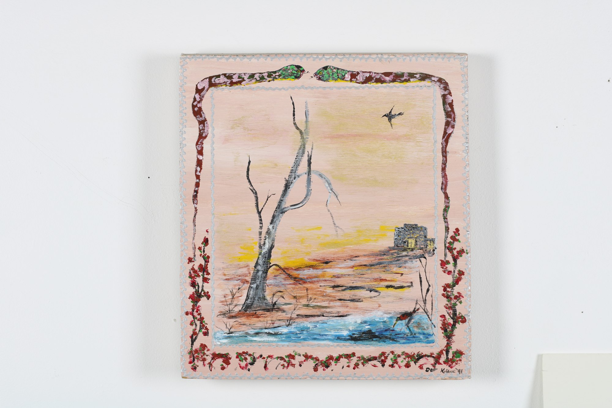 MessageDead tree, small pond, and a distant building. Pink and glittery golden sky in background. Border with two snakes.