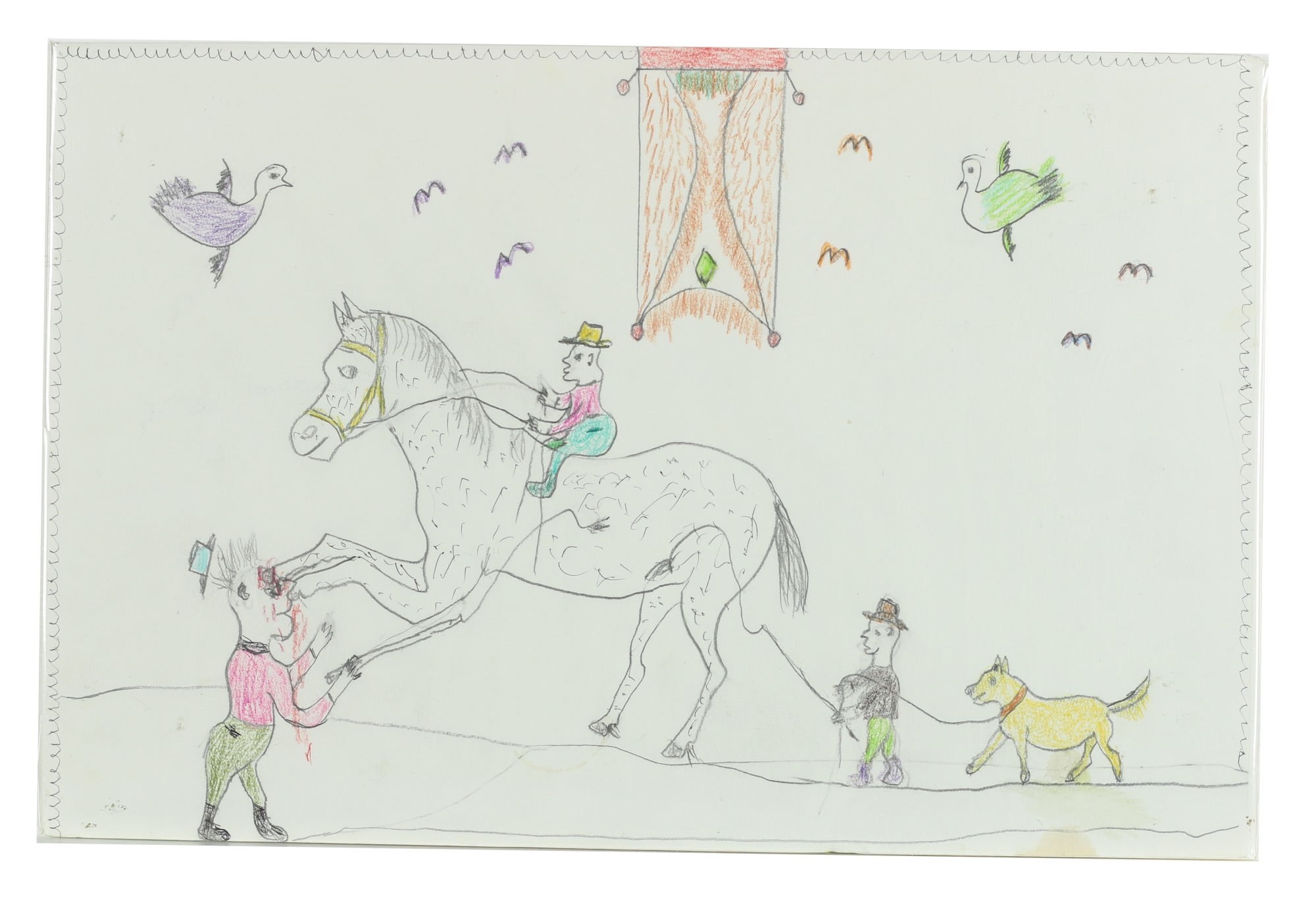 MessageMan riding a horse. Horse goring a standing man. Another man whipping a horse and pulling a leashed dog.