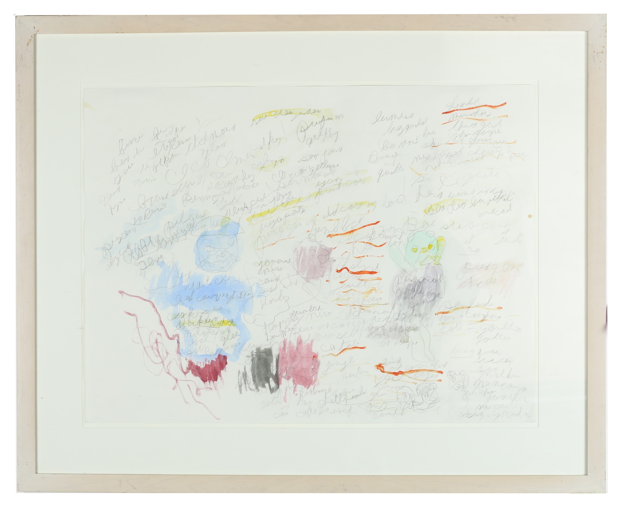 Graphite and marker text, graphite figures, yellow and orange watercolor areas