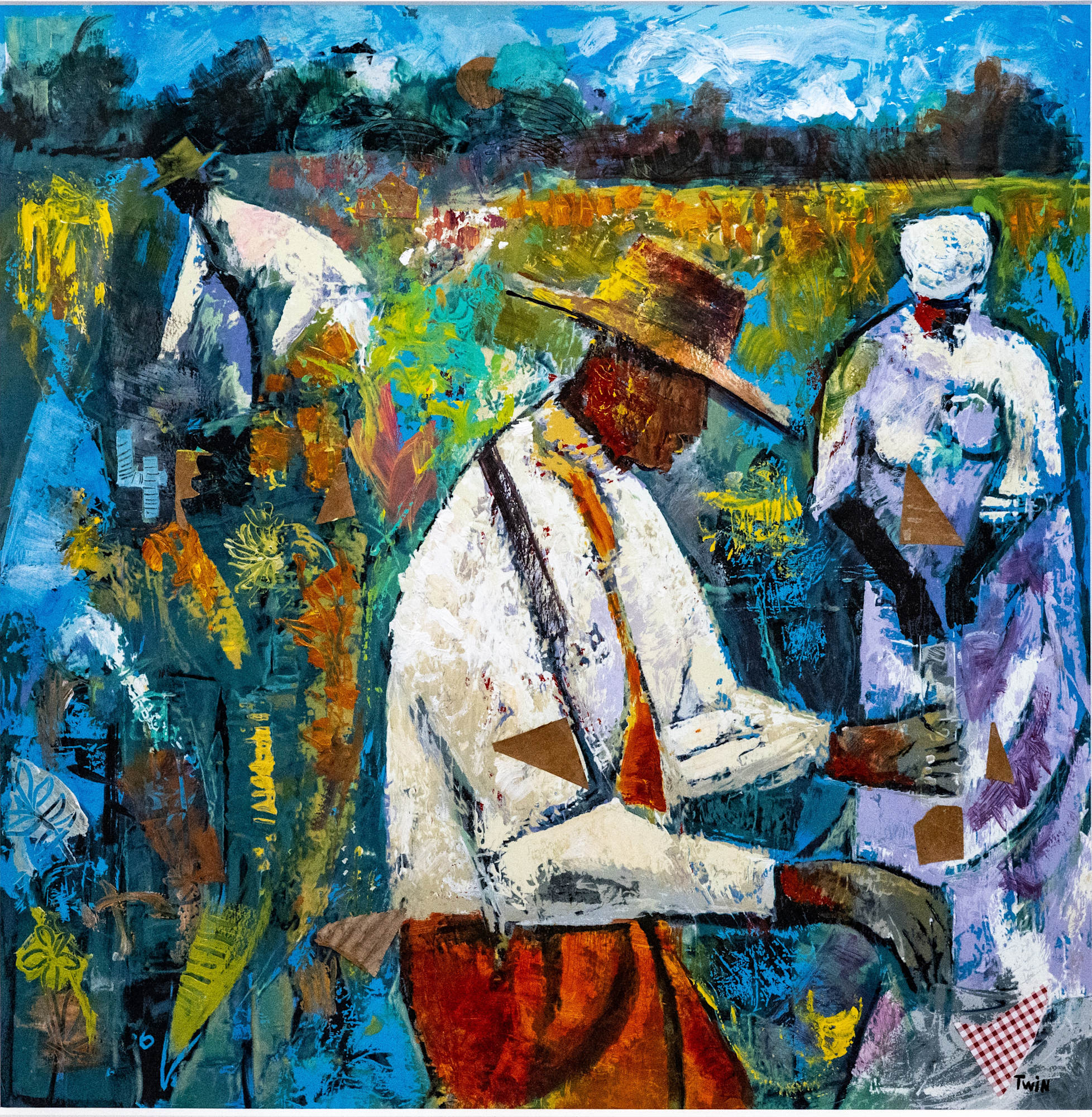 Oil paint, oil stick, paper collage, cardboard, and acrylic on