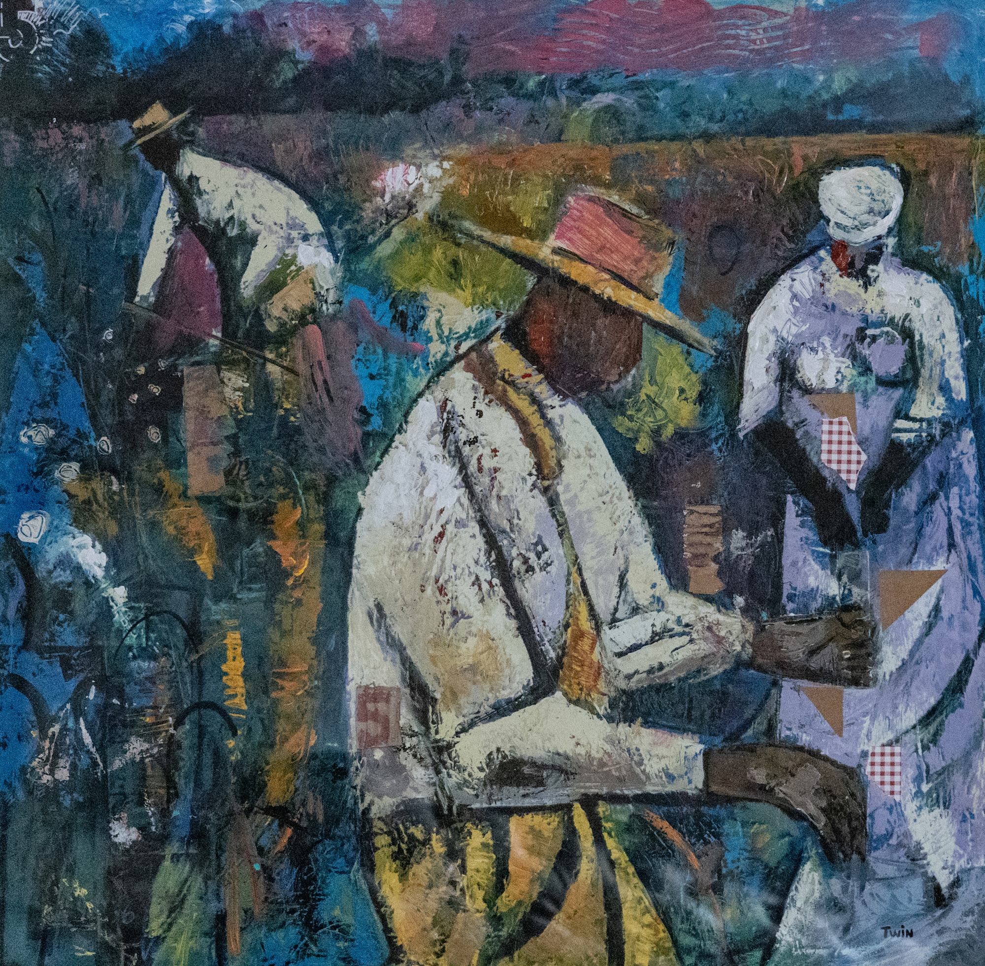 Oil paint, oil stick, paper collage, cardboard, and acrylic on