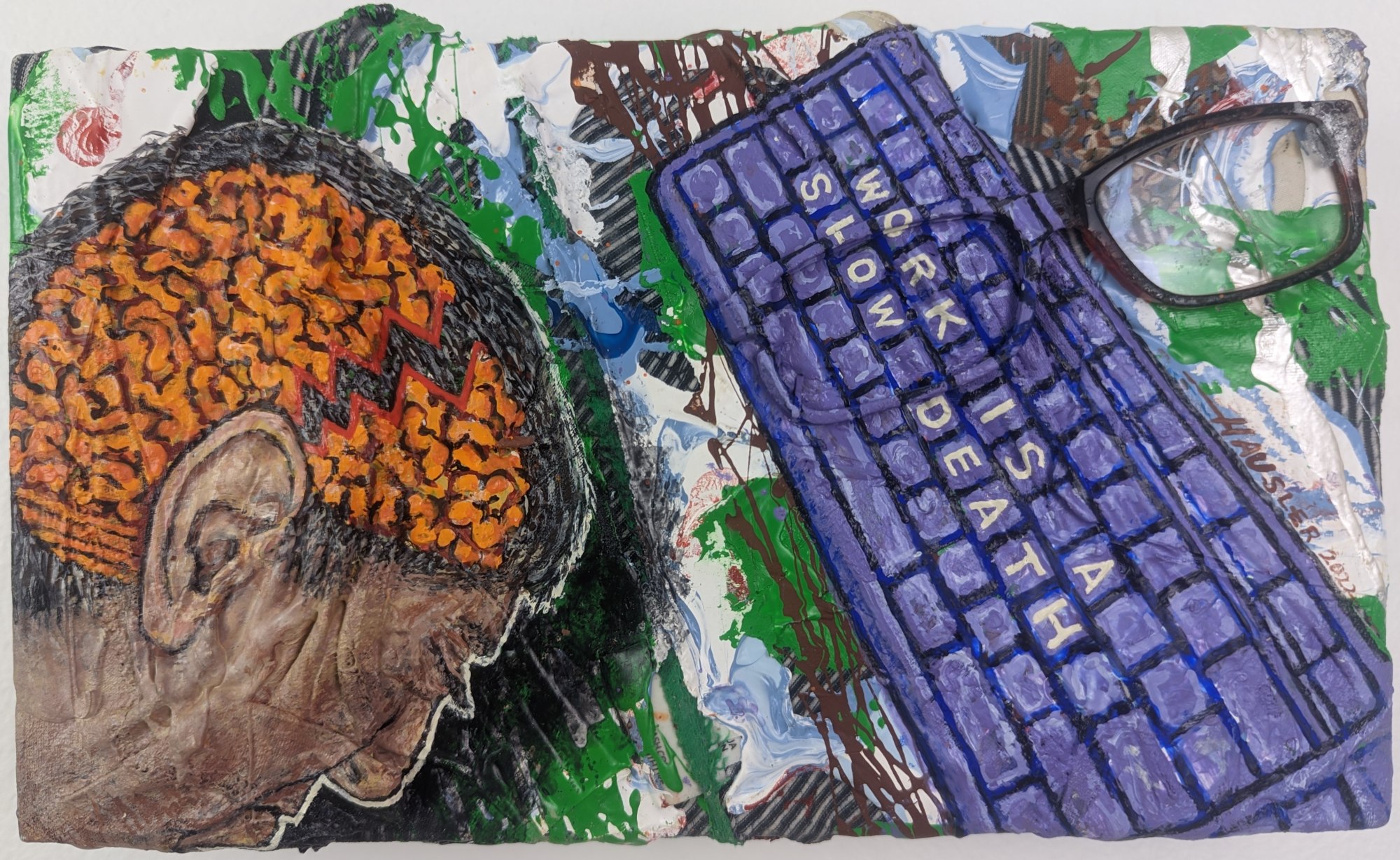 Work. Sometimes it’s a joy, for most not. This painting is one of the most obvious in subject matter that I have done in a while, perhaps ever. I was laid-off the day just prior to completing it. It is frustrating to work at a job when you aren’t appreciated for your efforts. Sometimes you just know that a downsizing is coming but that doesn’t help when you are finally let go. This painting, like many I do, sat at the “well what are you going to paint on it?” stage for months. It happens. What also happens is that the visual can pop into my head and in a short period of time, I bring it to life. This is one was a form of emotional release in the form of a self-portrait. The act of painting helped, more so than normal. My first painting as a child was entirely an emotional release. Here, there is some humor in the piece, a universal humor. Who among us hasn’t had a bad day at work?