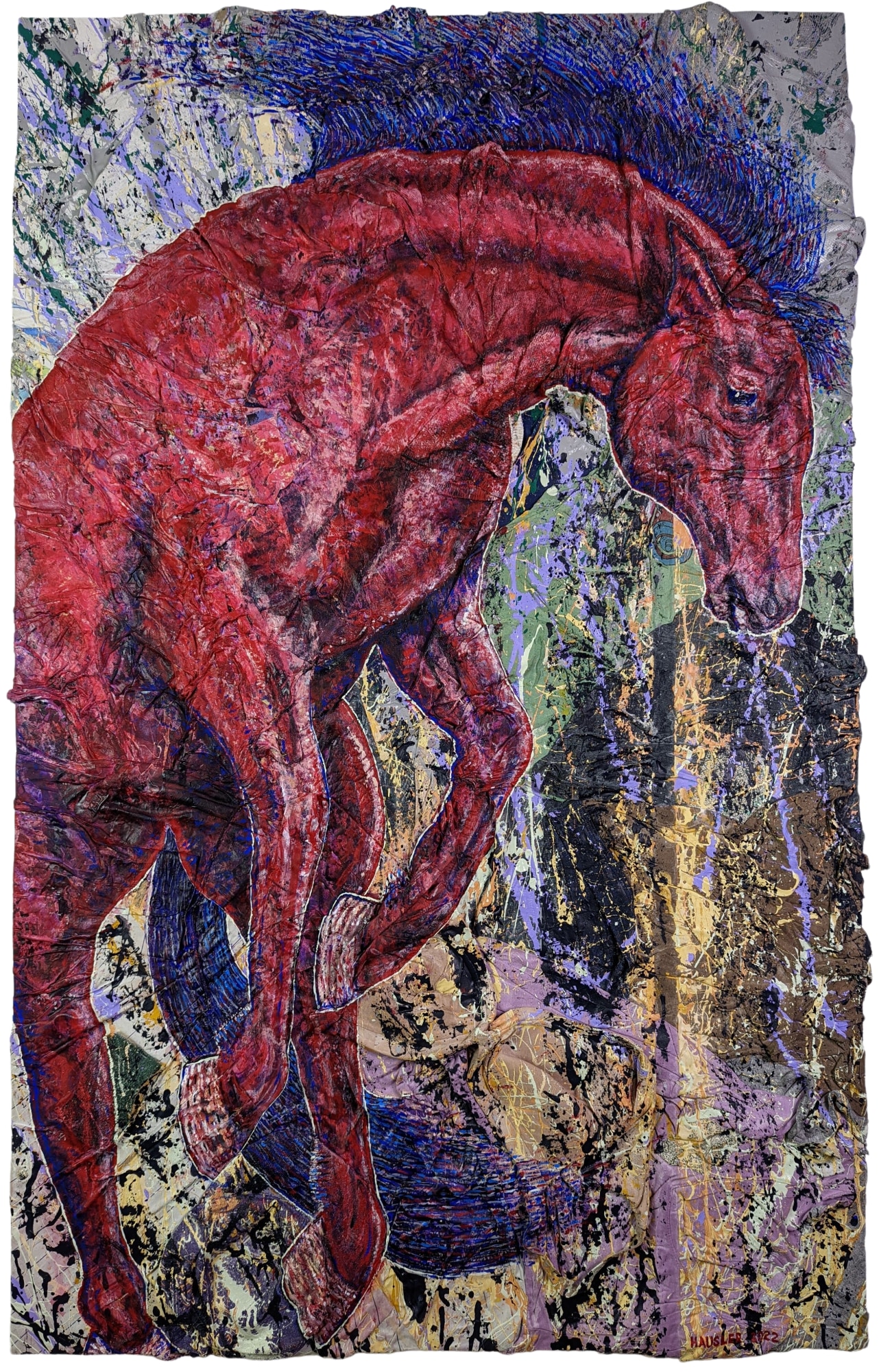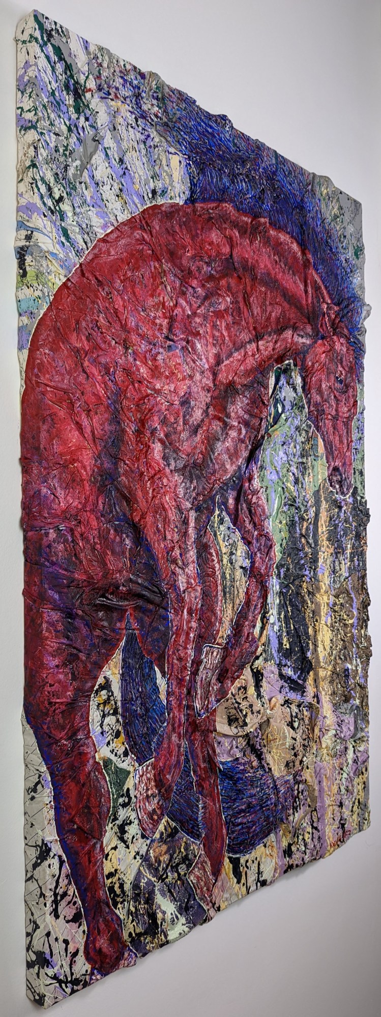 The blood red creature is my representation of intense pent-up emotions finally being released. Even in the close-up details you can sense unrestrained energy. The clothing and objects that I have painted on provide literal depth, the splashes of paint convey chaos, the bright colors of the horse amplify the energy. All these things combined help to describe an emotion gone wild, furious.