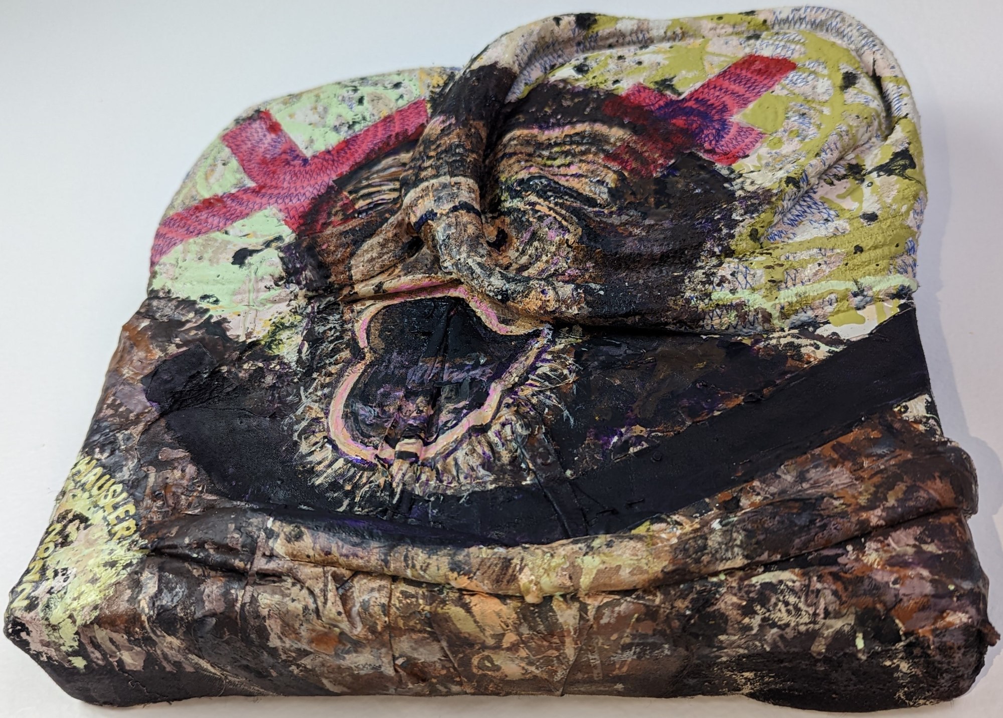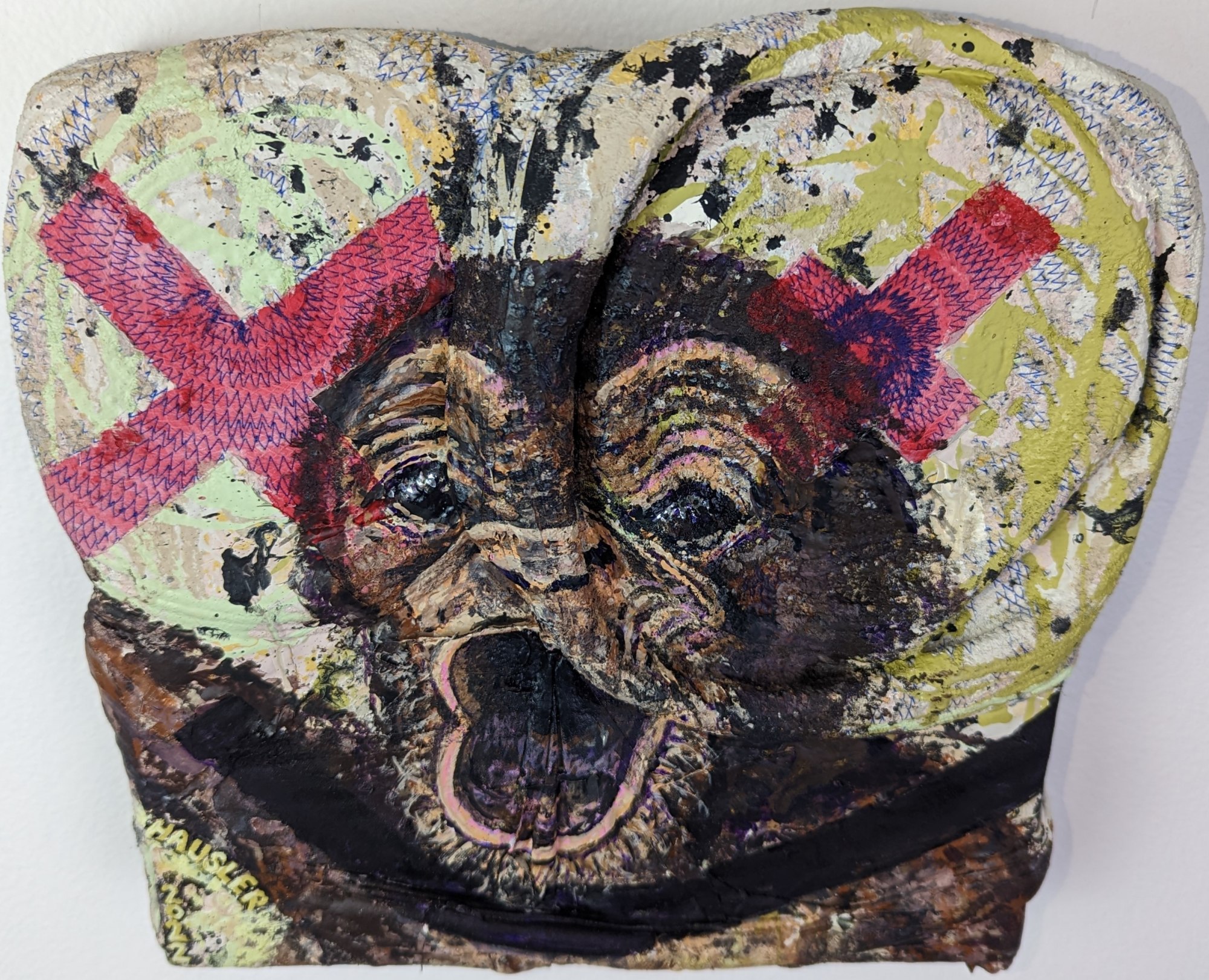 This work is on my wife’s fabric scraps and two rope baskets that she made. When I built the canvas, I immediately saw a face in it but I didn’t want to paint an easy cartoon-like face on it. As I was researching ideas, I came upon an image of a rescued orphaned baby chimpanzee that just made me smile. It turns out that the baby chimp was so happy to be rescued that it couldn’t stop smiling; a perfect image to interpret on canvas! The goofy face that I saw when I created the canvas I felt needed to be included as well so I superimposed the two images together. It reinforced the “happy” for me. This is one of the series of thirteen small paintings that I have been challenging myself to complete faster. I have already been embracing my native sloppy personality by leaning into my messy style of painting and this is a great example of that. I’ve discovered that I am capable of creating an identifiable image without having to beat myself up attempting to paint in a painstakingly precise photorealistic manner. As much as I enjoy many hyper photorealistic works, I do not enjoy emulating that process. I want to not only create works that bring joy but I want to be more joyful in creating them. This is a perfect example of what happens when I create in a joyful space.