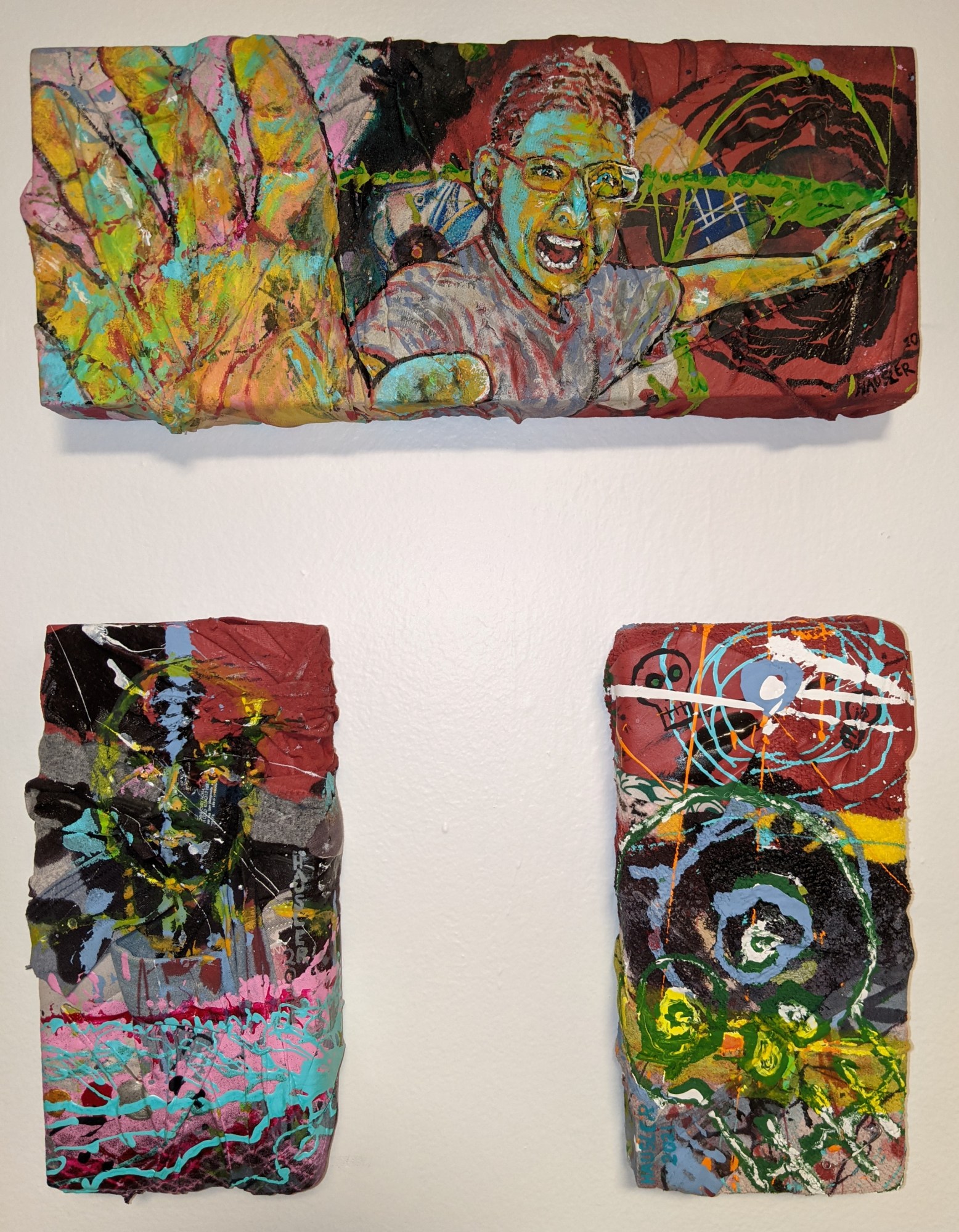 “ENOUGH!”, 16.51cm x 36.83cm (6.5" x 14.5"), Mixed Media (latex and acrylic paint on clothing and quilt fragments), 10/13/2021 - Greg Hausler