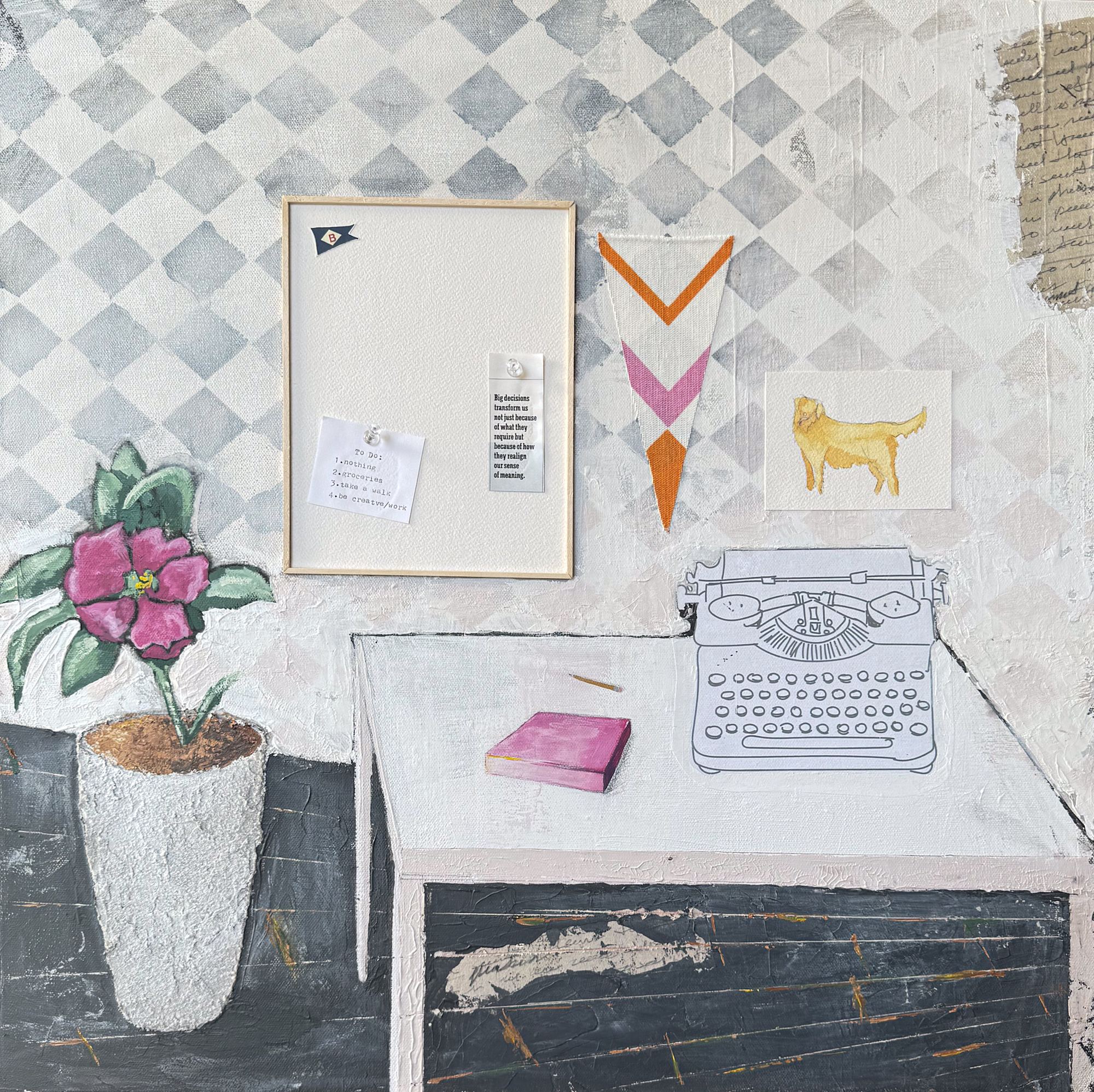 Acrylic, wood, paper, graphite, and fabric on canvas