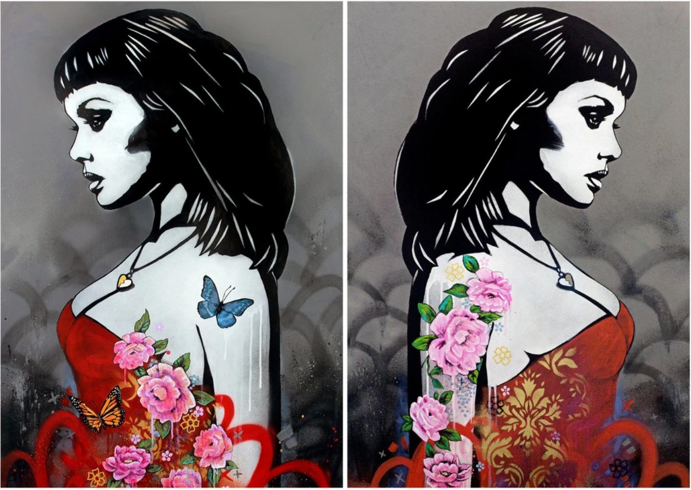 Over the last decade Copyright has been invited to show his work worldwide, including sell out solo shows in London and Tokyo. Most recently his Precious Damage show which saw him sell all 50 works in 3 hours. He was asked to design the cover of Reload Magazine to go alongside a feature about his art, as well as pieces in Harpers Bazaar, Teen Vogue and Modart, amongst others. He was featured on Series 8 of the BBC show ‘The Apprentice’ in May 2012 after being selected by the contestants as part of a task based on street art. His highly stylized work and unique style has proven popular with both national and international collectors including a number of celebrities and Premier League footballers.