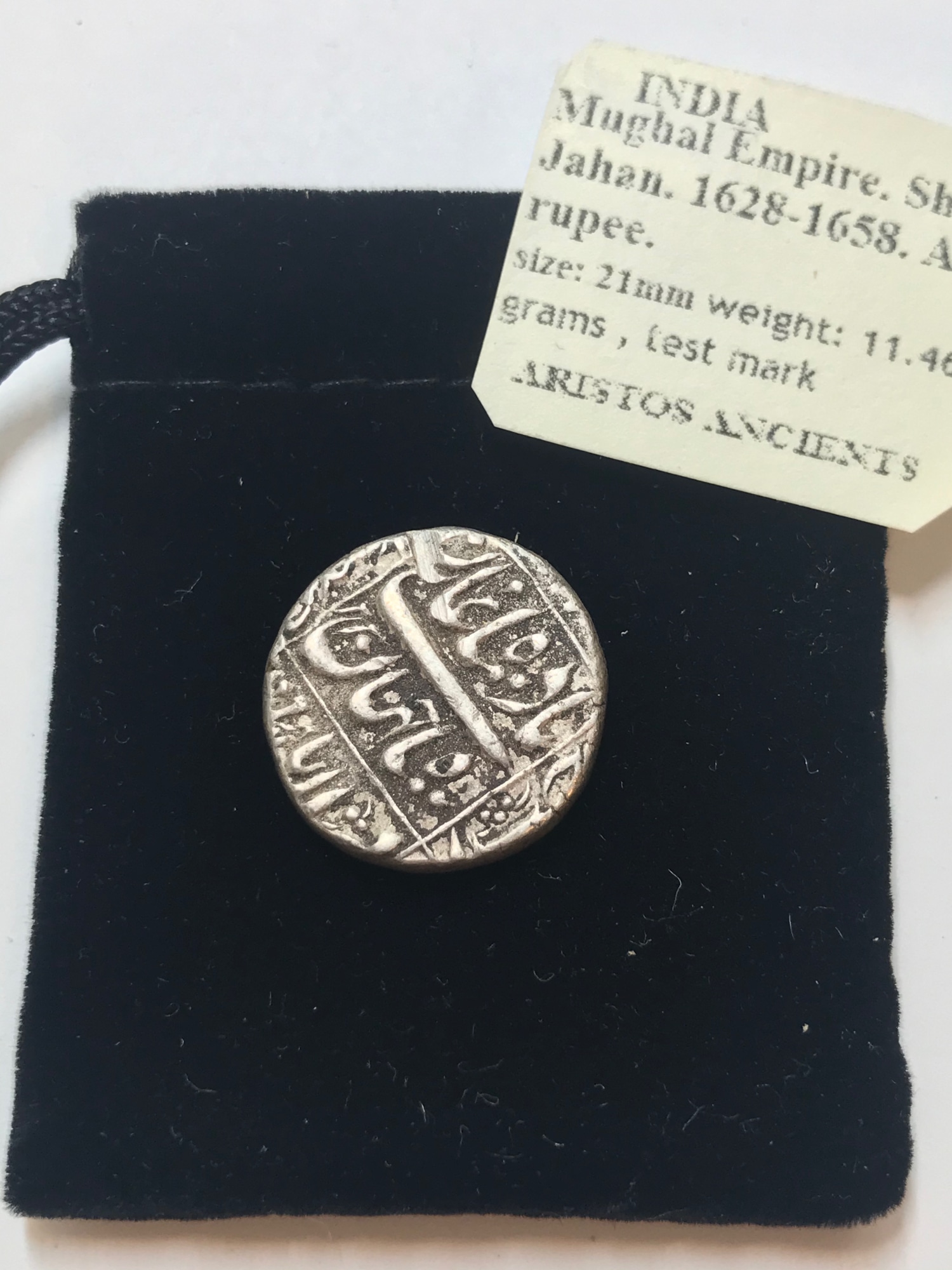 Silver rupee of Shehab-ud-din Muhammed Khurran, also known as Shah Jahan ("king of the world"), who ruled Hindustan from 1628-1658 at the height of the Mughal empire. He is best known for his architectural endeavors, including the Taj Mahal, which he dedicated to his wife.